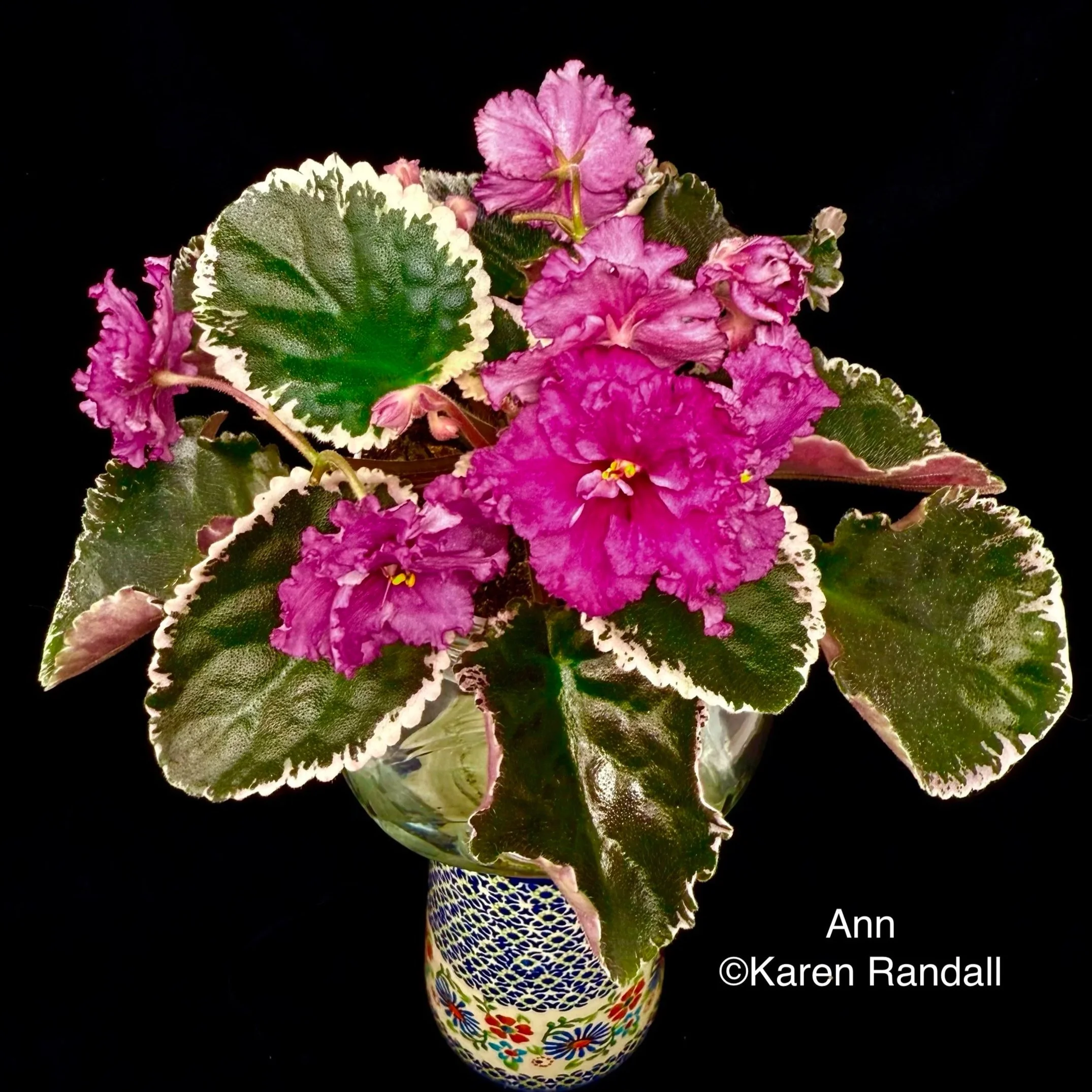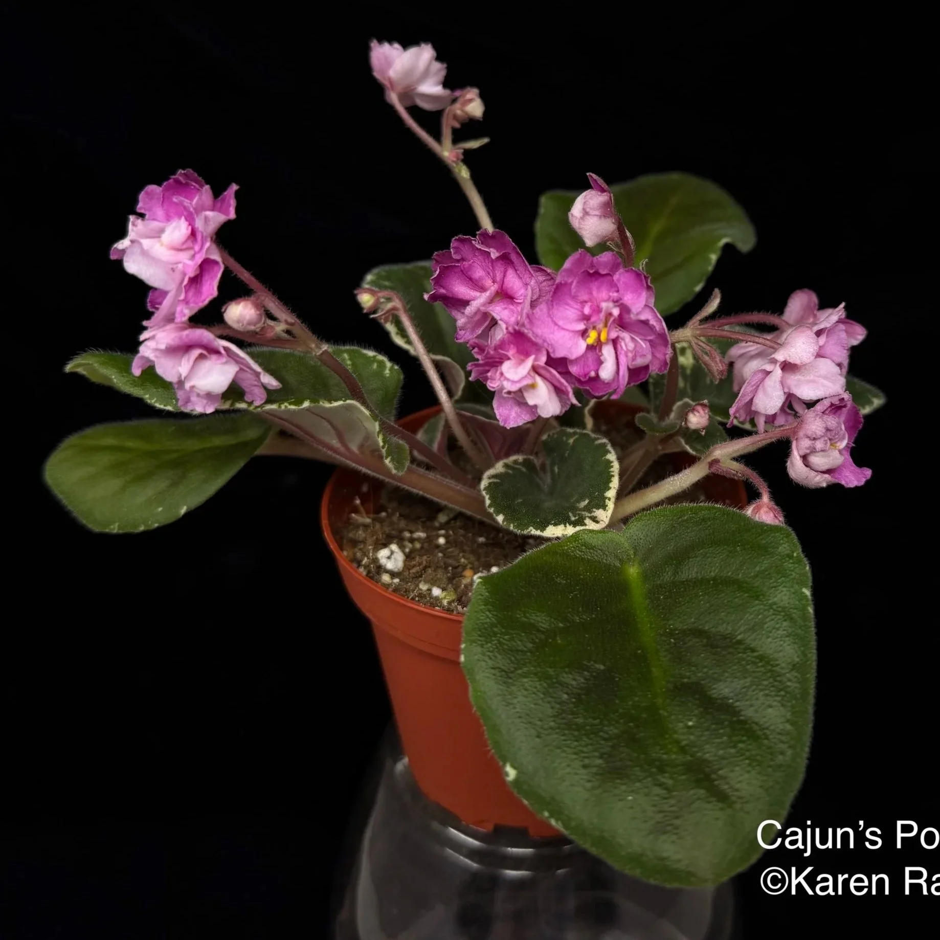 Sdbl. pink pansies with lots of white puff fantasy. Round, dark, red-backed foliage. A larger growing semiminiature. Very unusual bloom, good bloomer, fairly stable. (Muzalewski)