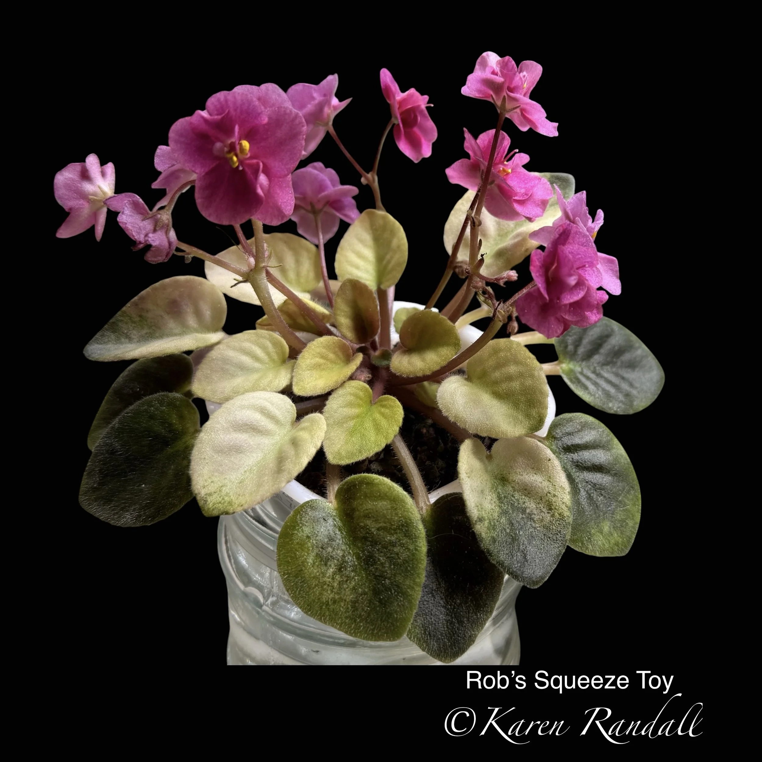 Rob's Calypso Beat Large bright pink pansies dotted with purple fantasy. Medium dark foliage. Semiminiature. (R. Robinson #8169)