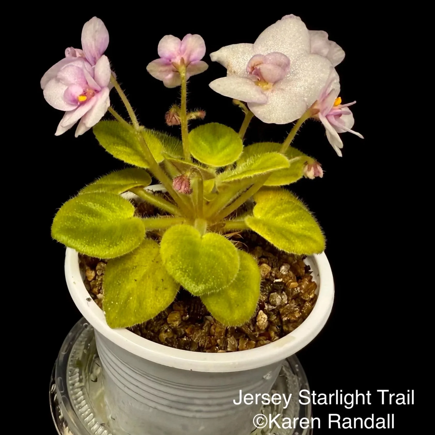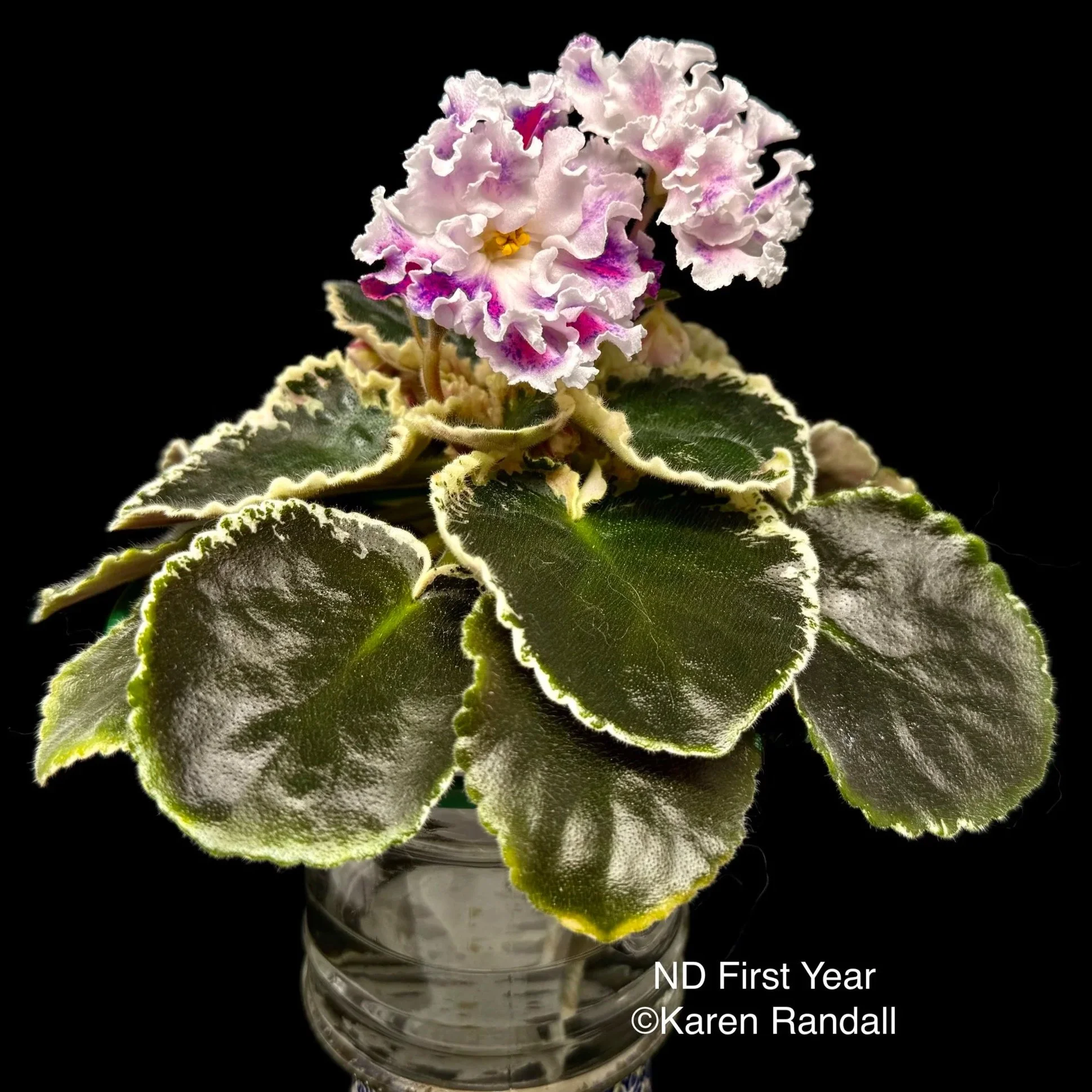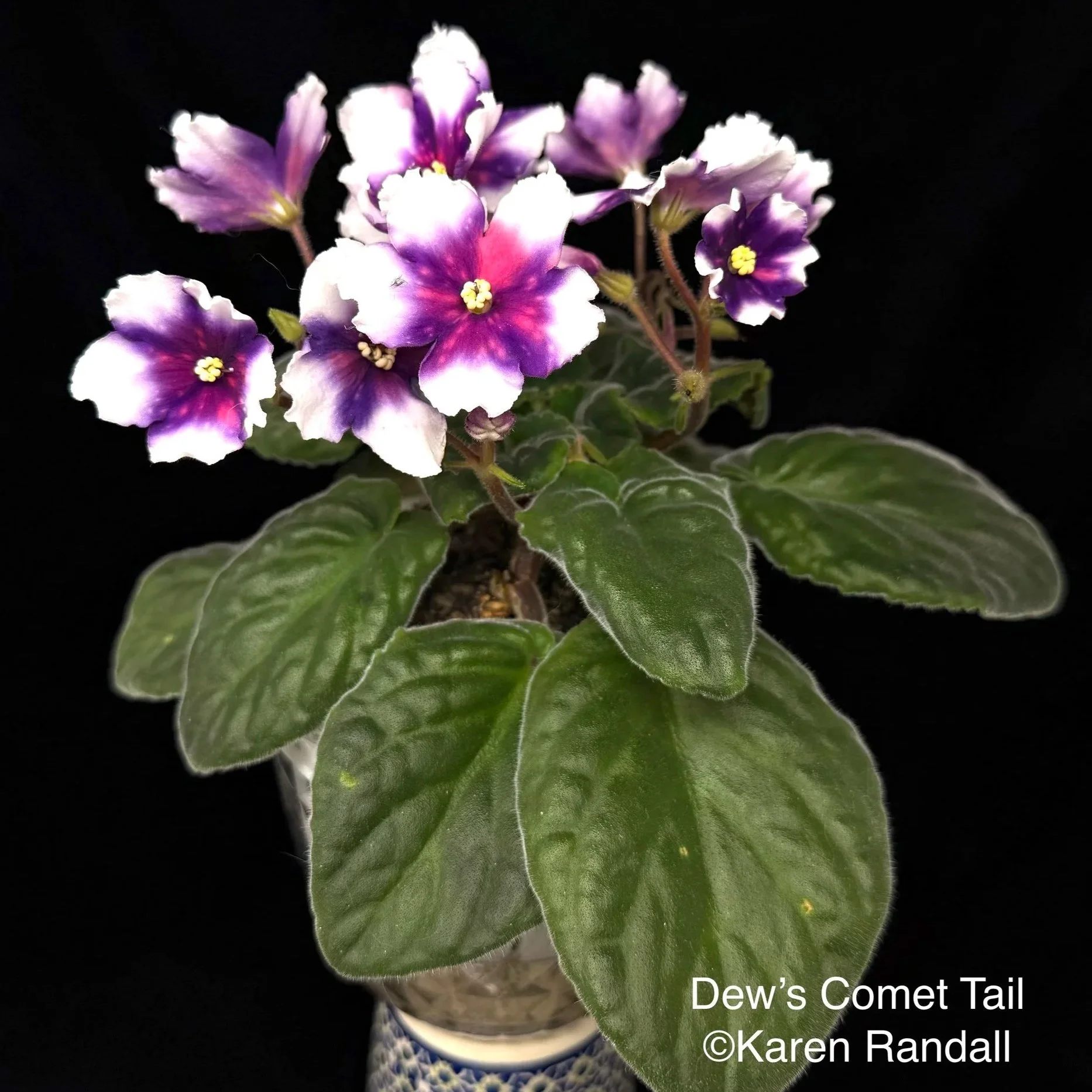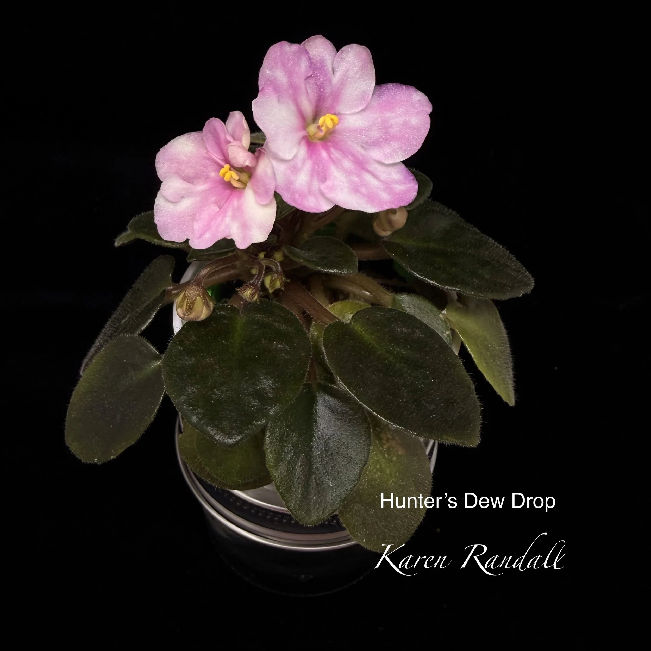 The description on the Dew Violet website when I bought it was: “Single white star with light blue thumbprints splashed with pink puff fantasy markings. Foliage - Medium green. Miniature.”