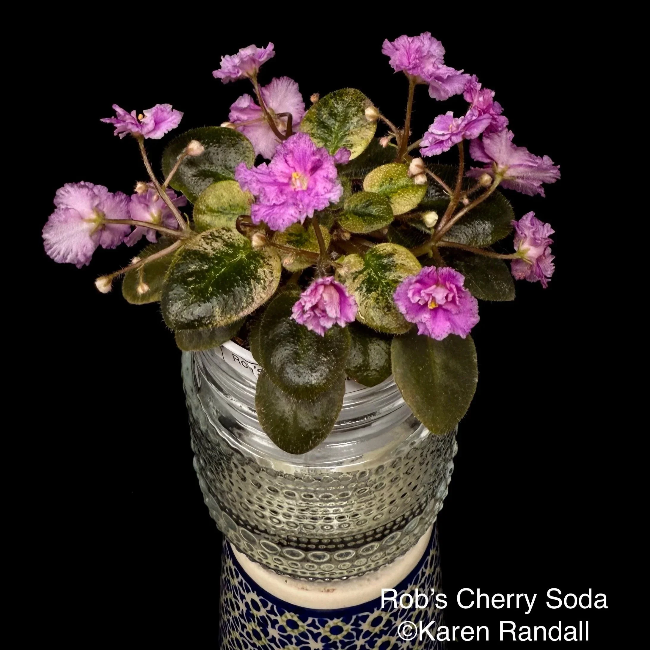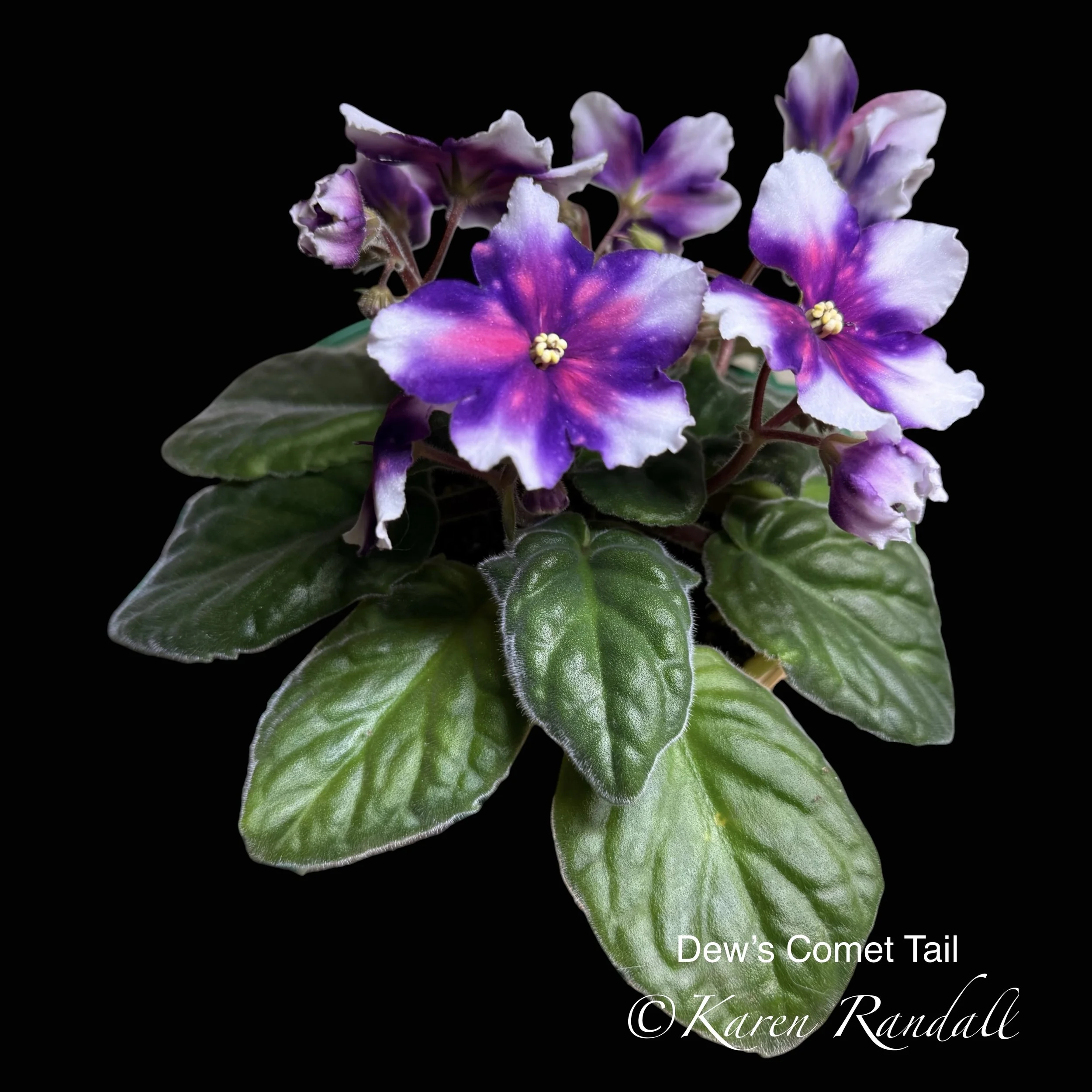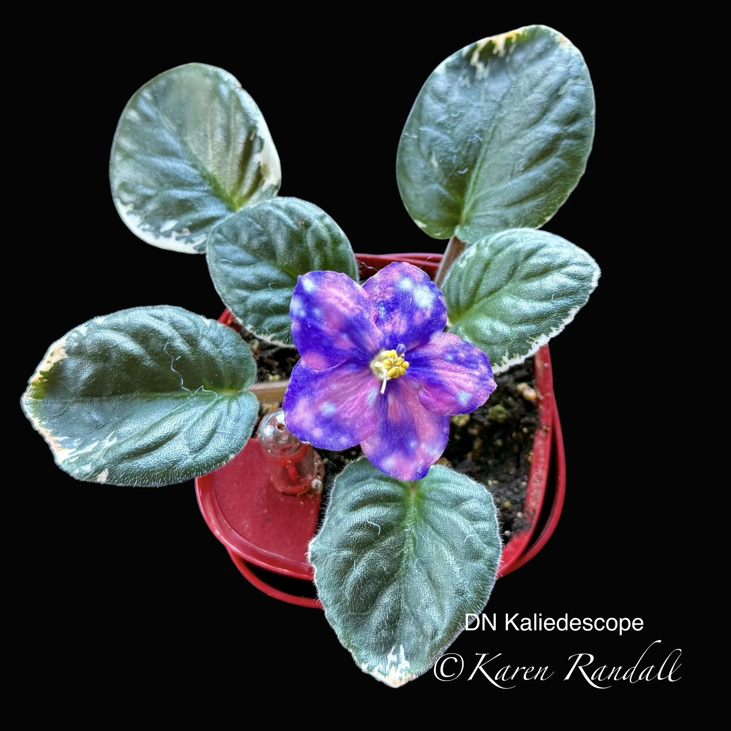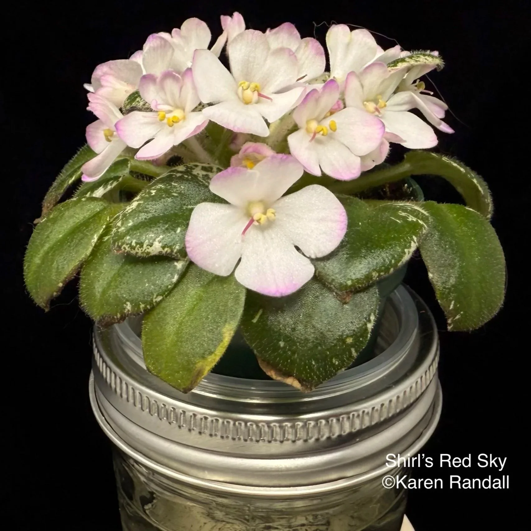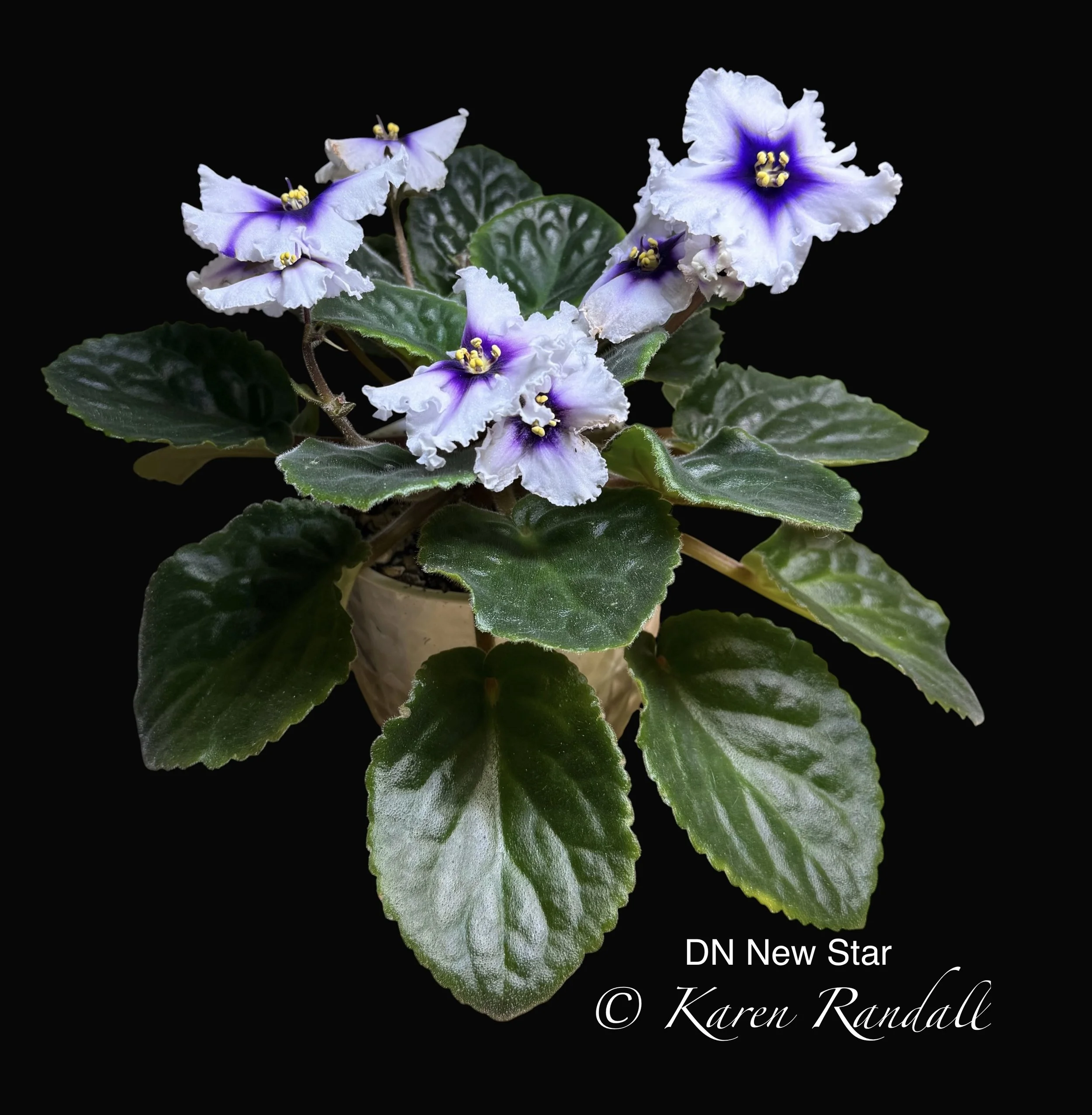 The description on the Dew Violet website when I bought it was: “Single white star with light blue thumbprints splashed with pink puff fantasy markings. Foliage - Medium green. Miniature.”