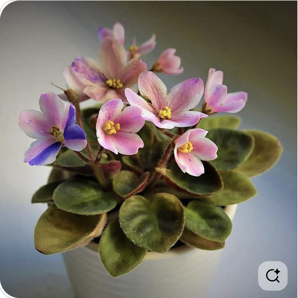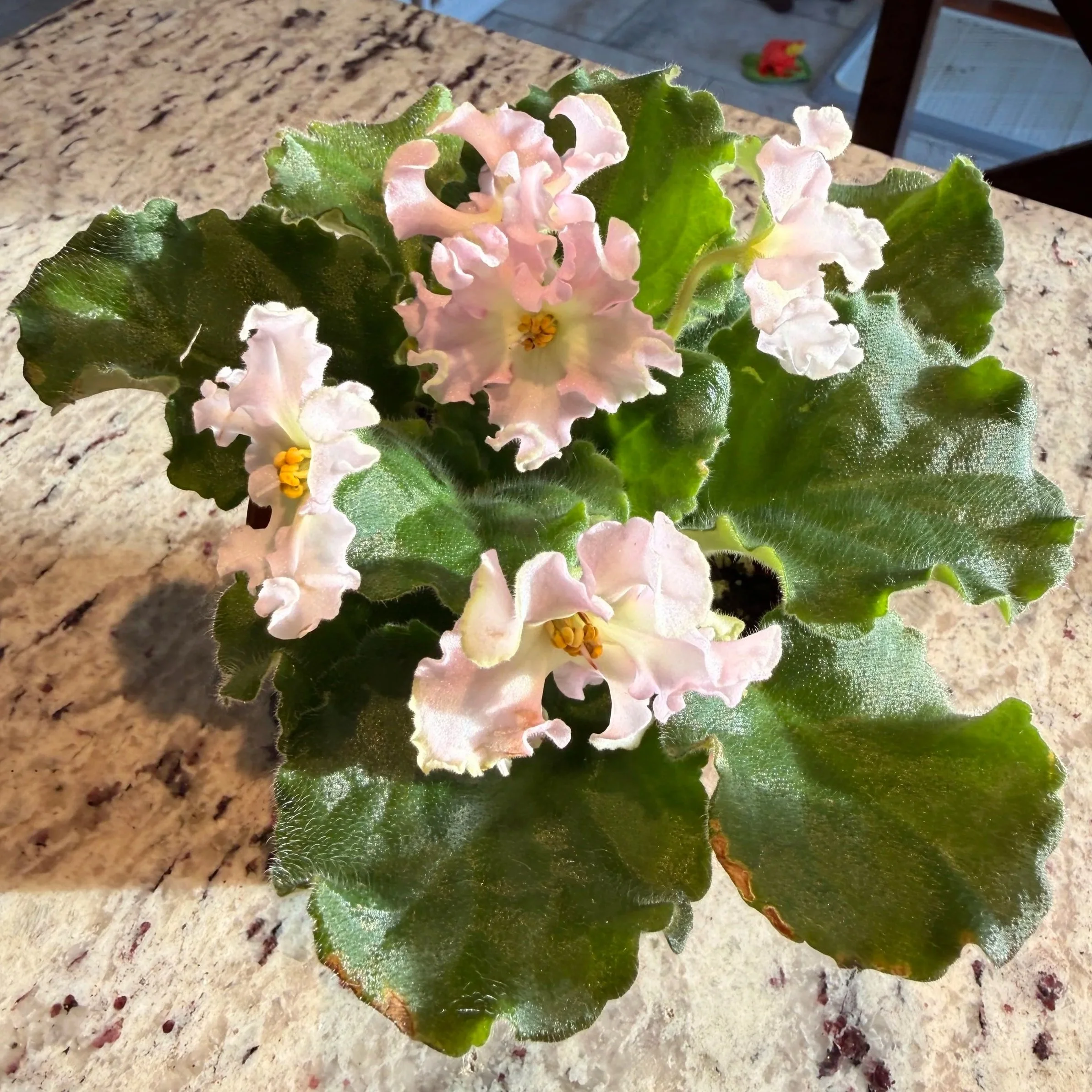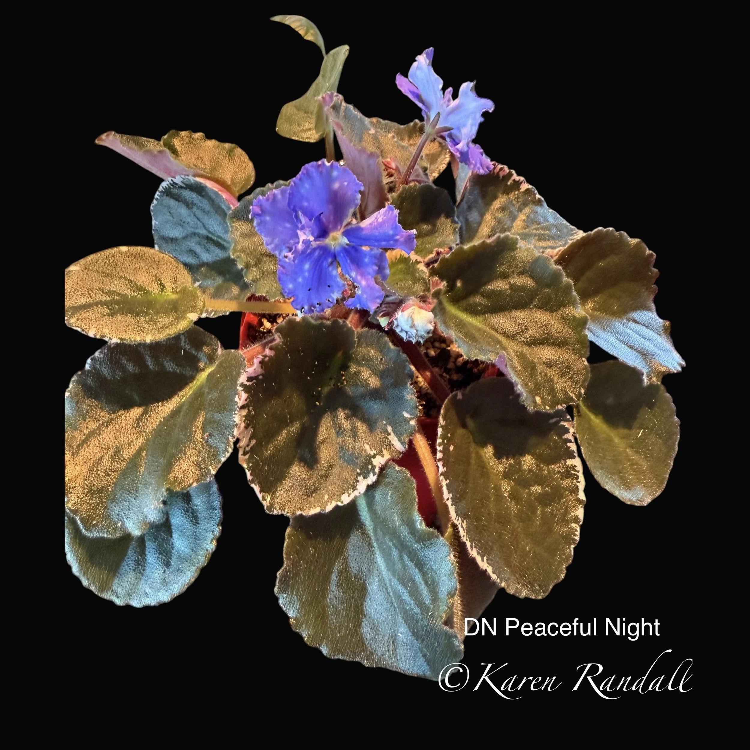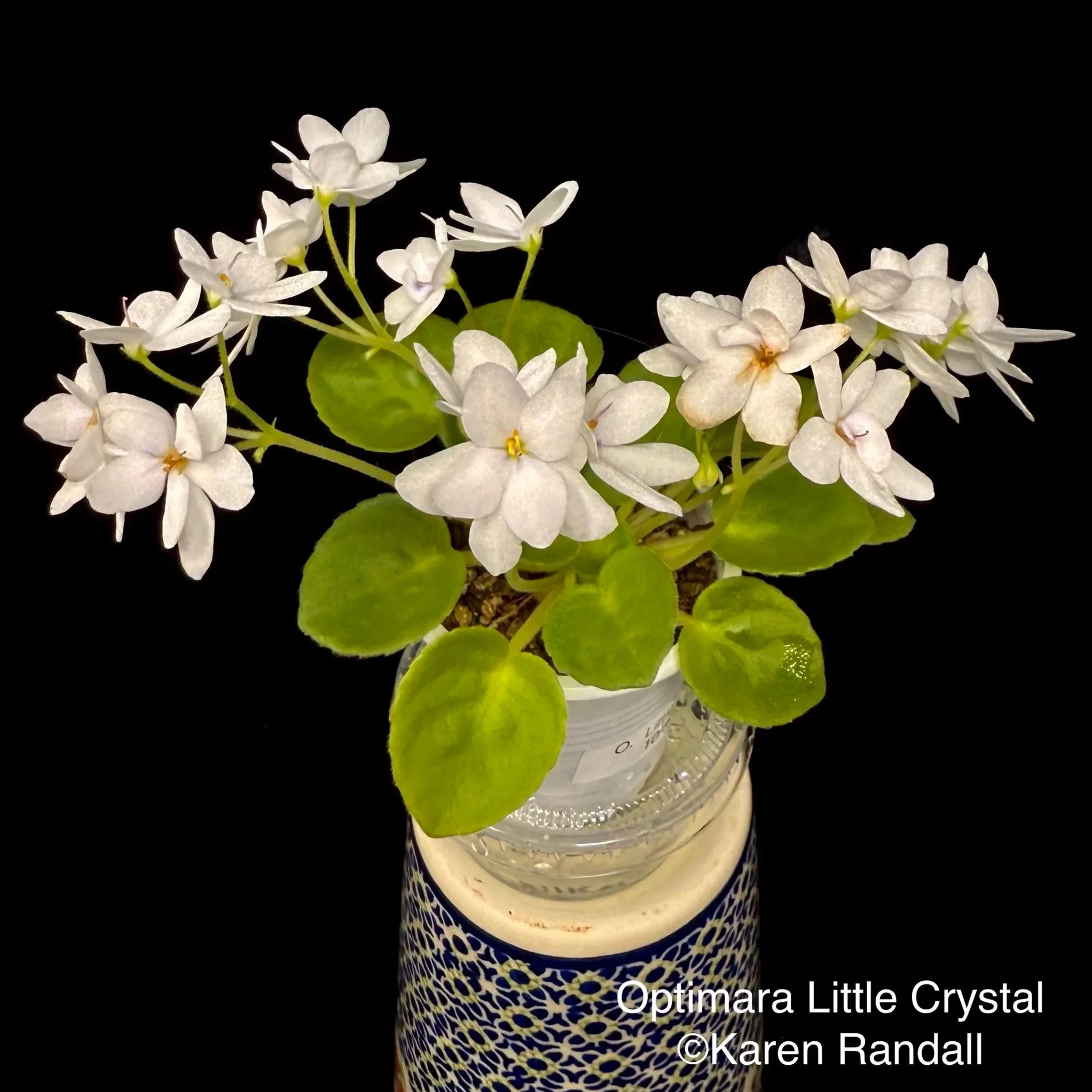 The description on the Dew Violet website when I bought it was: “Single white star with light blue thumbprints splashed with pink puff fantasy markings. Foliage - Medium green. Miniature.”
