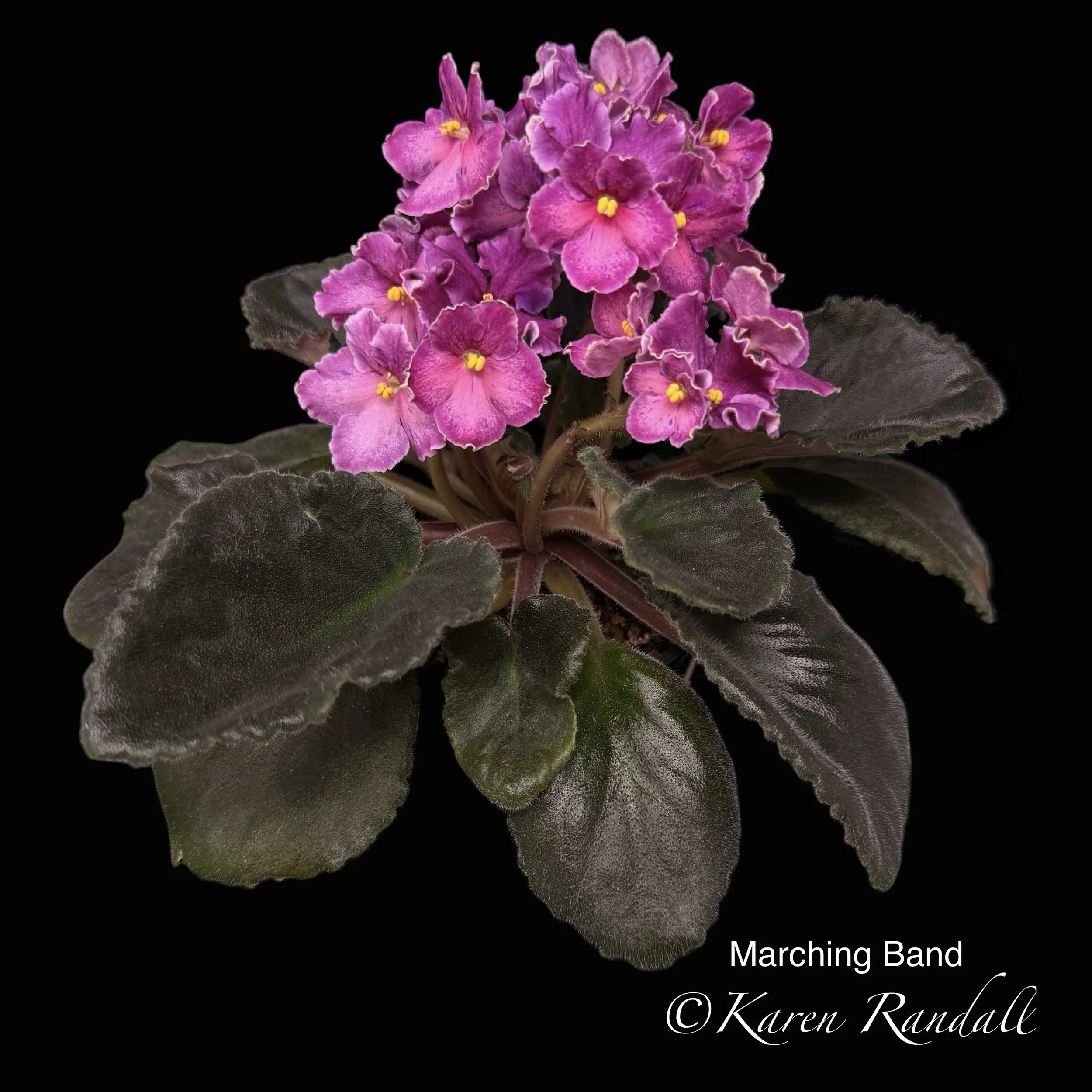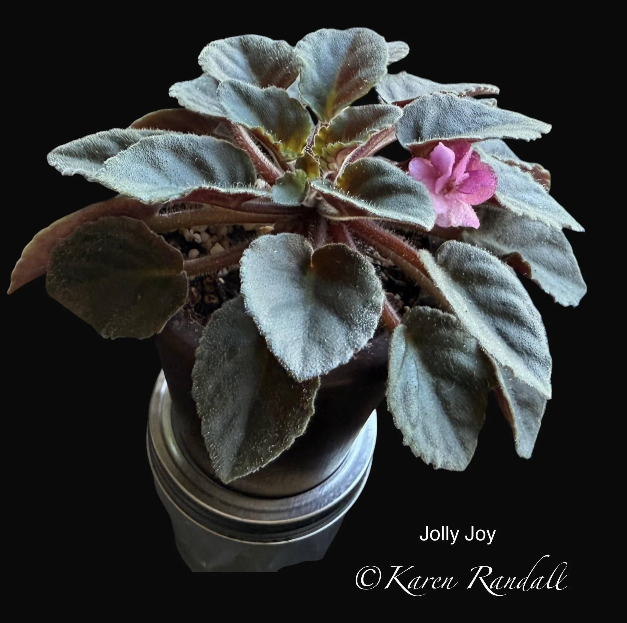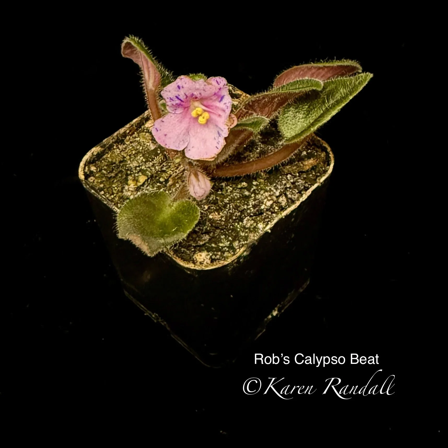 Hybridizer: Holtkamp (Optimara) Semiminiature, Large pink sticktite (non-dropping) pansy blossoms with dark purple fantasy splashes and specks. Dark green, pointed foliage.