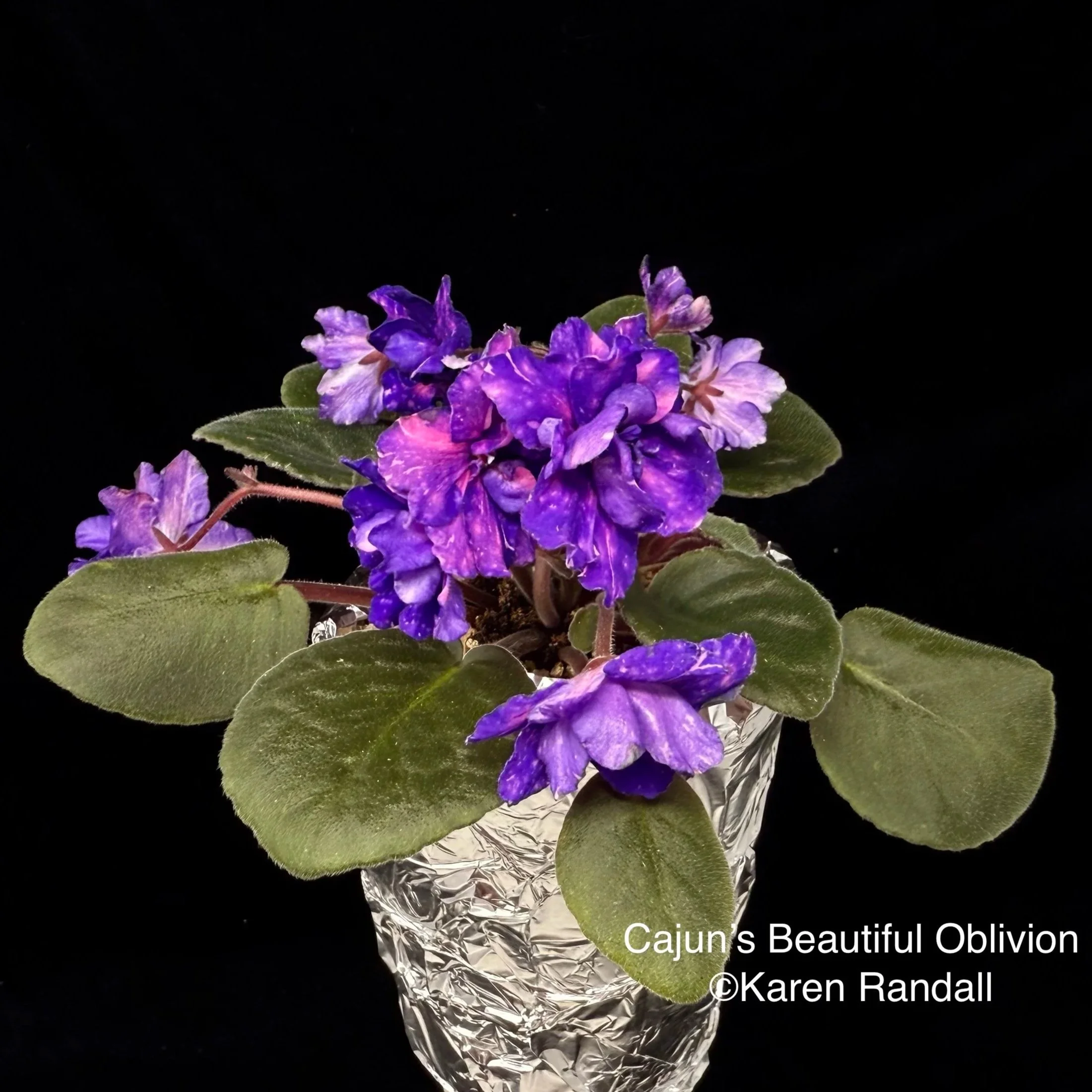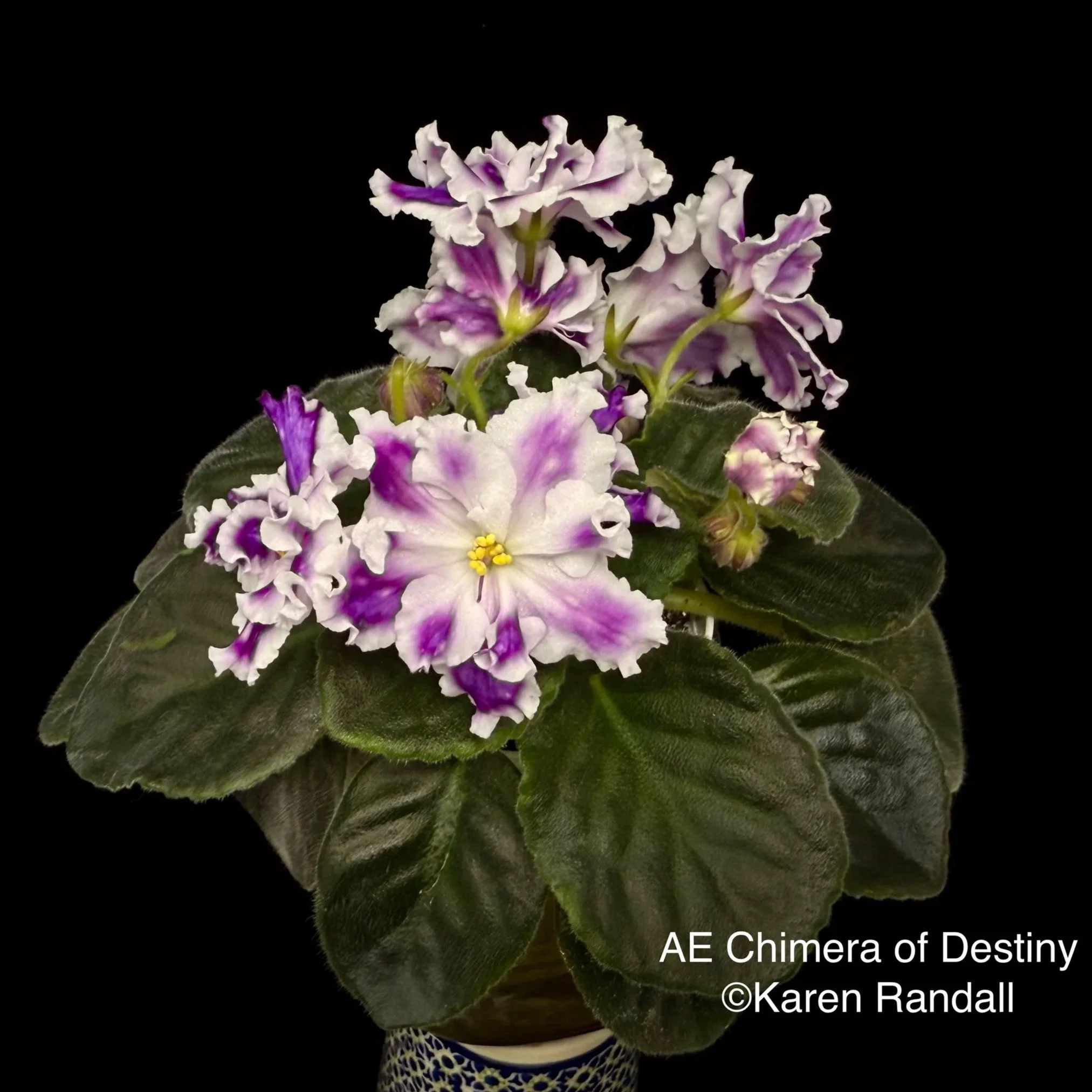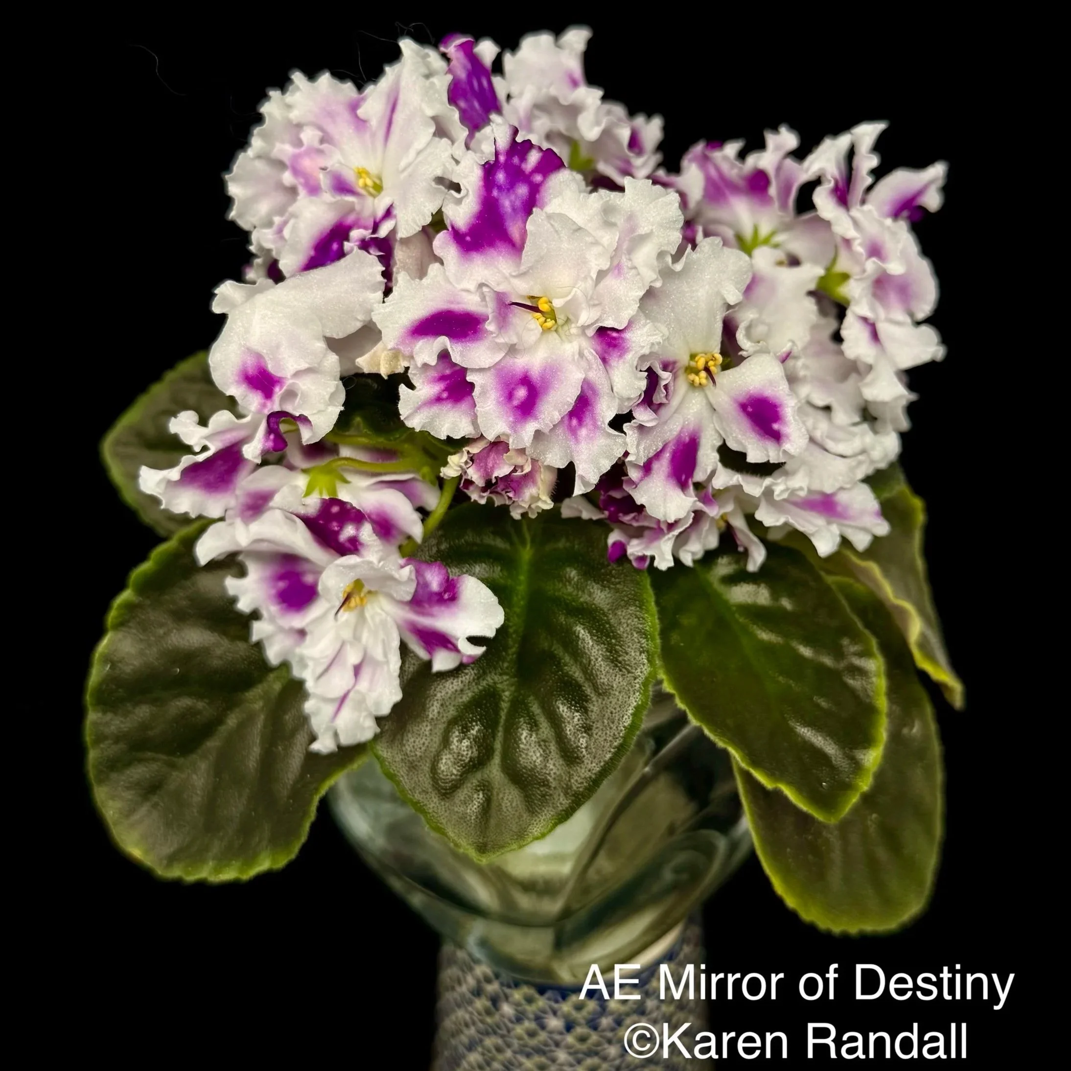 Large full double (almost triple) purple with white mottling. Medium green, tailored, pointed girl foliage. Miniature.