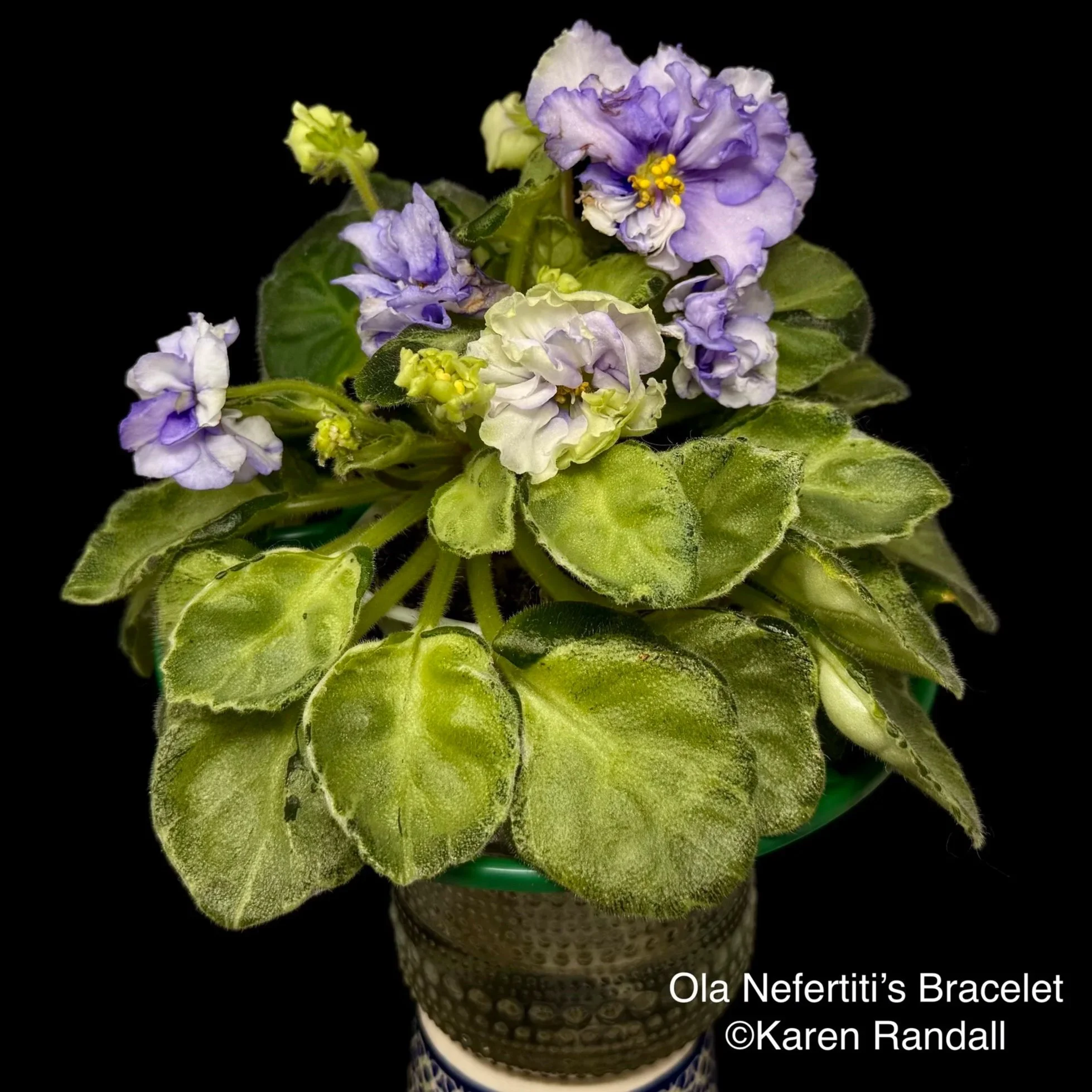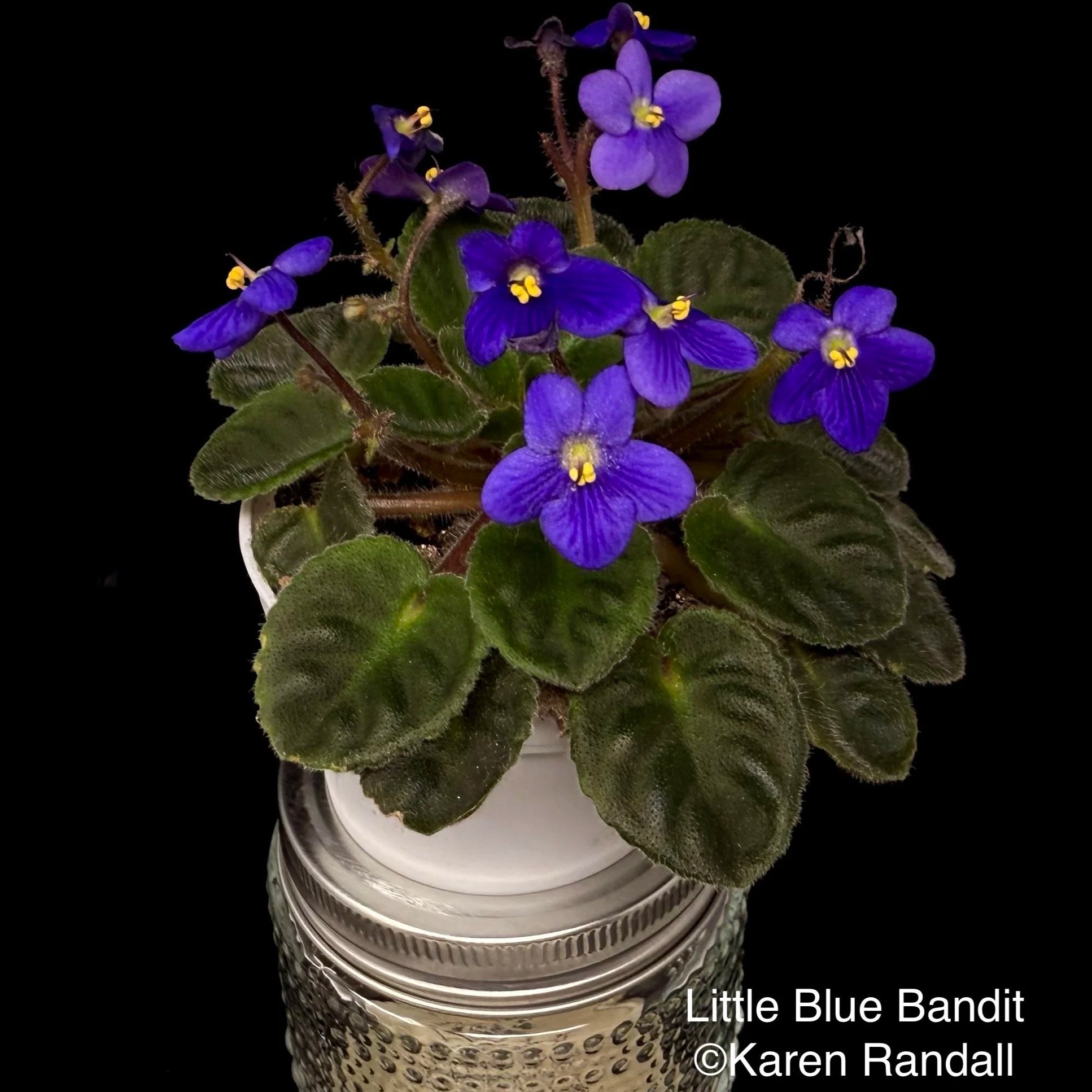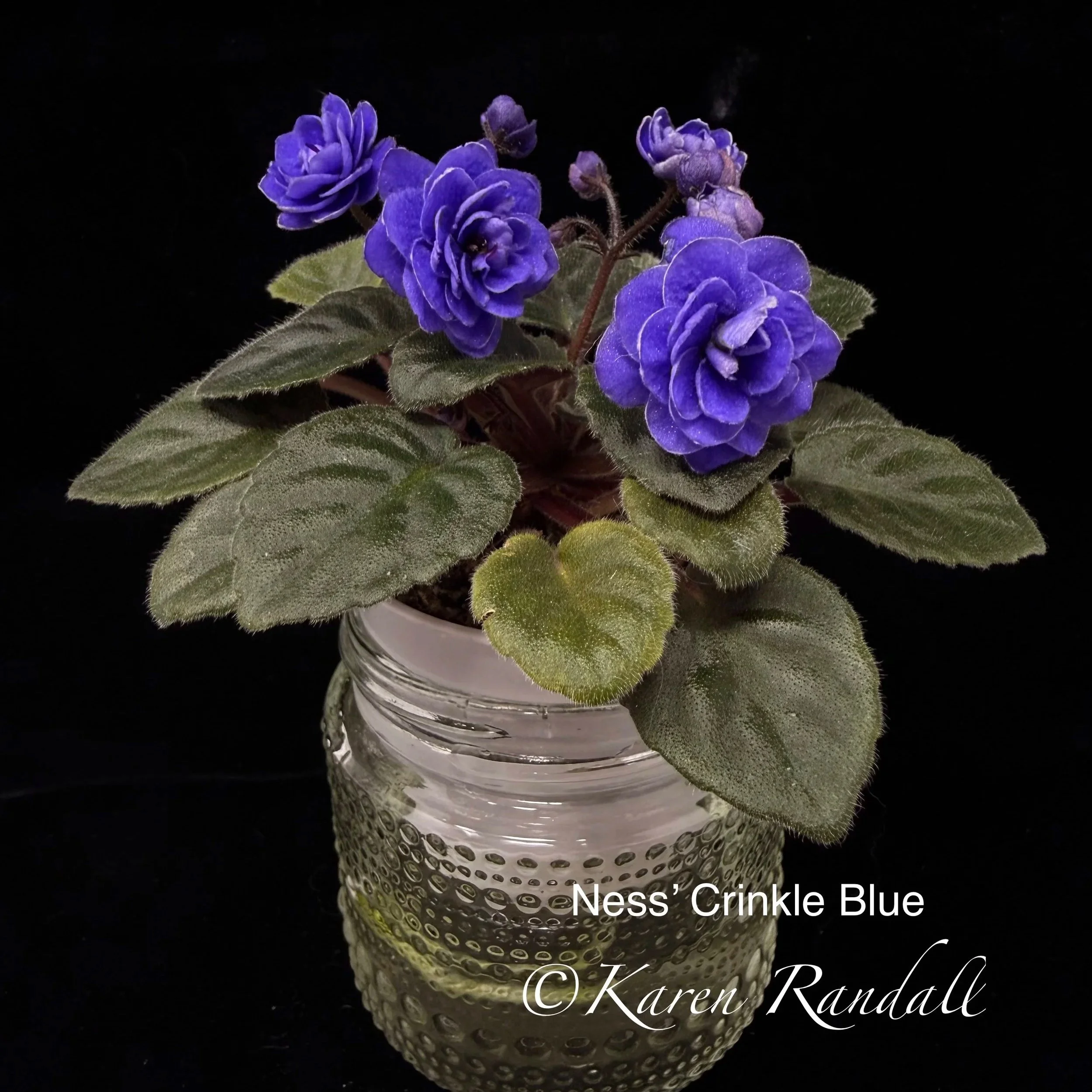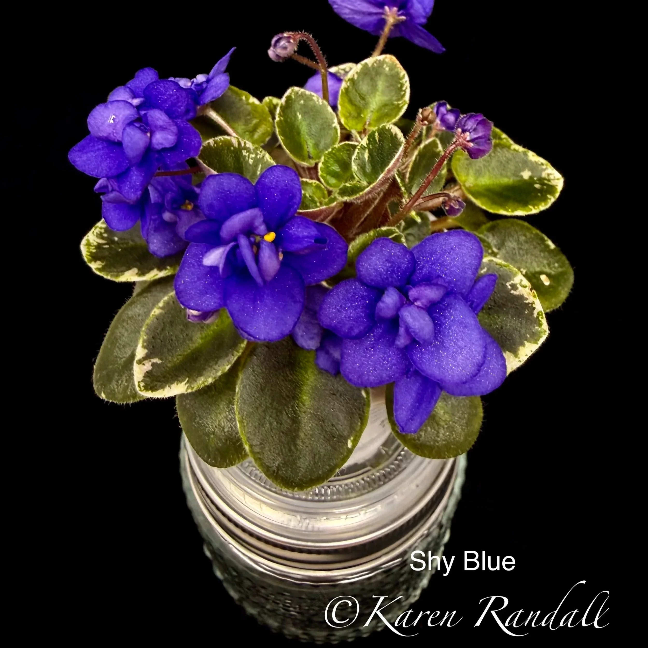 Semiminiature, Wisteria blue blossoms edged in white. Very dark green, tailored, pointed foliage.