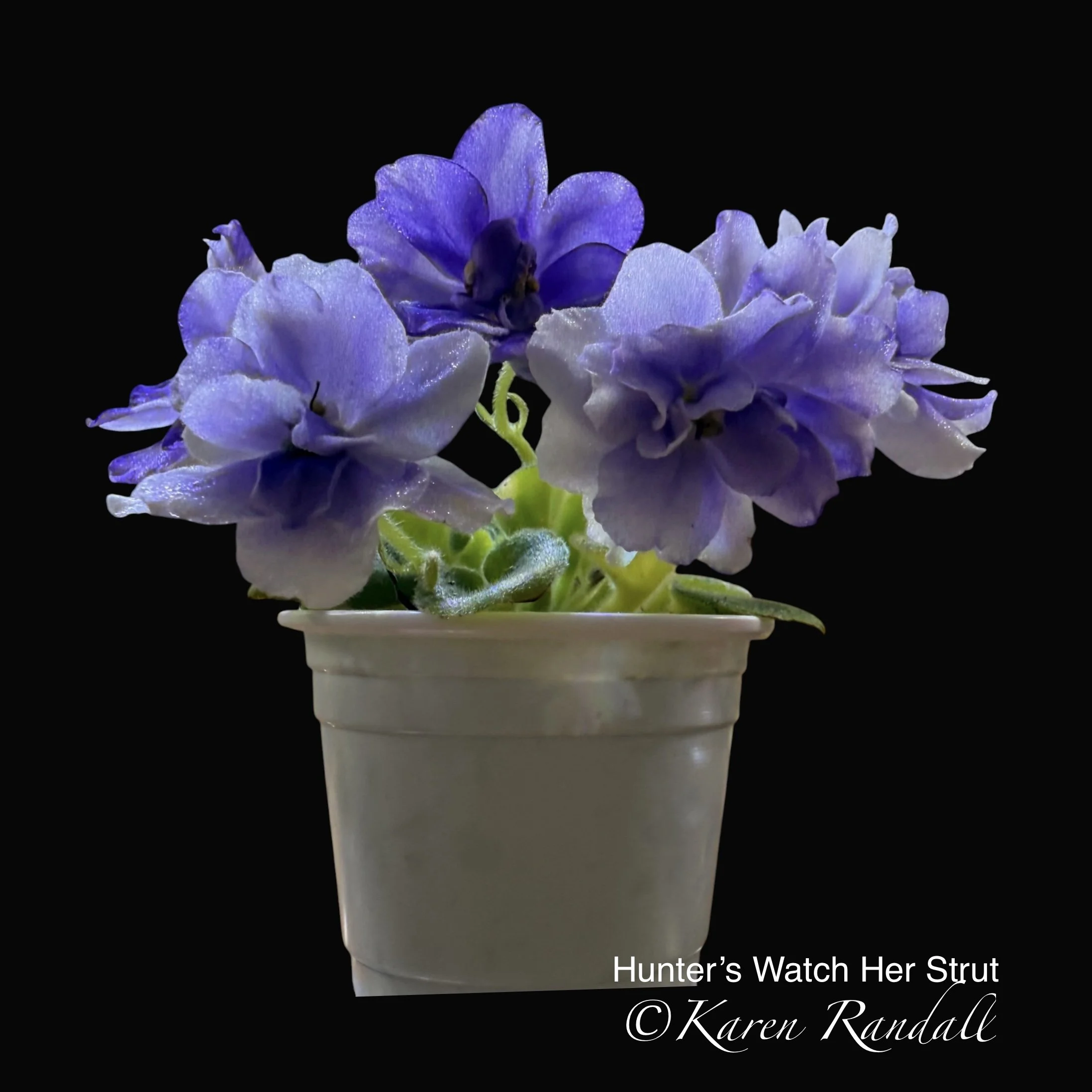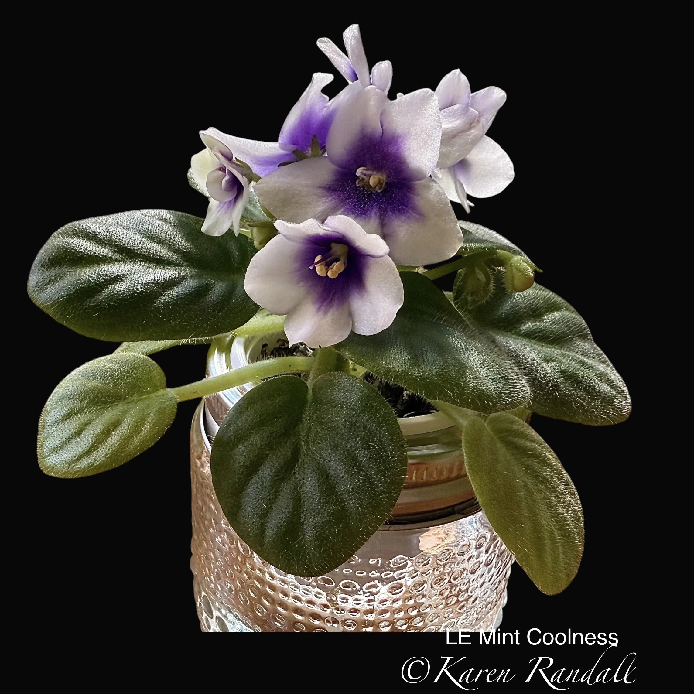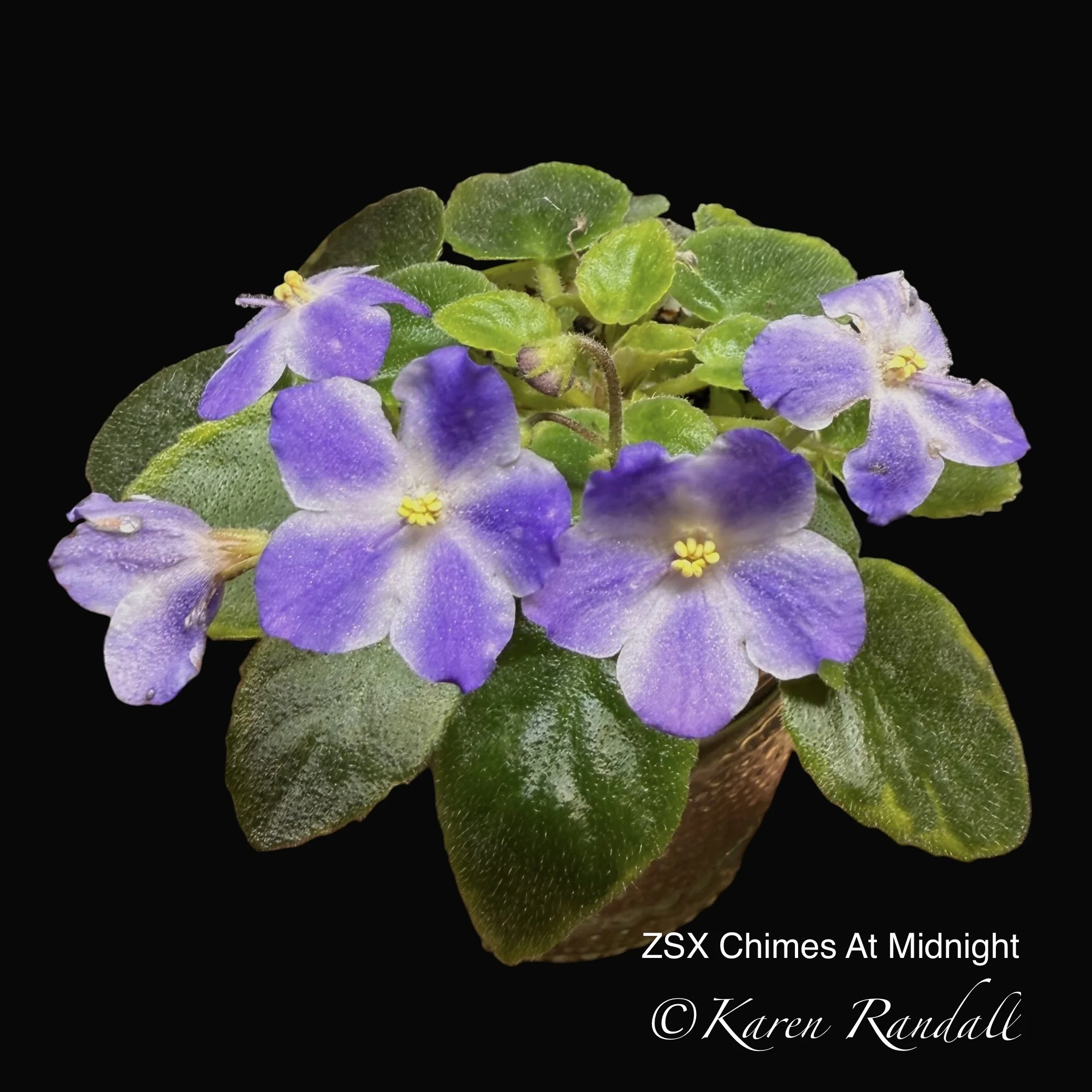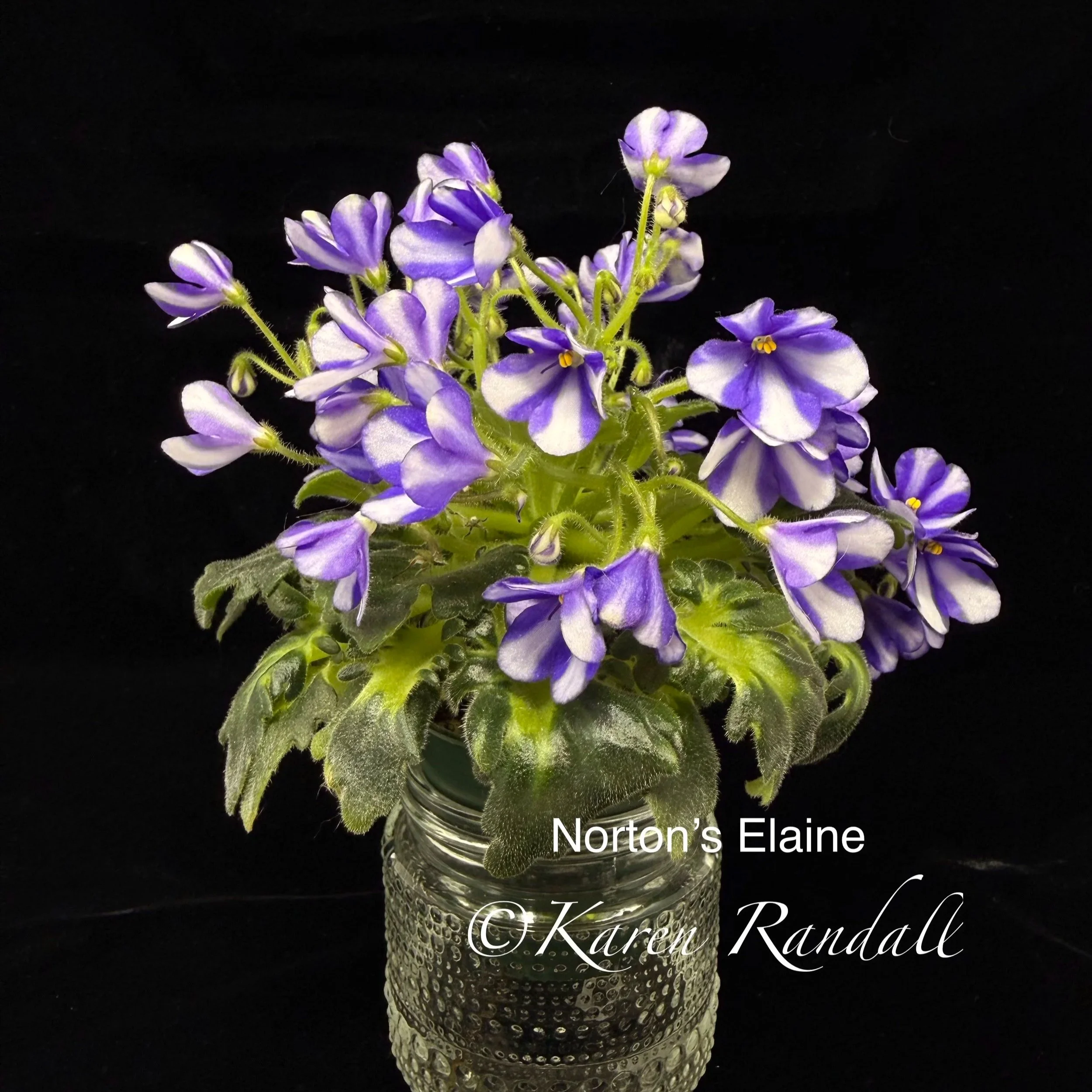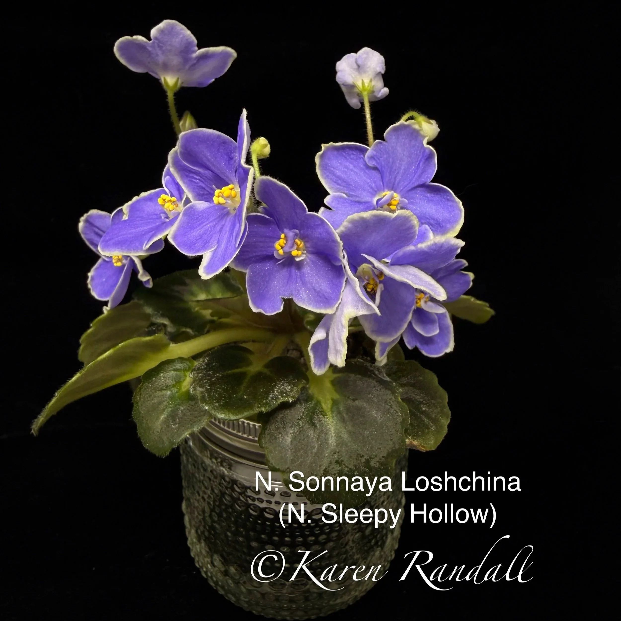 Semiminiature, Wisteria blue blossoms edged in white. Very dark green, tailored, pointed foliage.