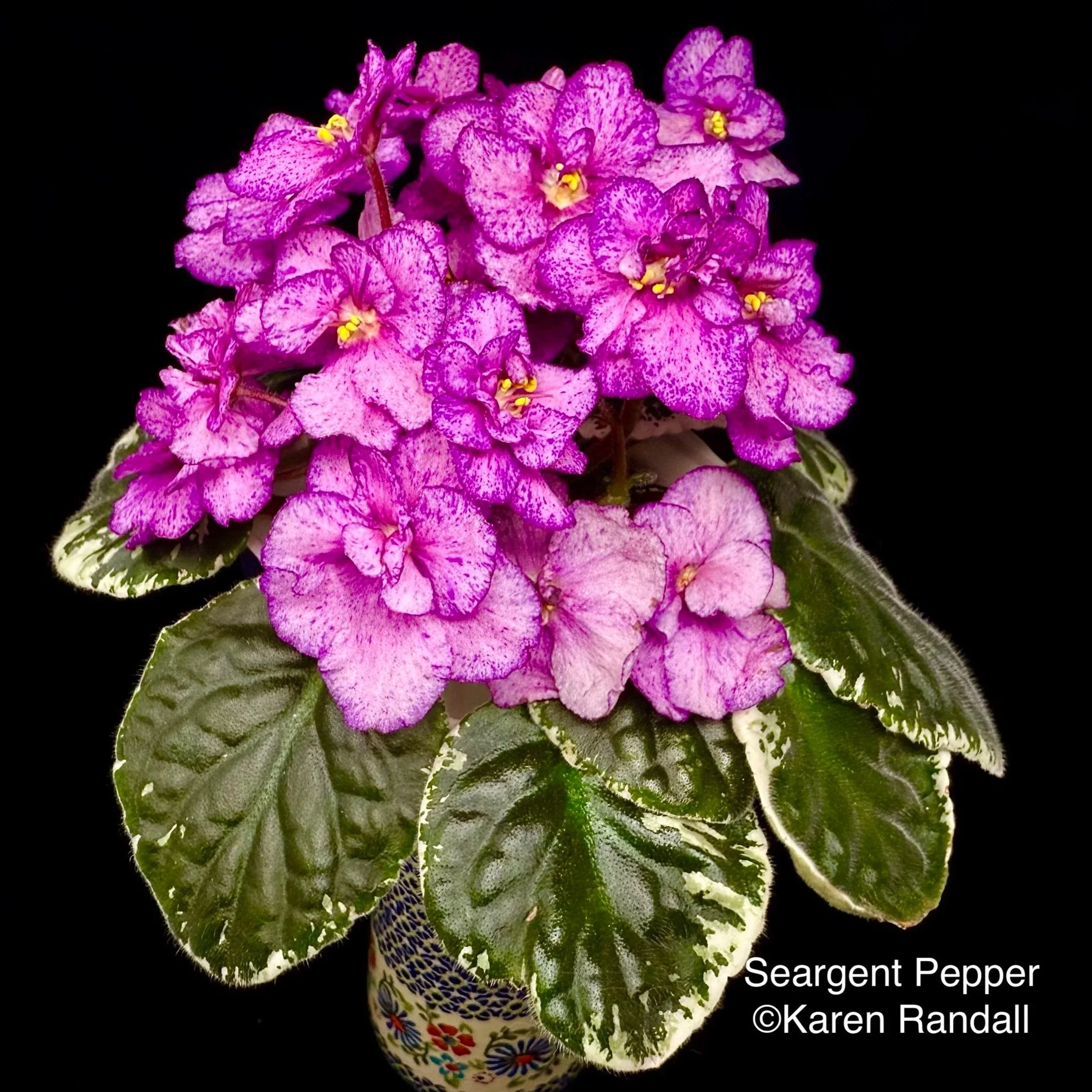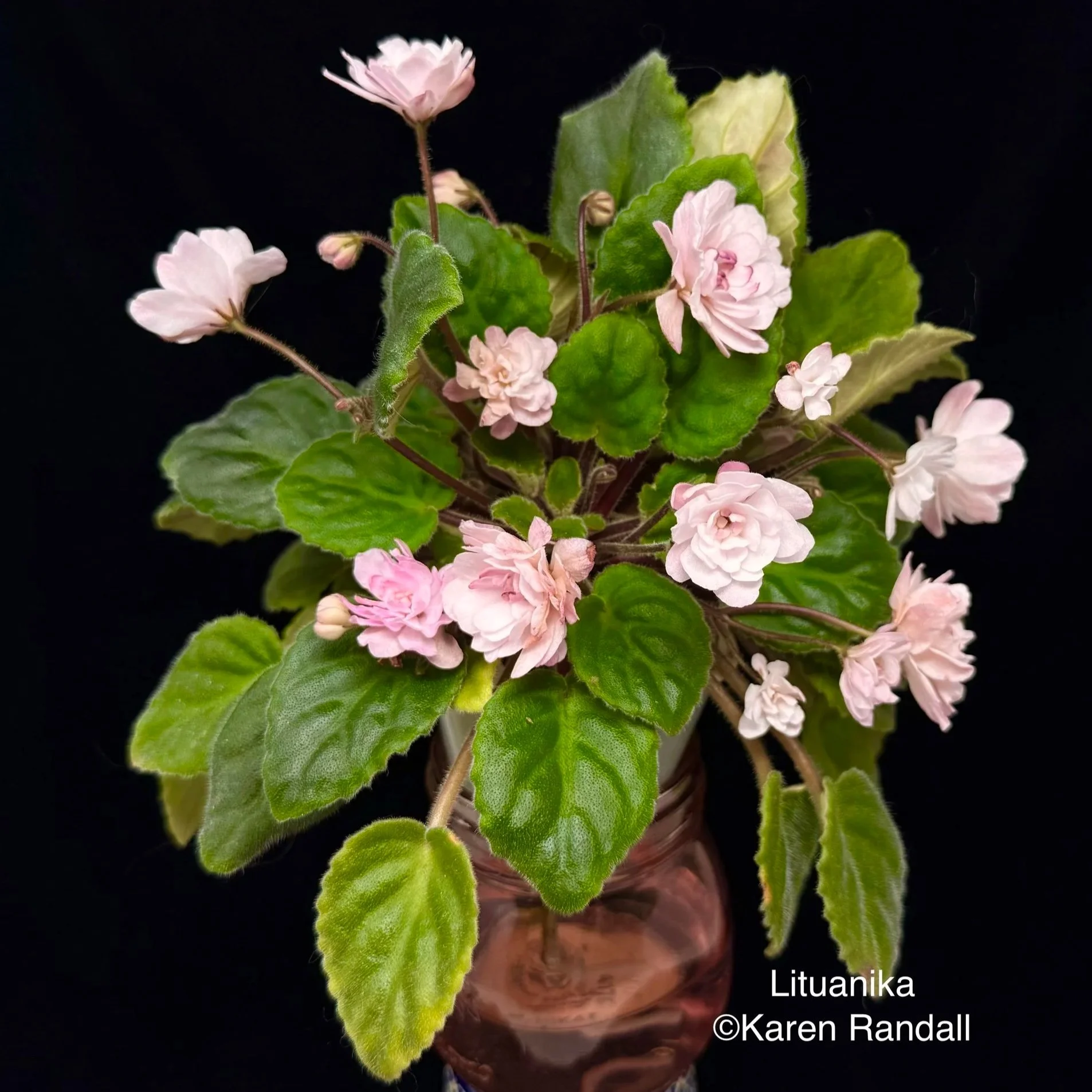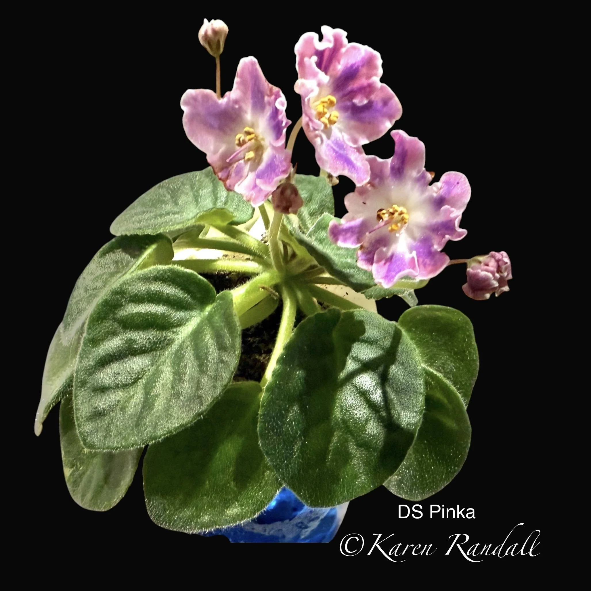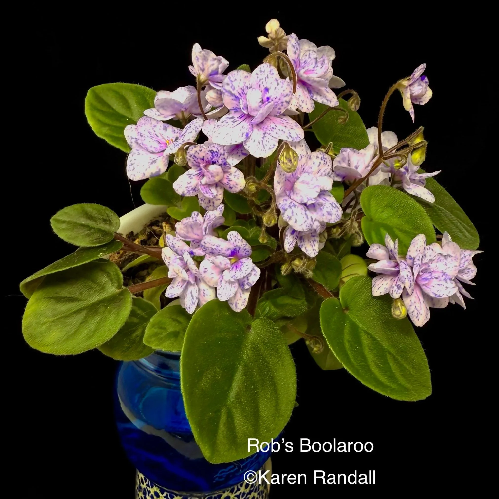“Sparkling double light pink, heavily peppered with blue fantasy.” Constant and heavy bloomer. Semiminiature trailer. AVSA #8053”