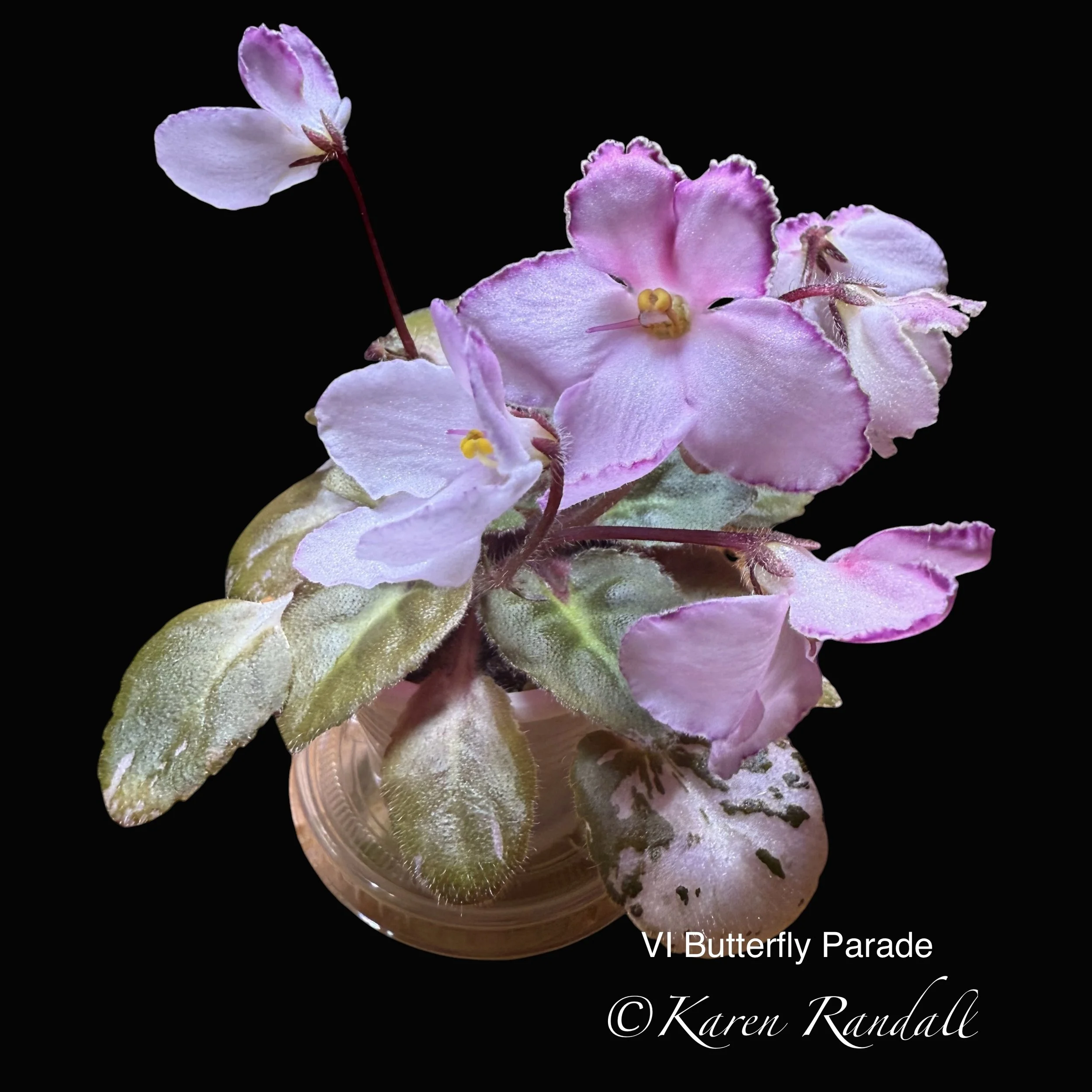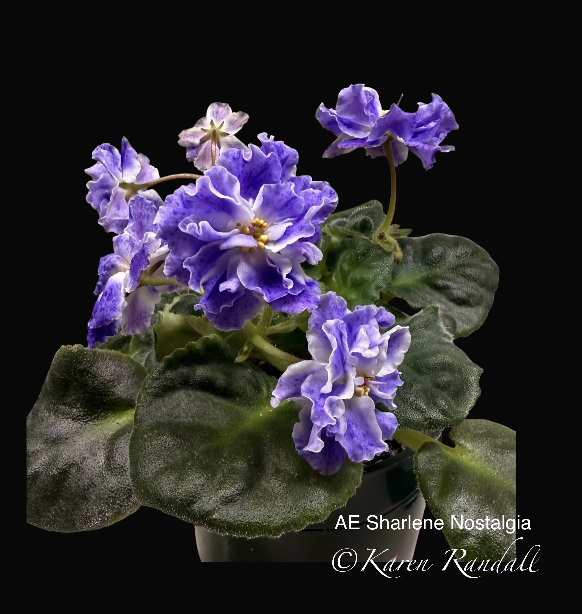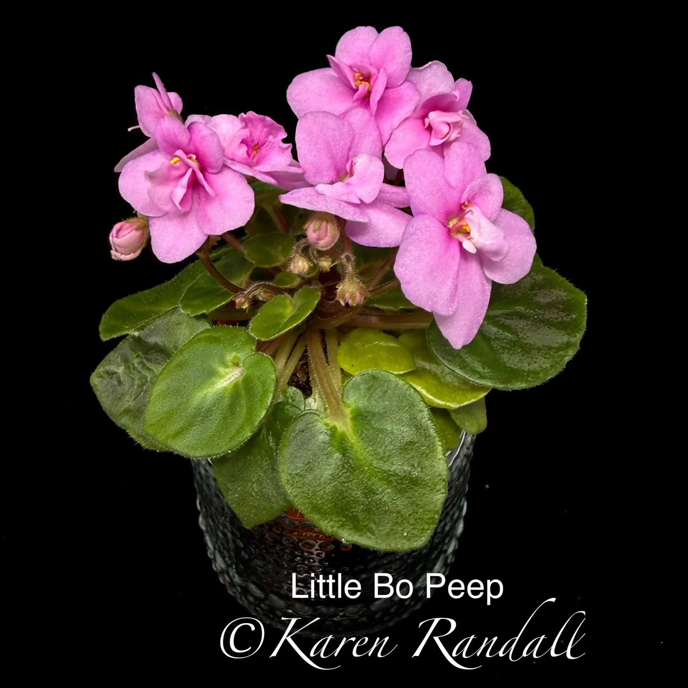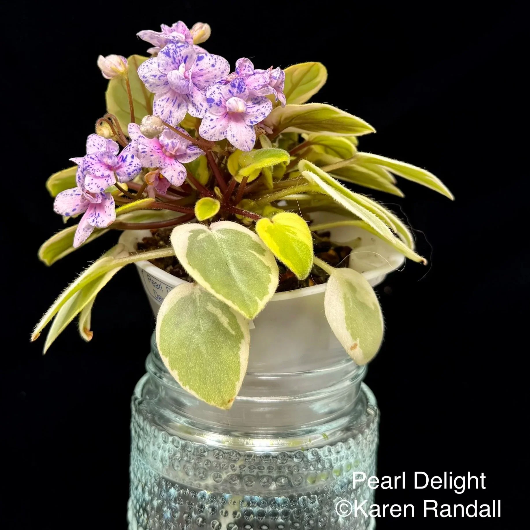 “Sparkling double light pink, heavily peppered with blue fantasy.” Constant and heavy bloomer. Semiminiature trailer. AVSA #8053”