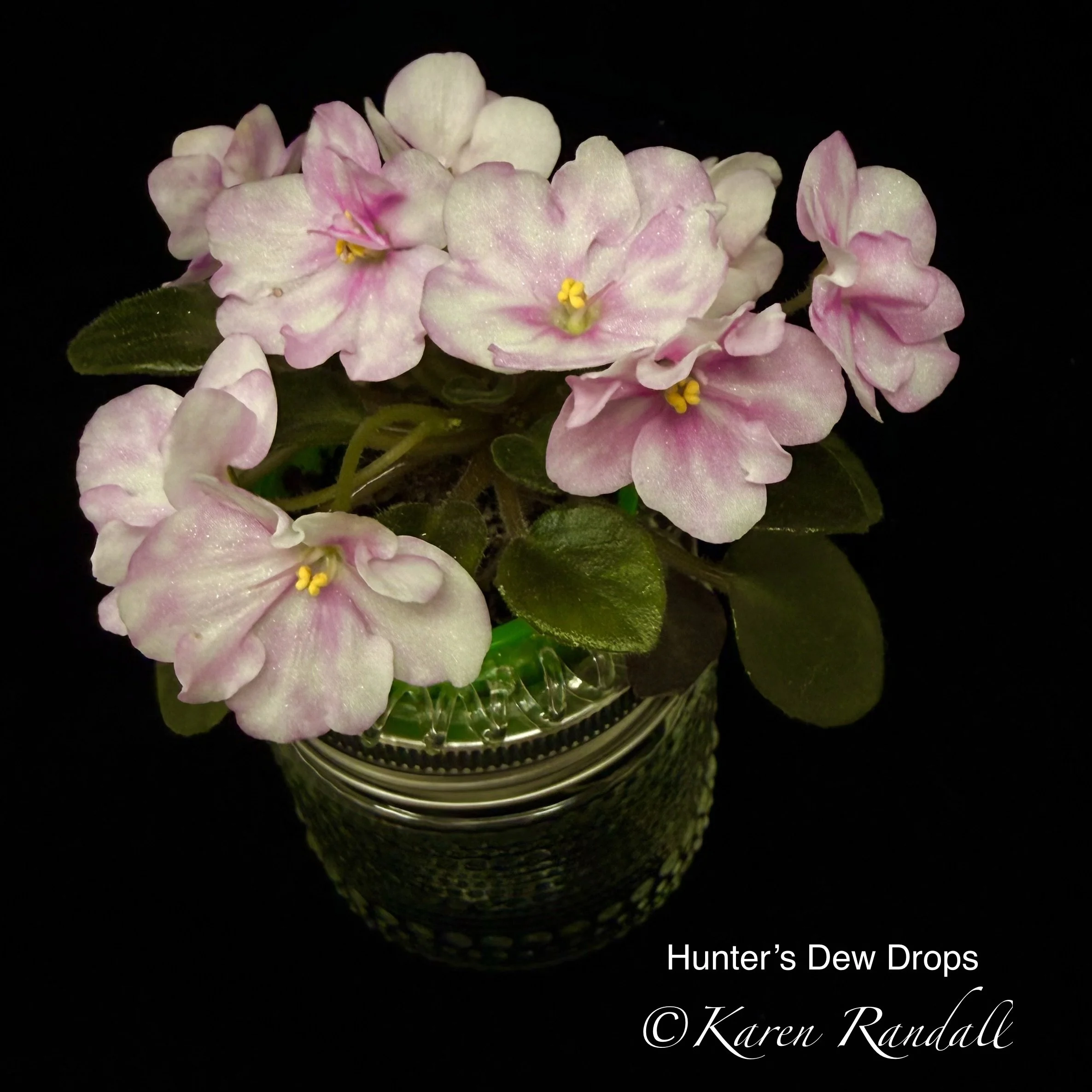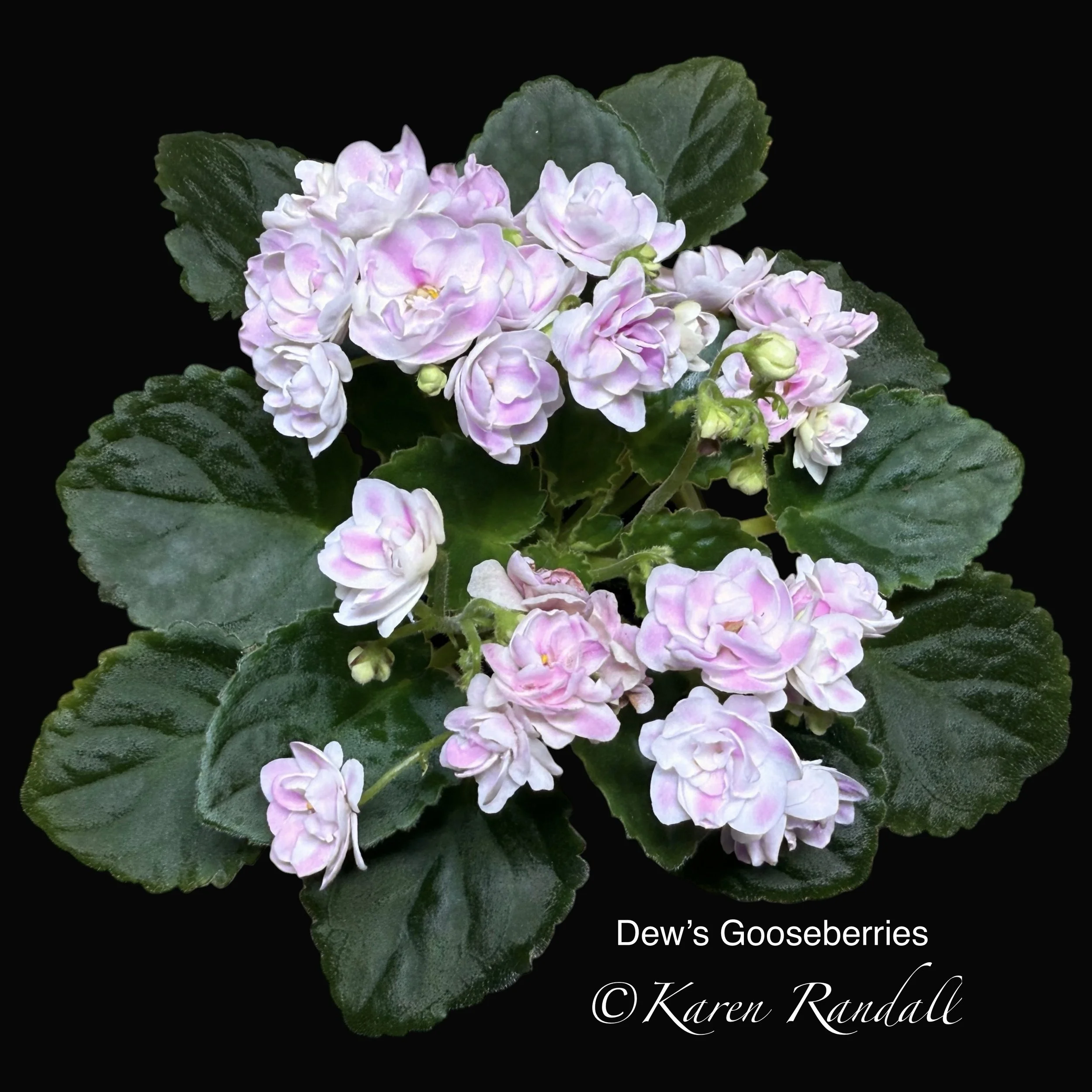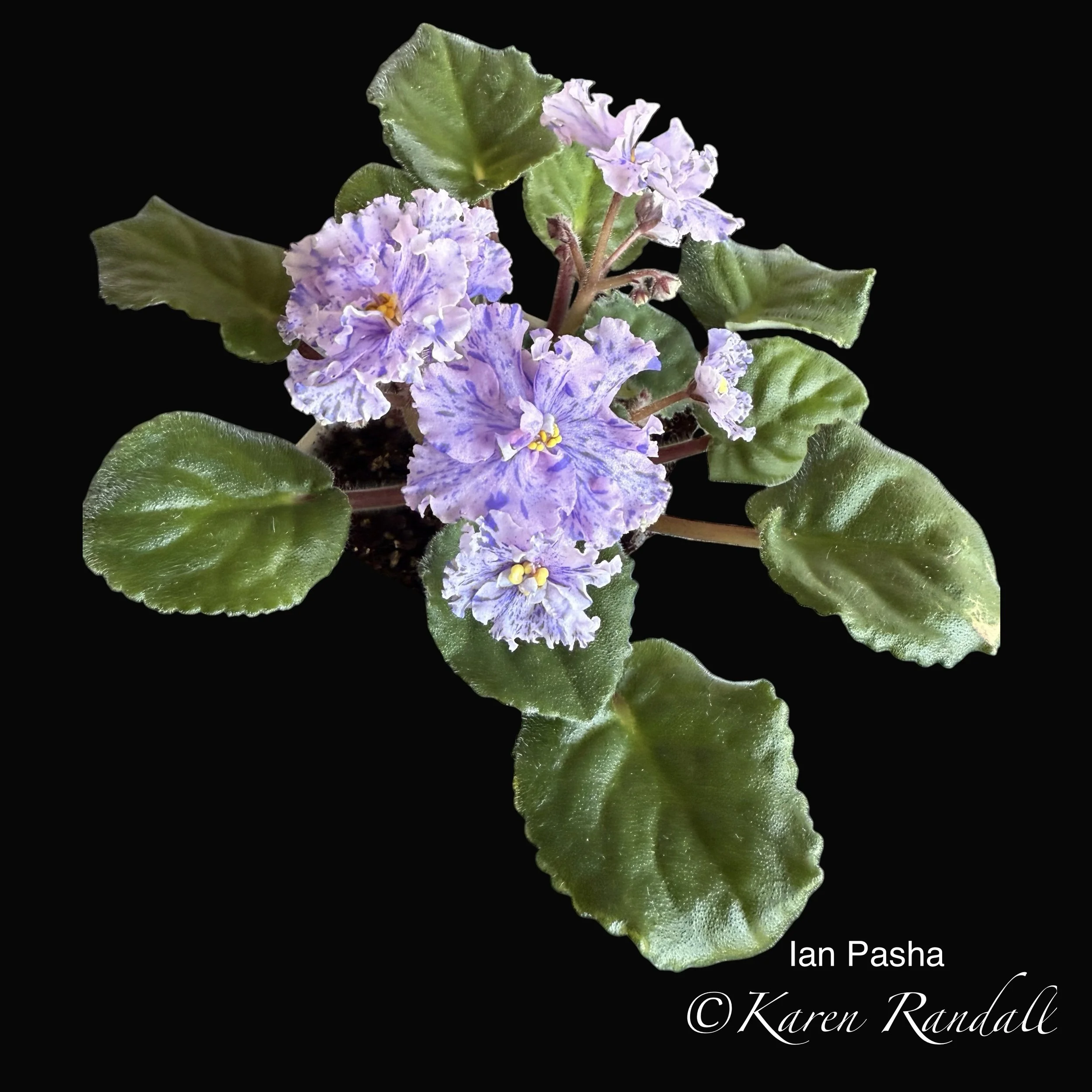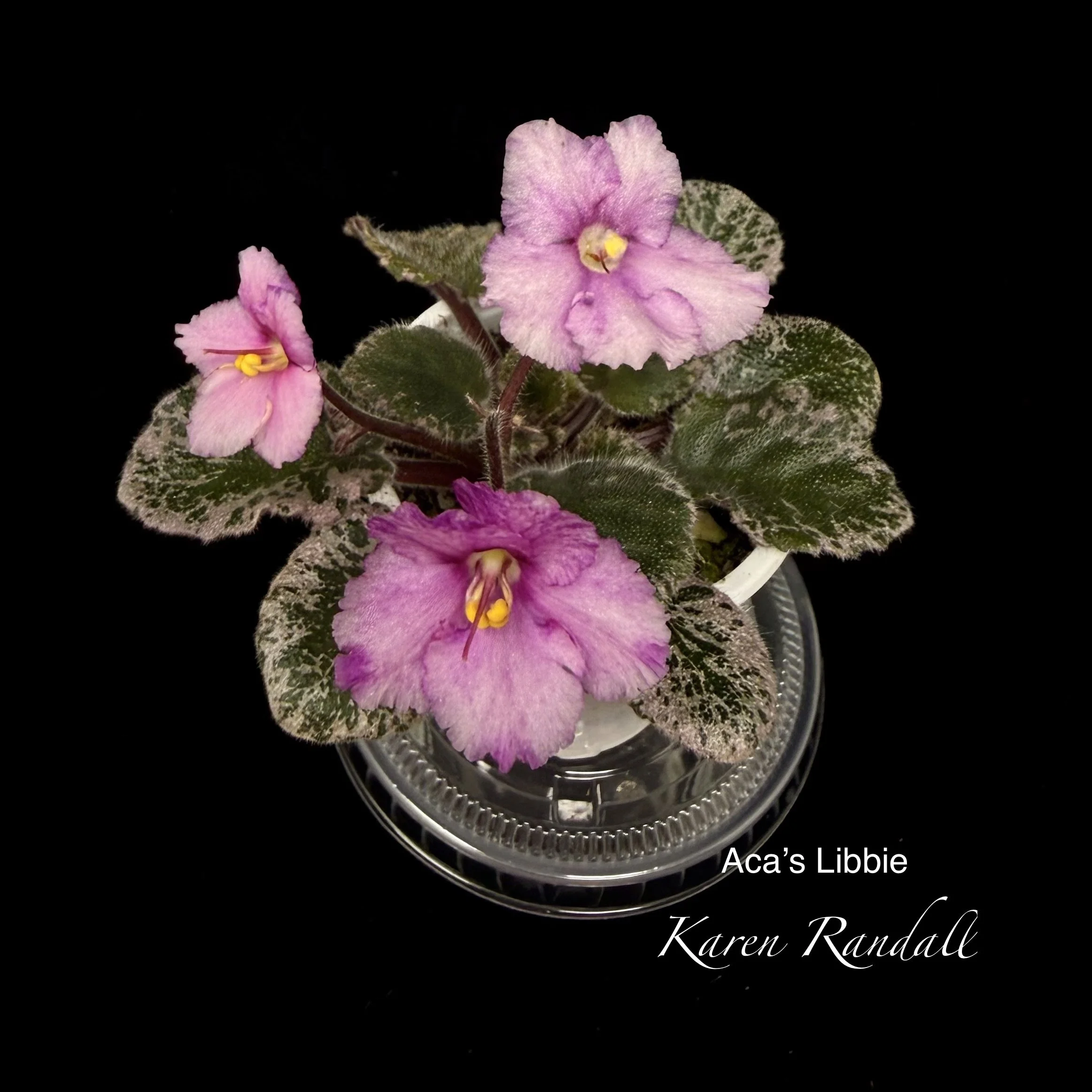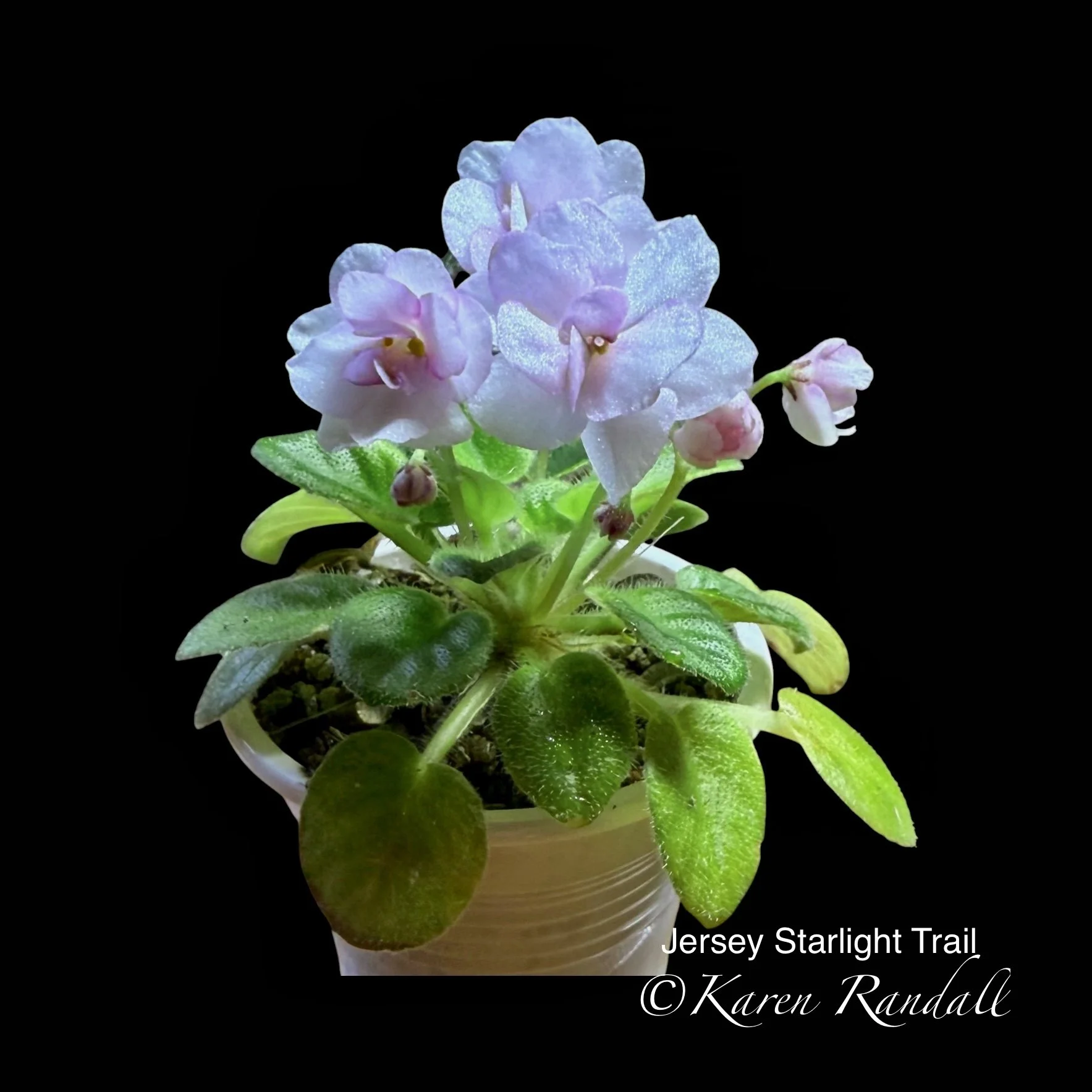 “Sparkling double light pink, heavily peppered with blue fantasy.” Constant and heavy bloomer. Semiminiature trailer. AVSA #8053”