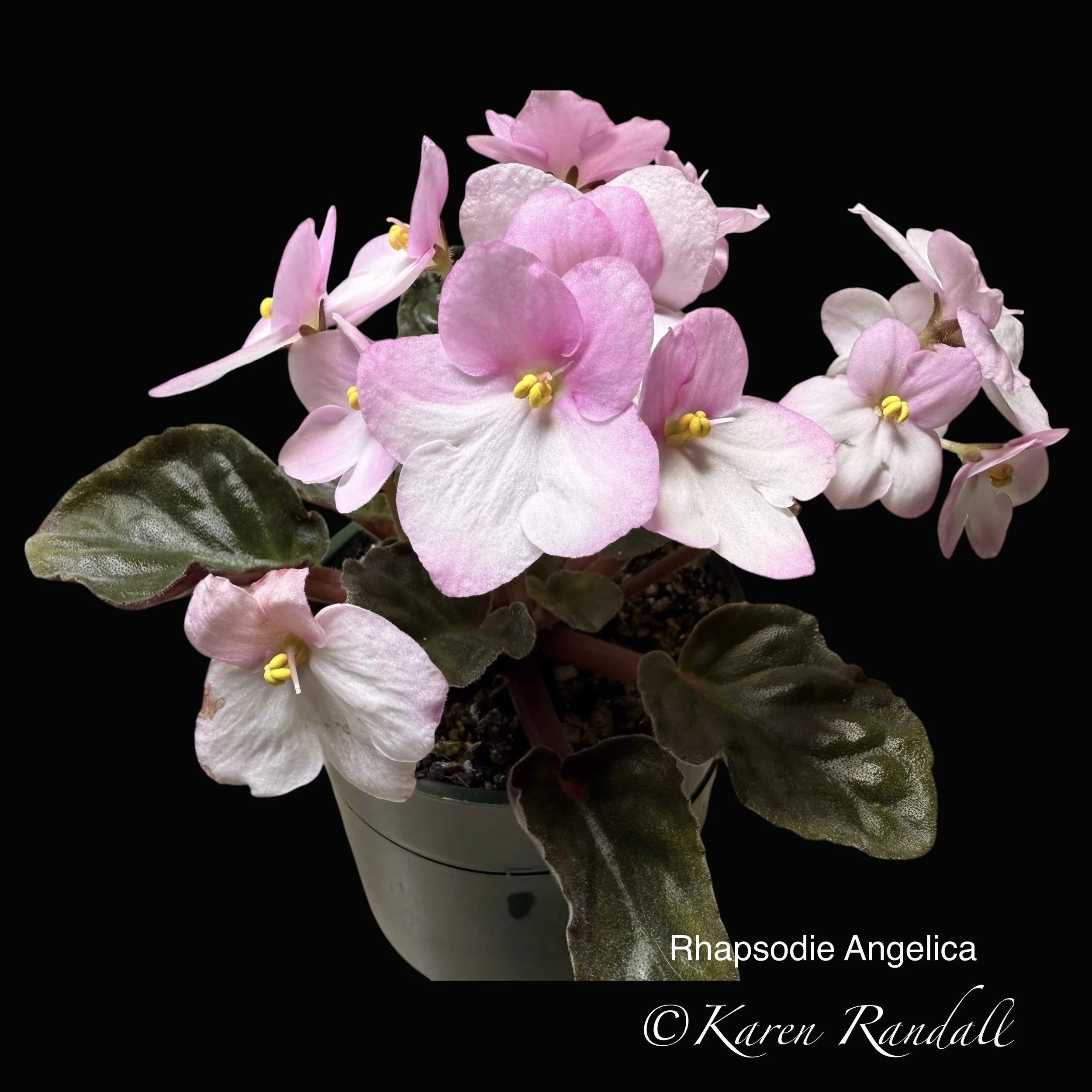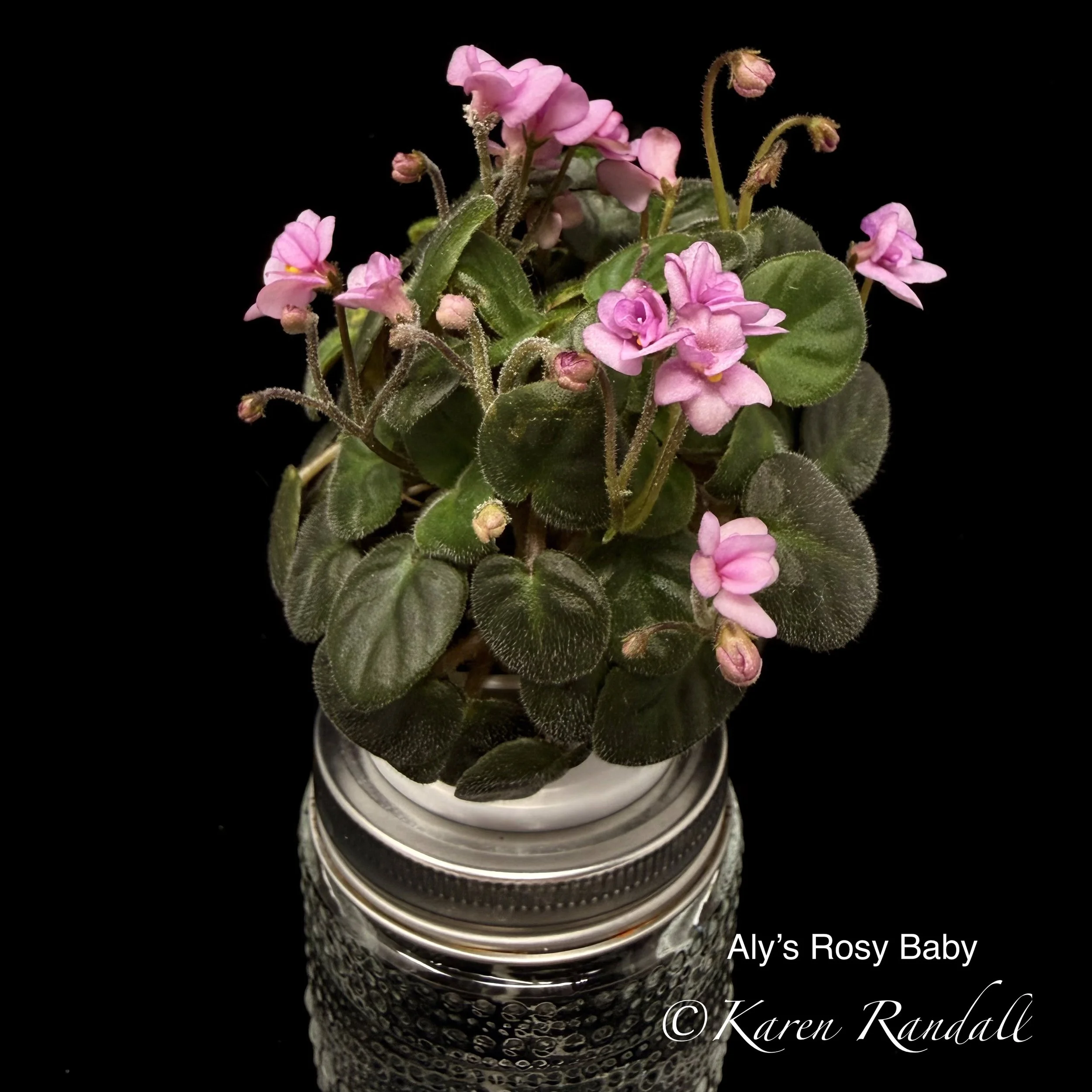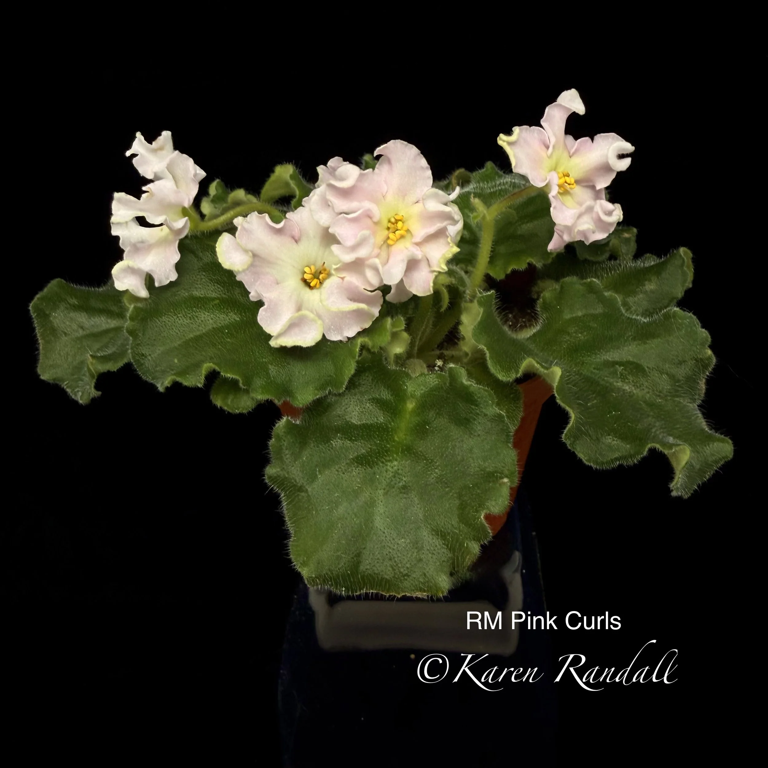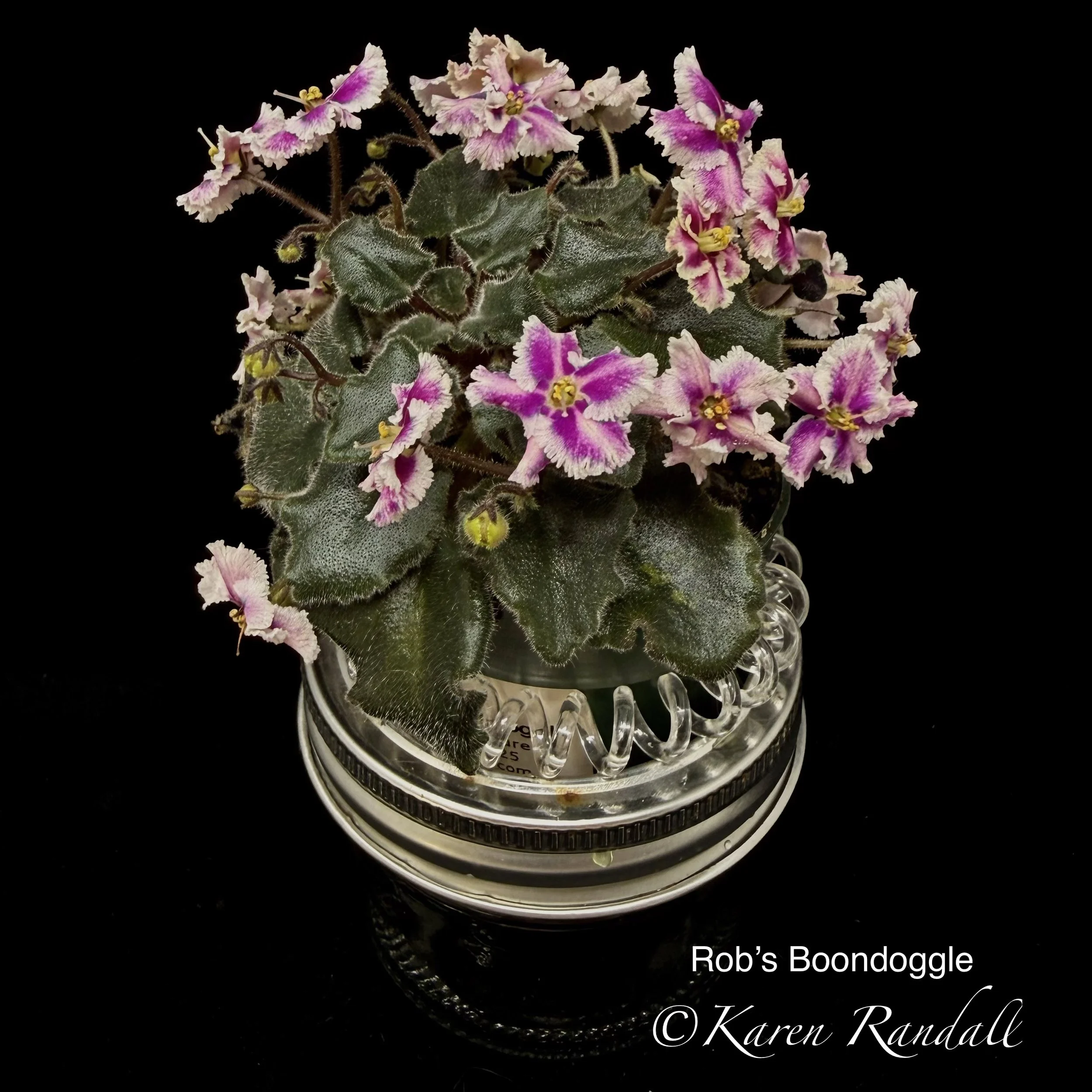 “Sparkling double light pink, heavily peppered with blue fantasy.” Constant and heavy bloomer. Semiminiature trailer. AVSA #8053”