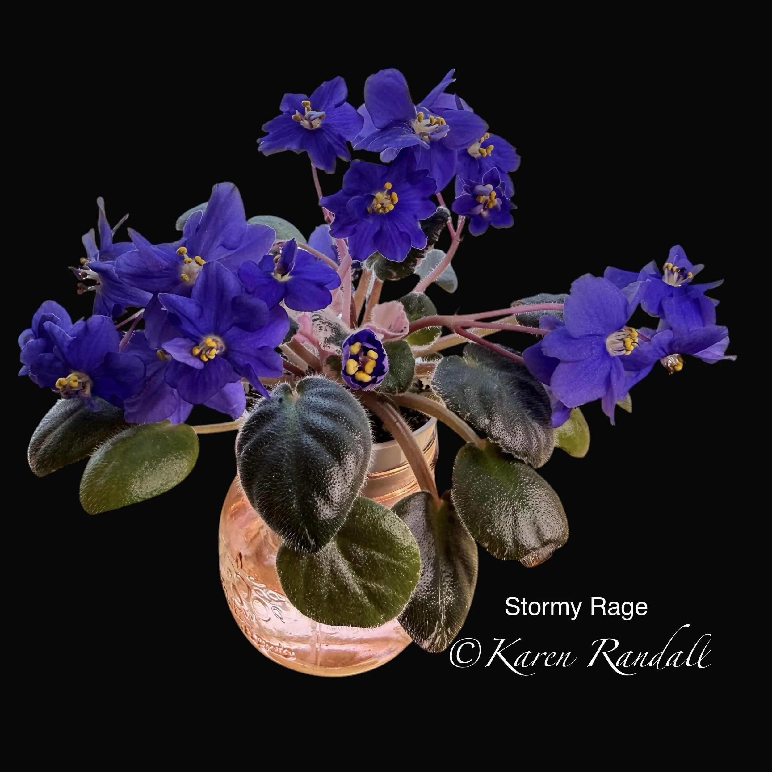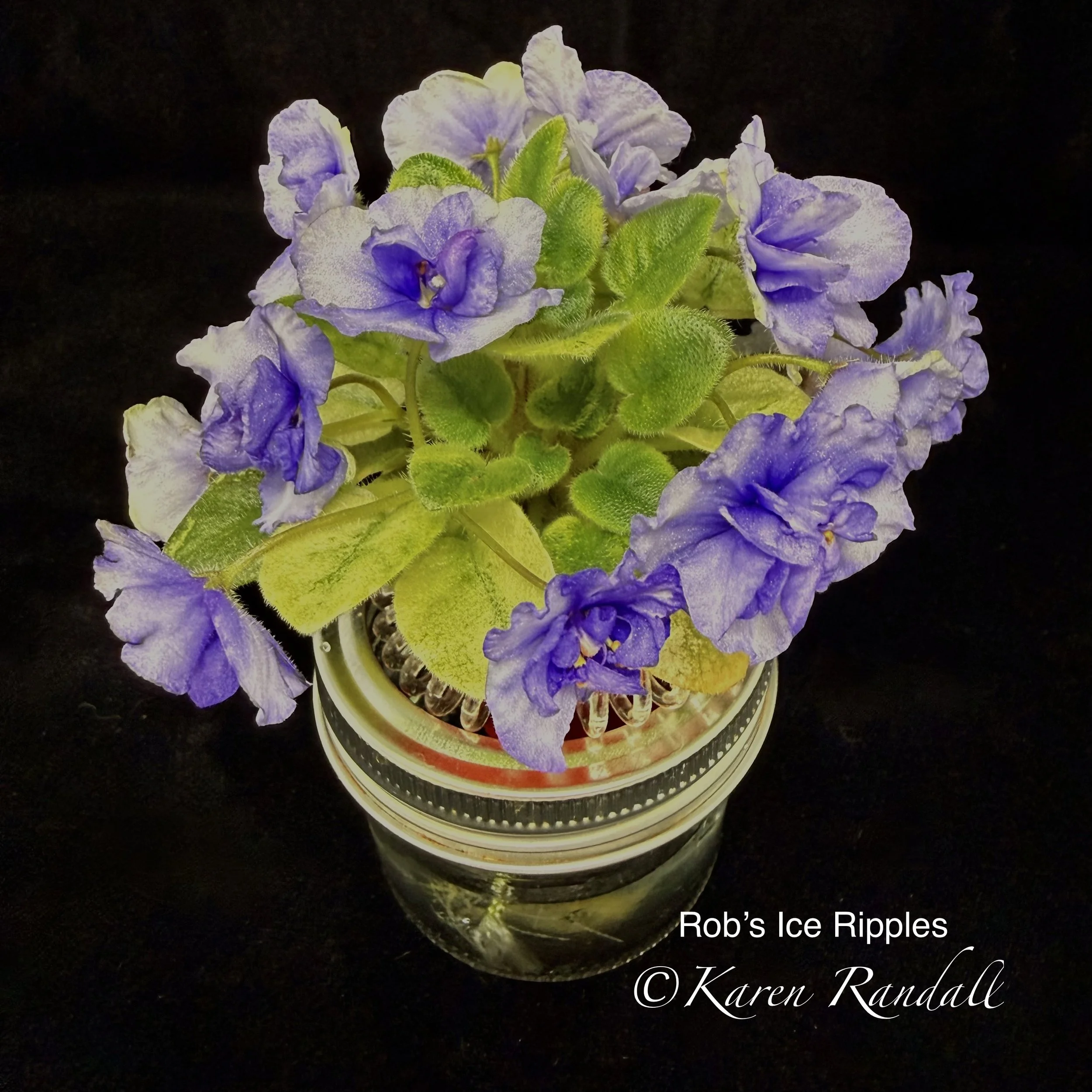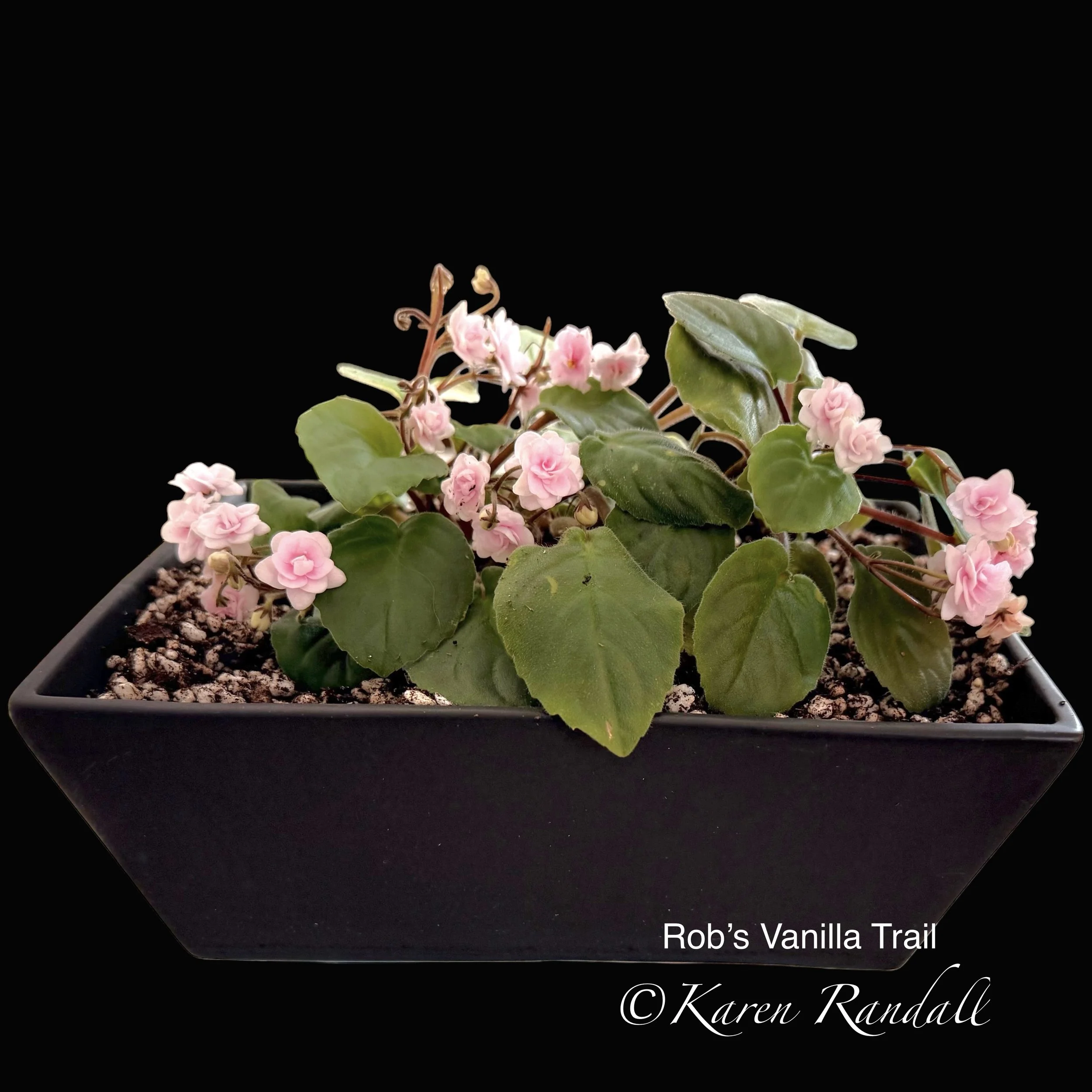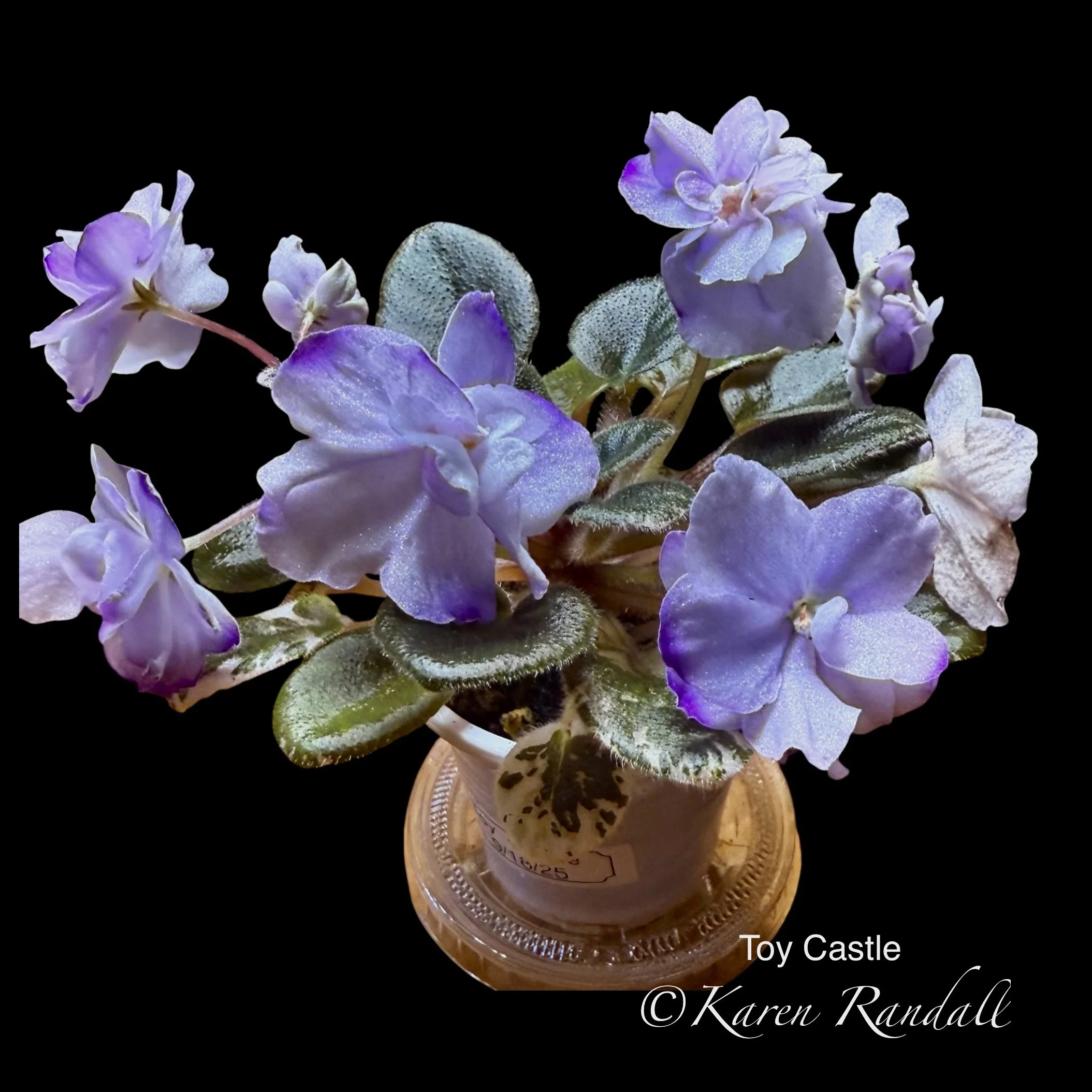 “Sparkling double light pink, heavily peppered with blue fantasy.” Constant and heavy bloomer. Semiminiature trailer. AVSA #8053”