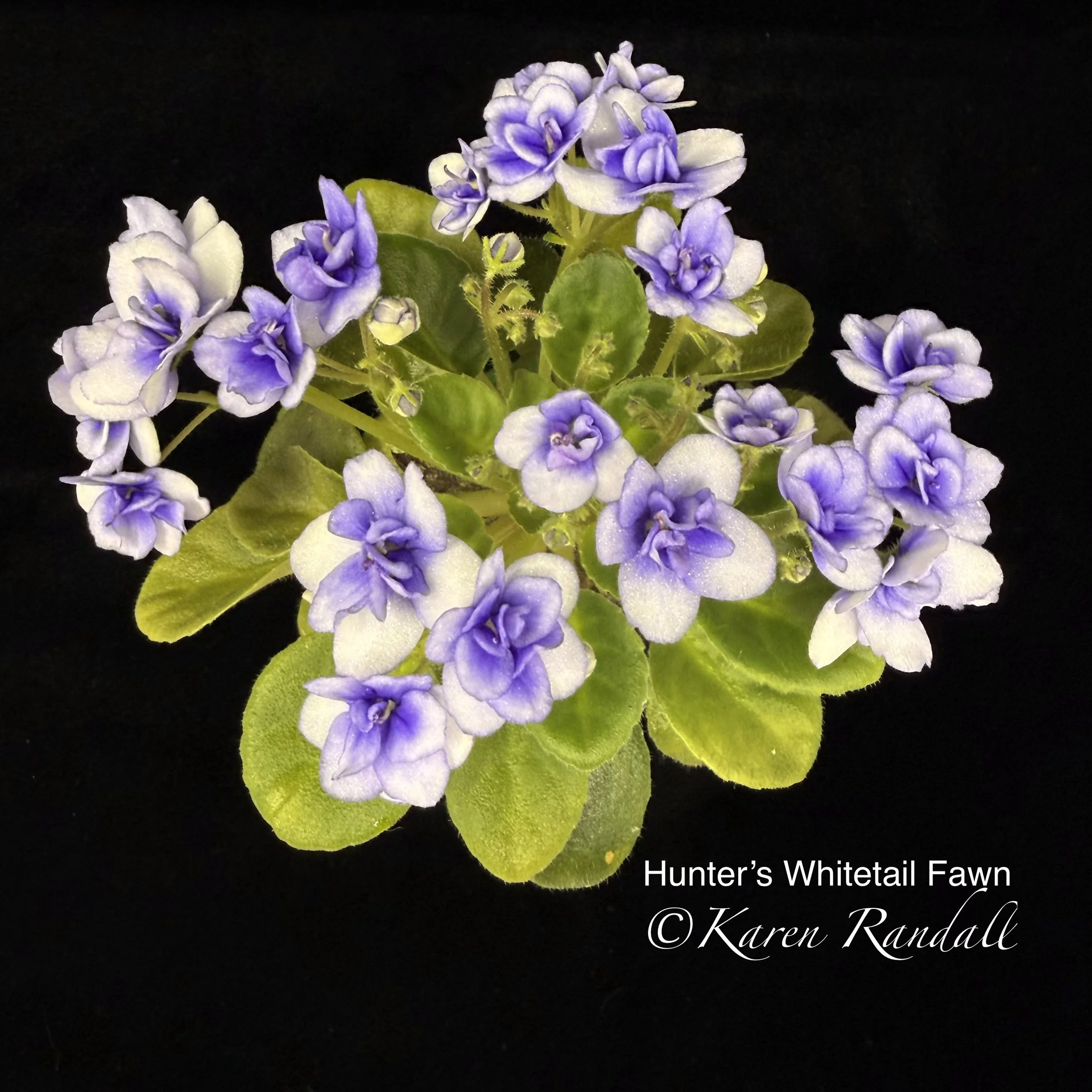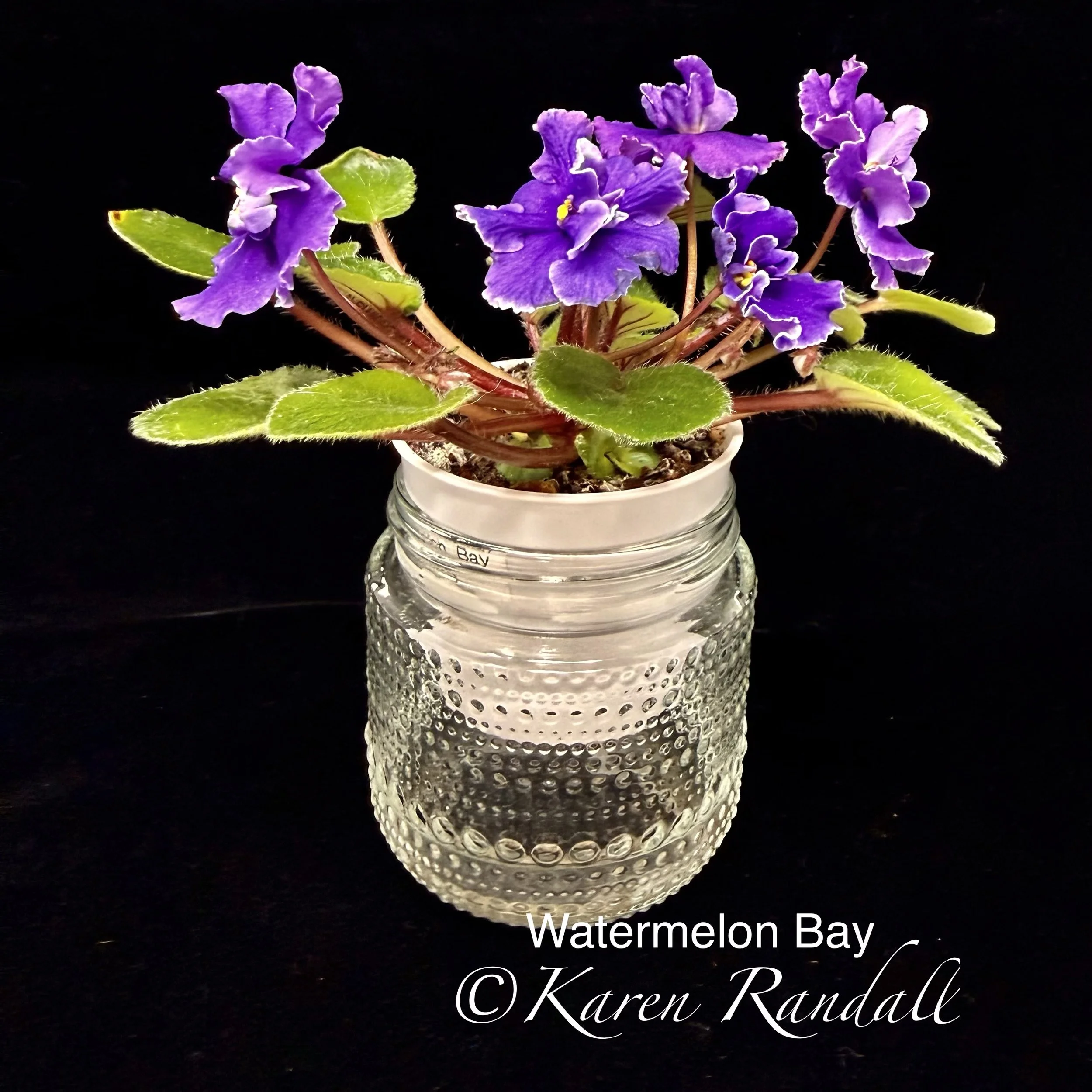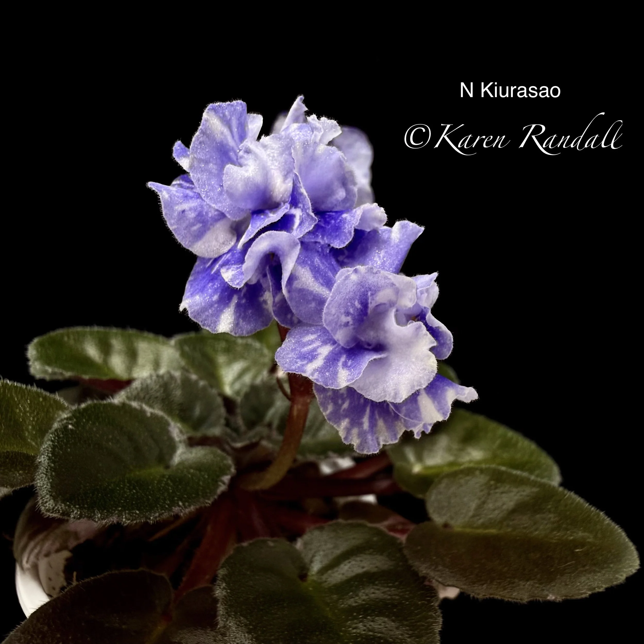 Semidouble to double blue and white large blue edge. Variegated medium green and white, ovate, quilted, glossy. Semi Miniature Trailer. AVSA Reg. #7427 (Lloyd)