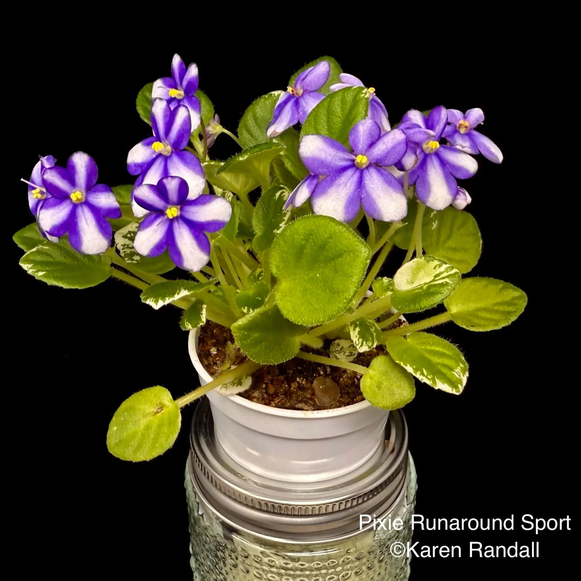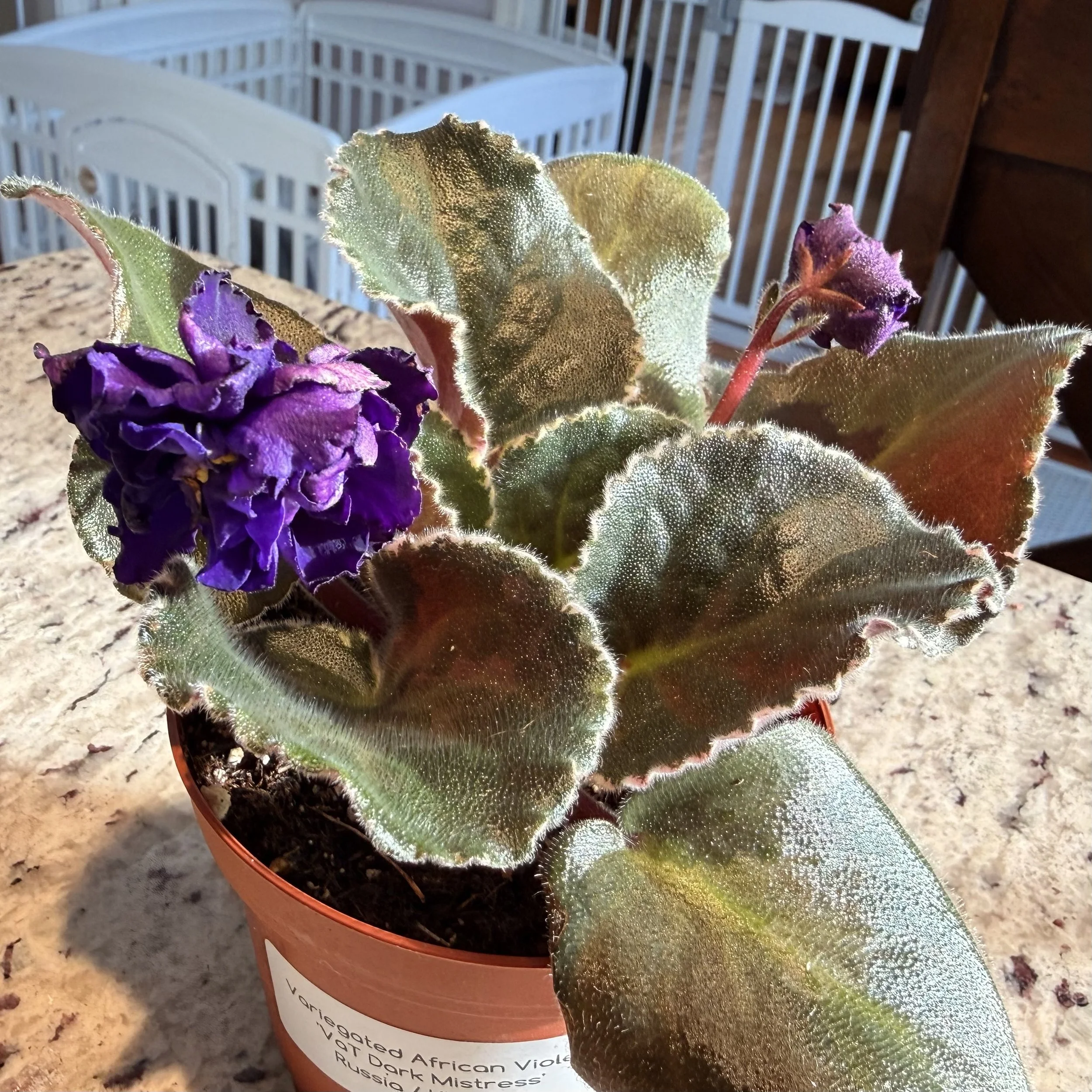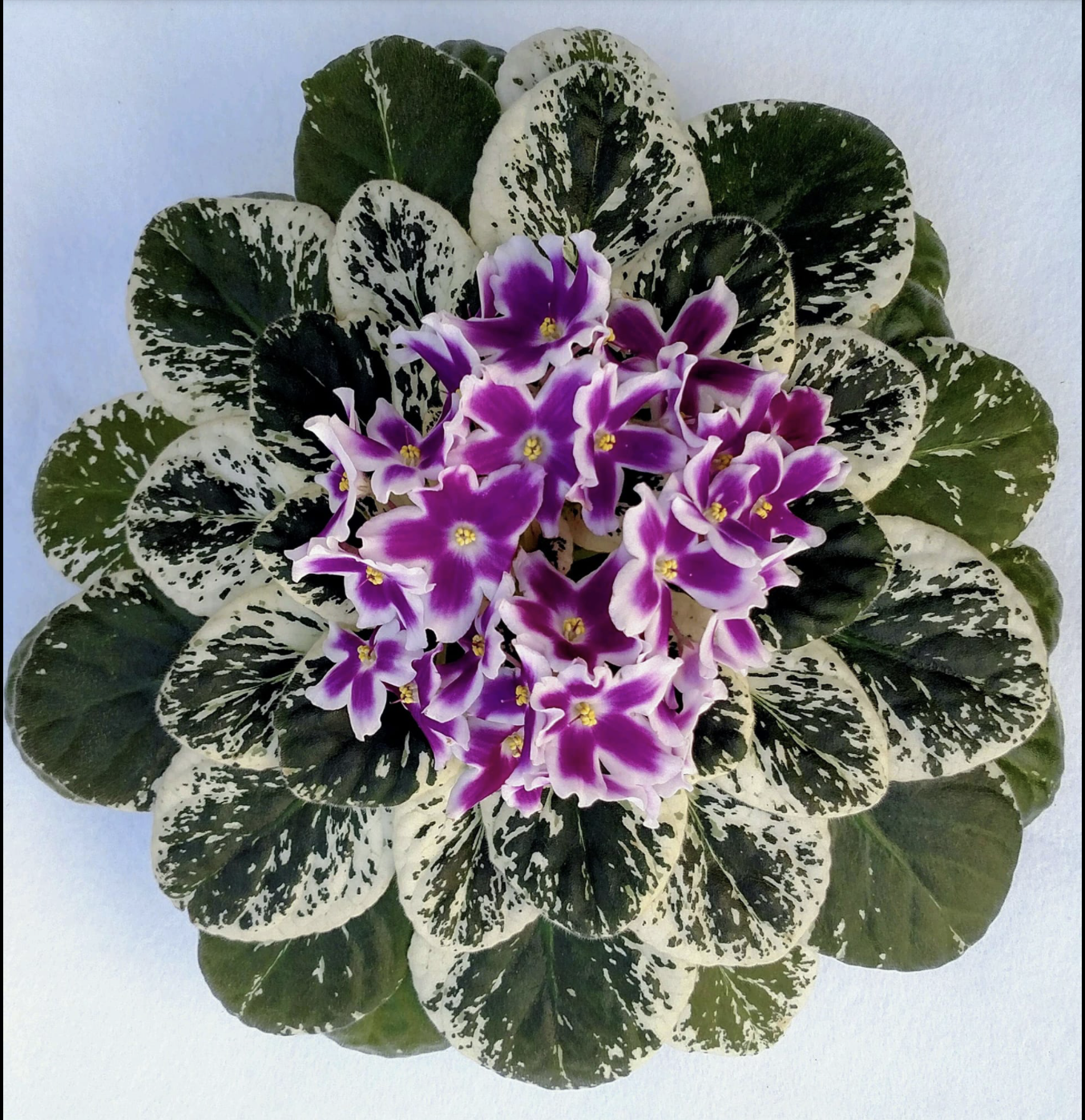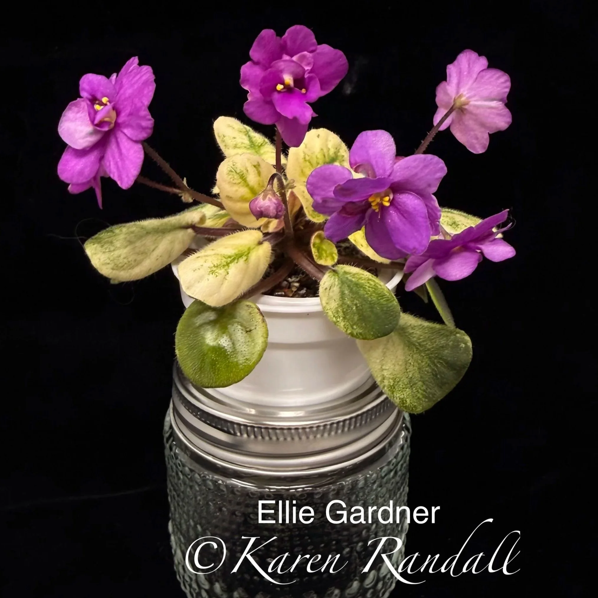 miniature African violet cultivar known for its simple, wavy, purple star-shaped flowers and distinctly variegated "girl" type foliage.