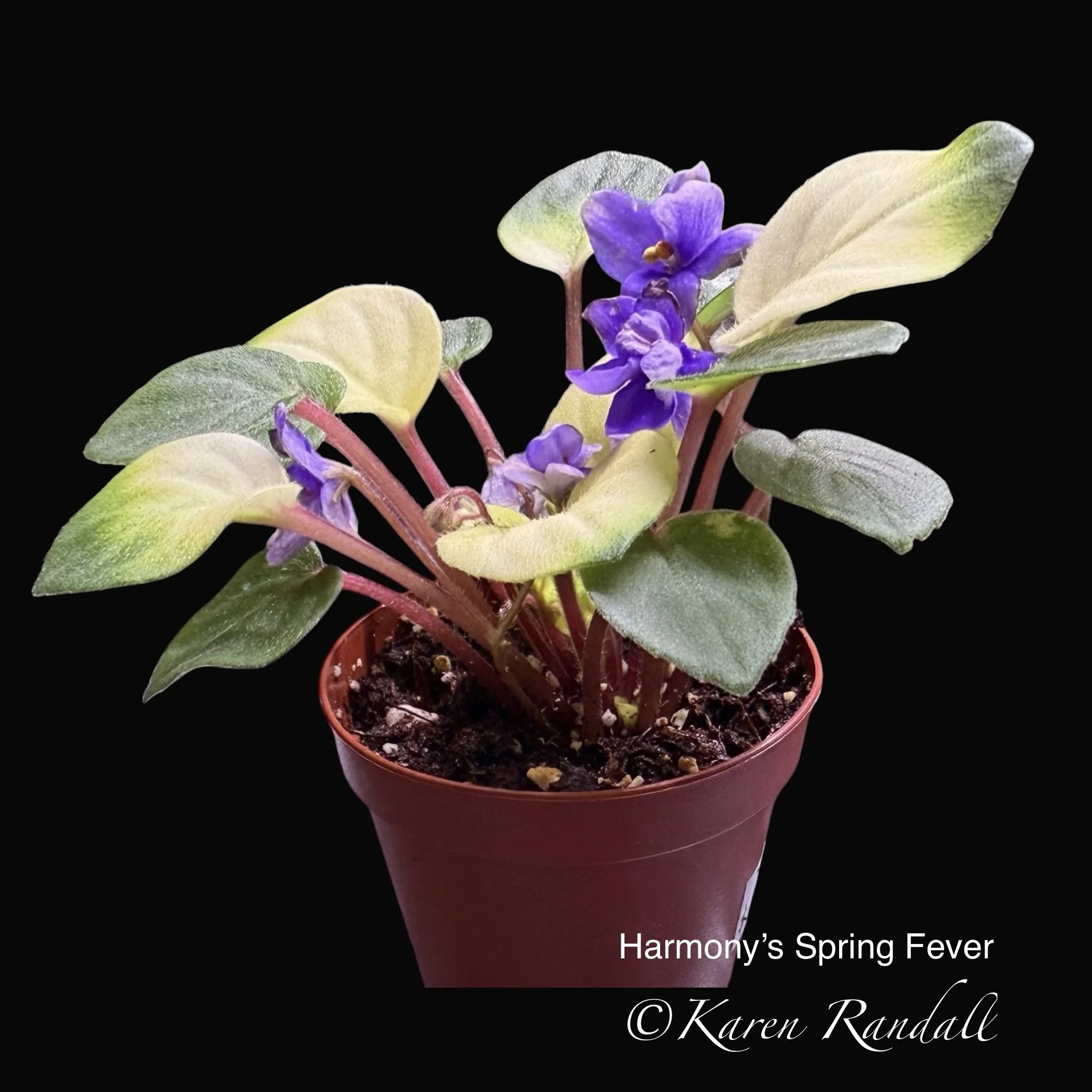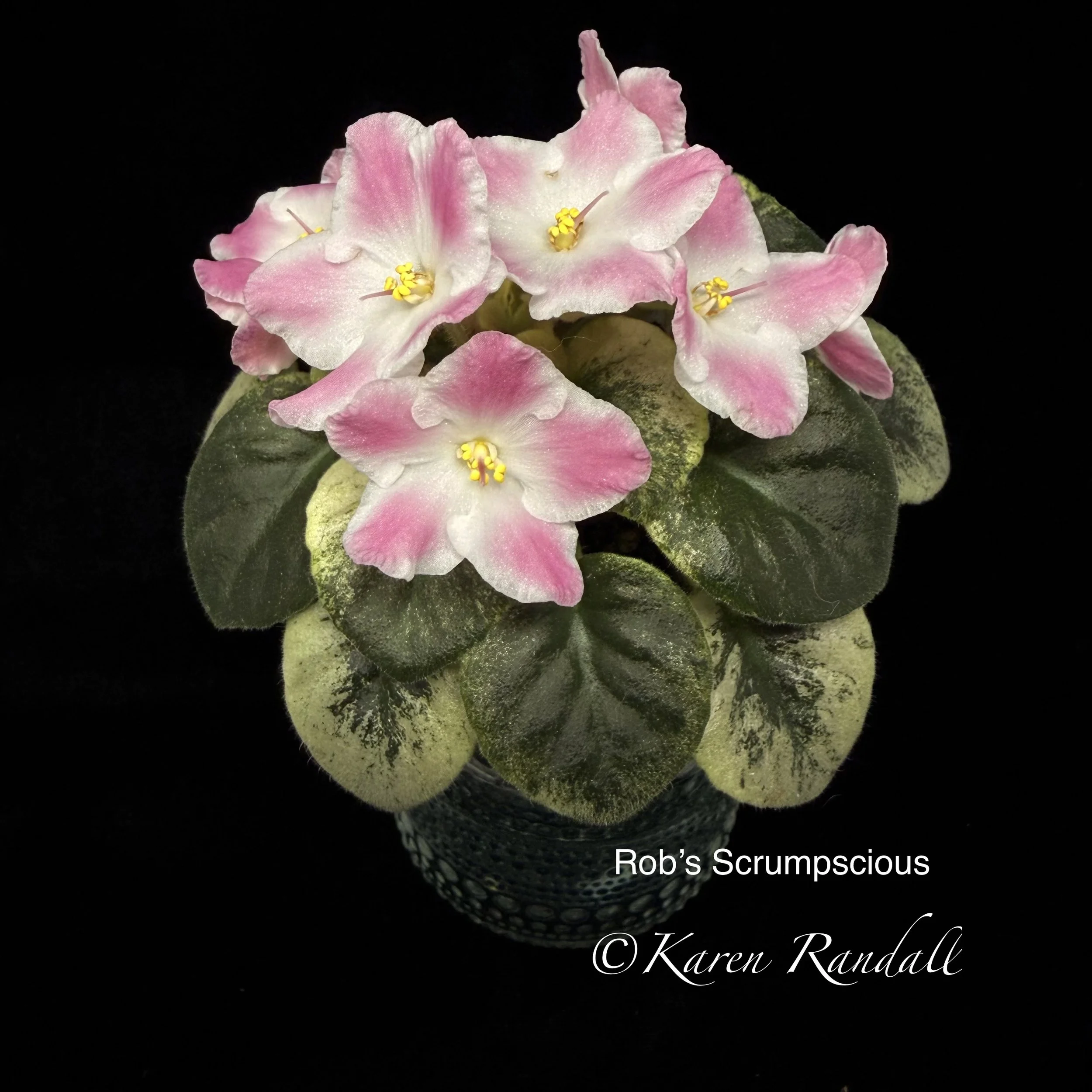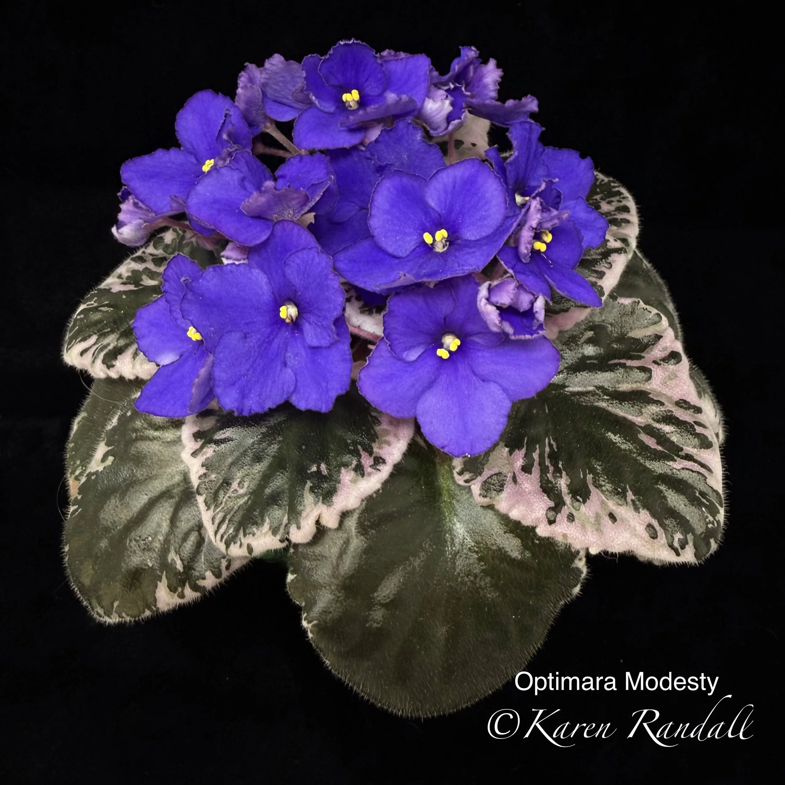 Double stars of dark blue are eye-catching above dark green foliage, variegated in pink and cream tones. AVSA Reg. #9199 (LLG)