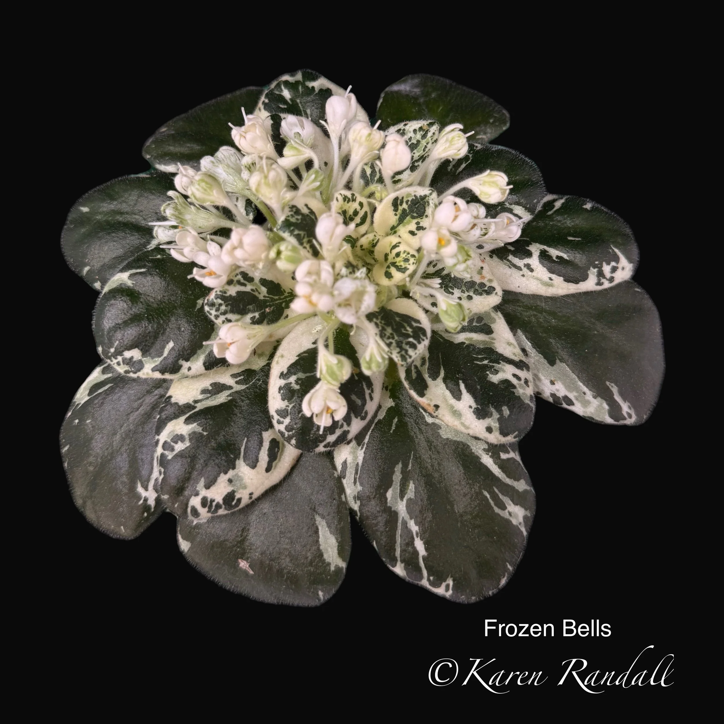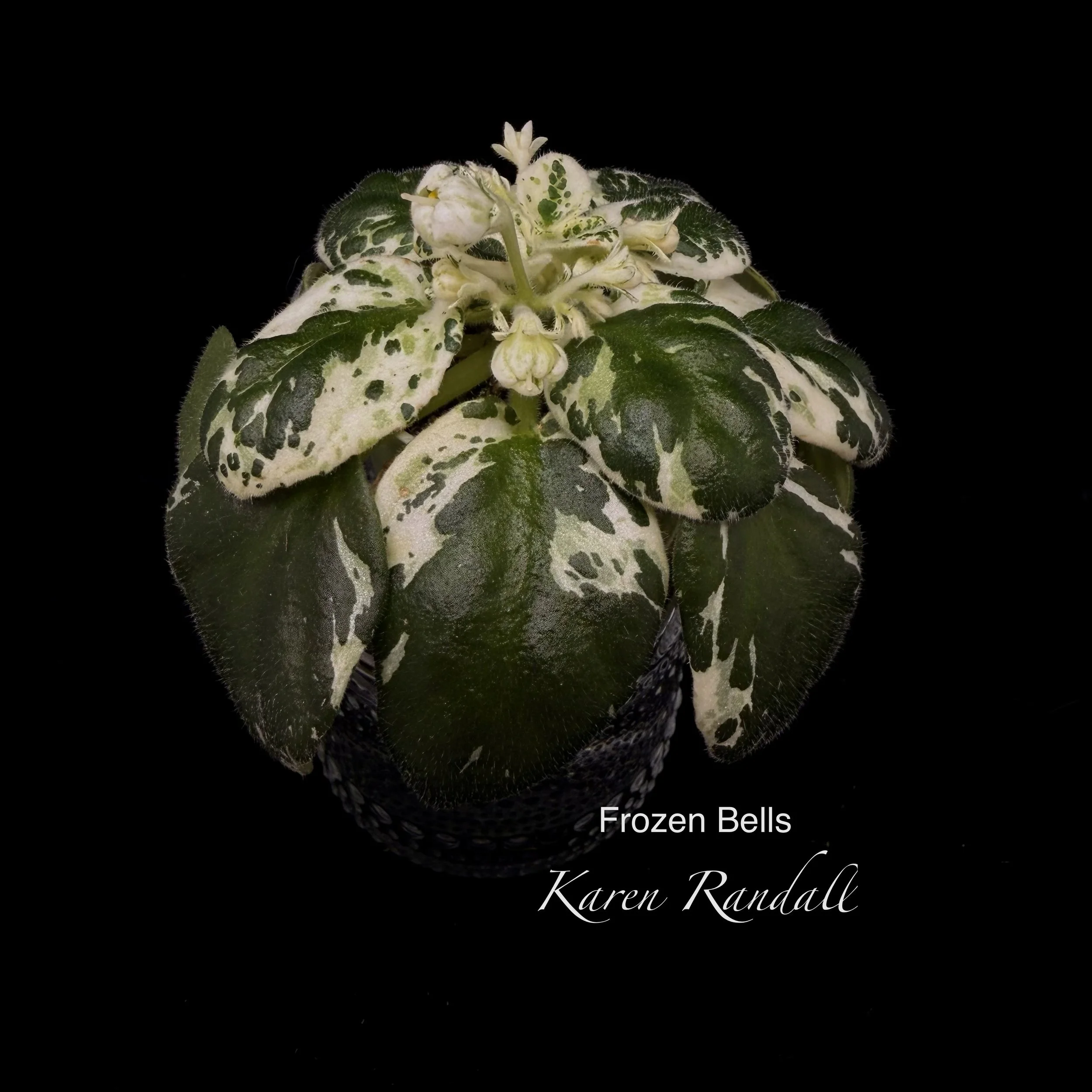 Semiminiature Single white sticktite (non-dropping) wasp styled bell blossoms with distinctive green stripes (almost a fantasy pattern). Medium green, variegated , plain foliage. (T. Golovchenko )