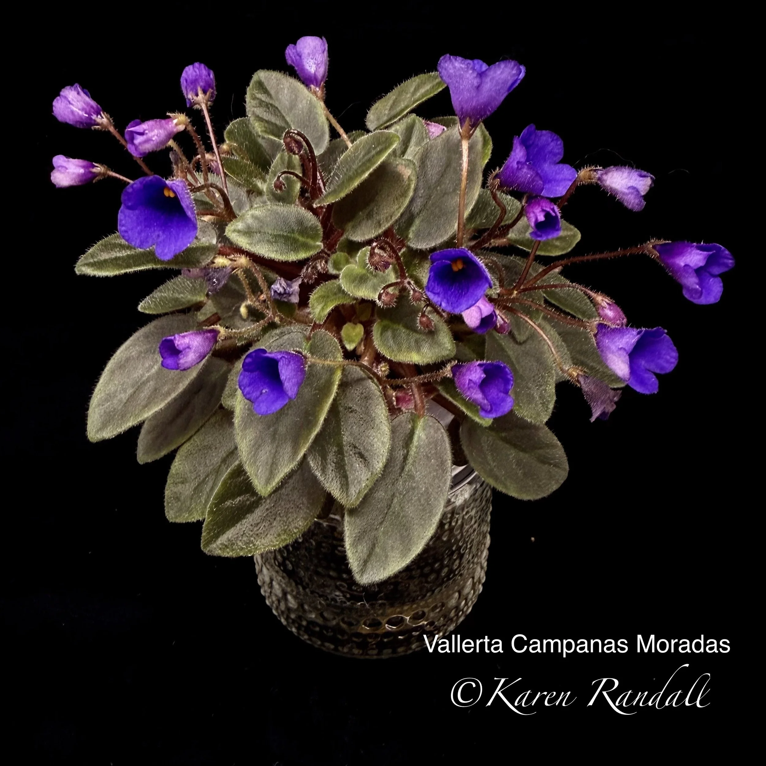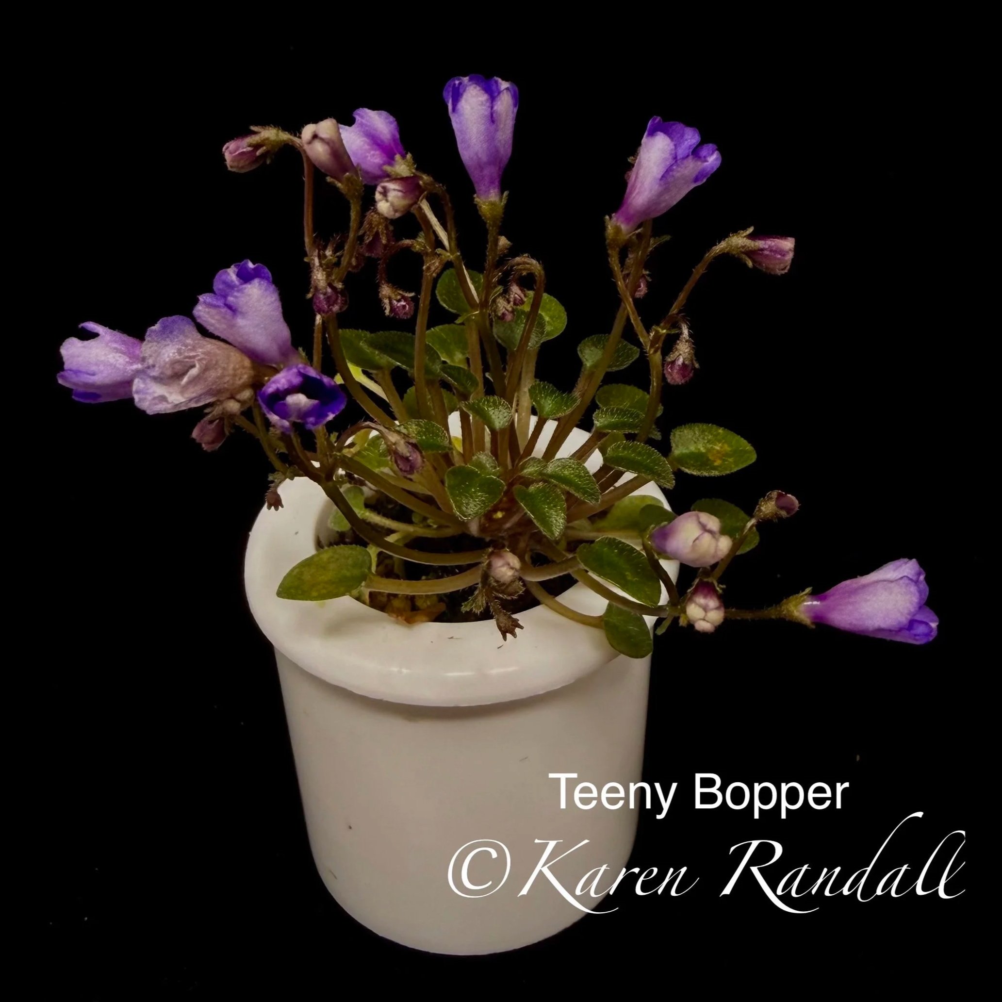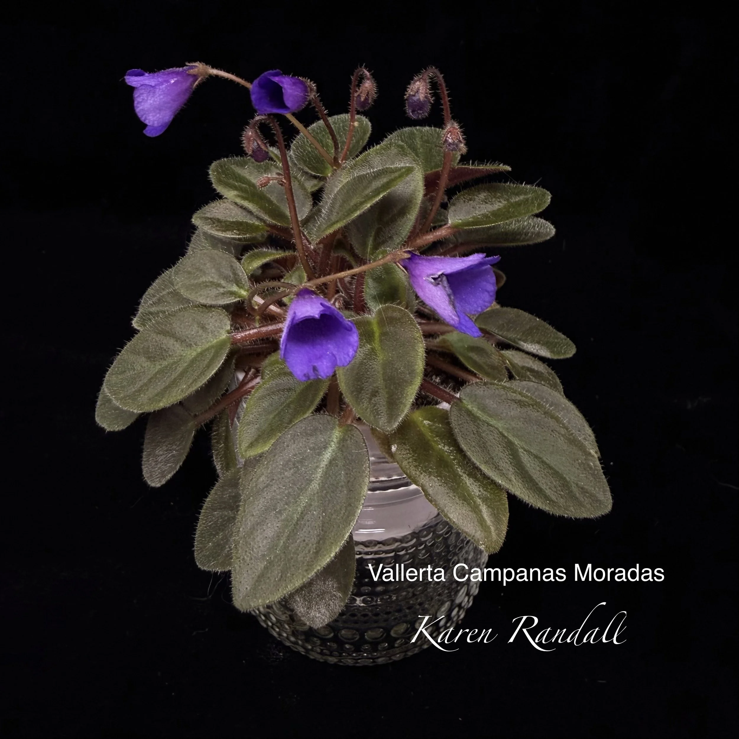 Single purple, bell shaped flower. Pointed, tiny. Miniature trailer. (vintage) AVSA Reg. #5017 (LLG)