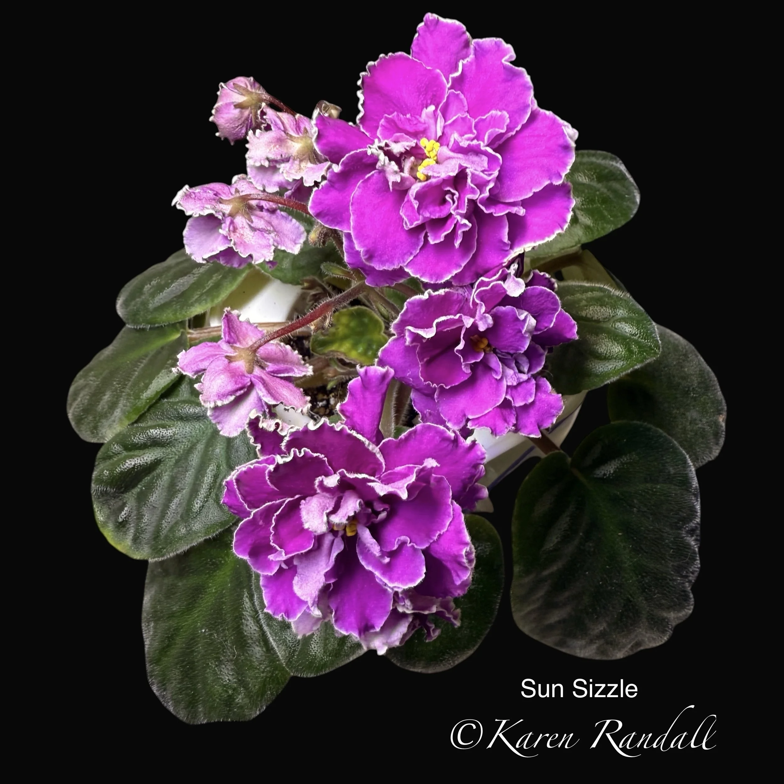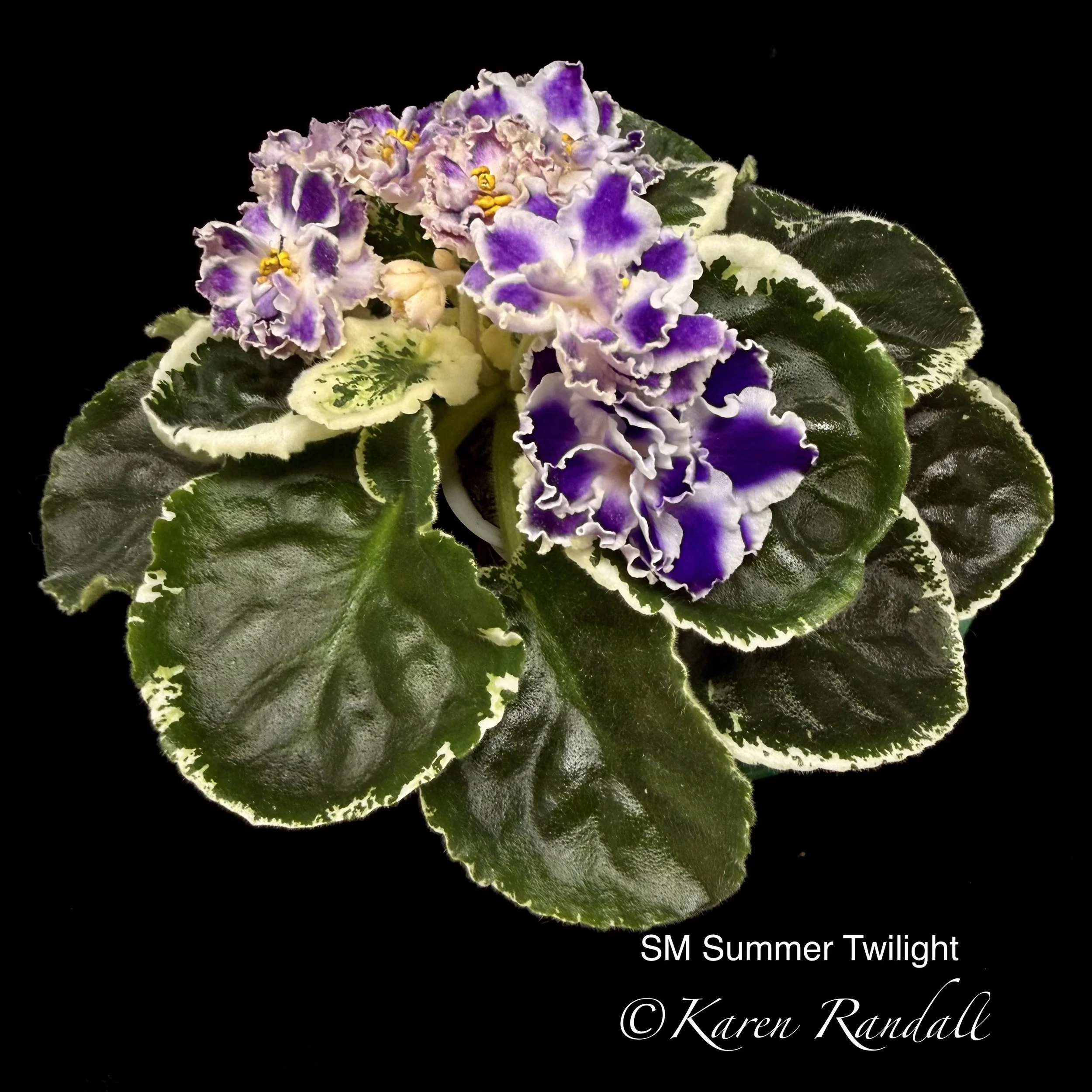 Crown variegated miniature. Small, purple semi-double blooms with white edges.