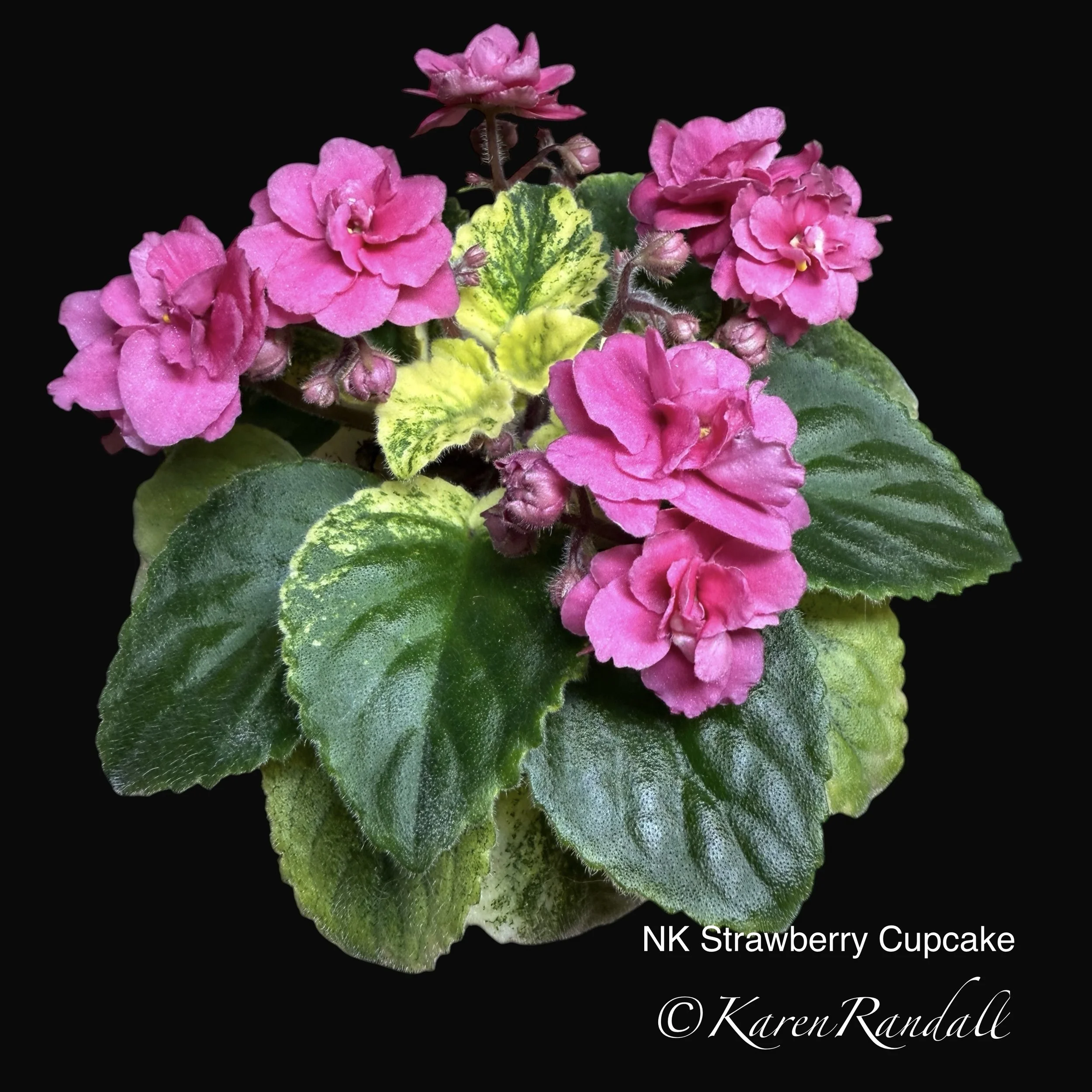 “Large sdbl. deep pink thumbprint stars with white center and borders. Cream, white, and green, round, variegated foliage. Small semiminiature. AVSA #9466”