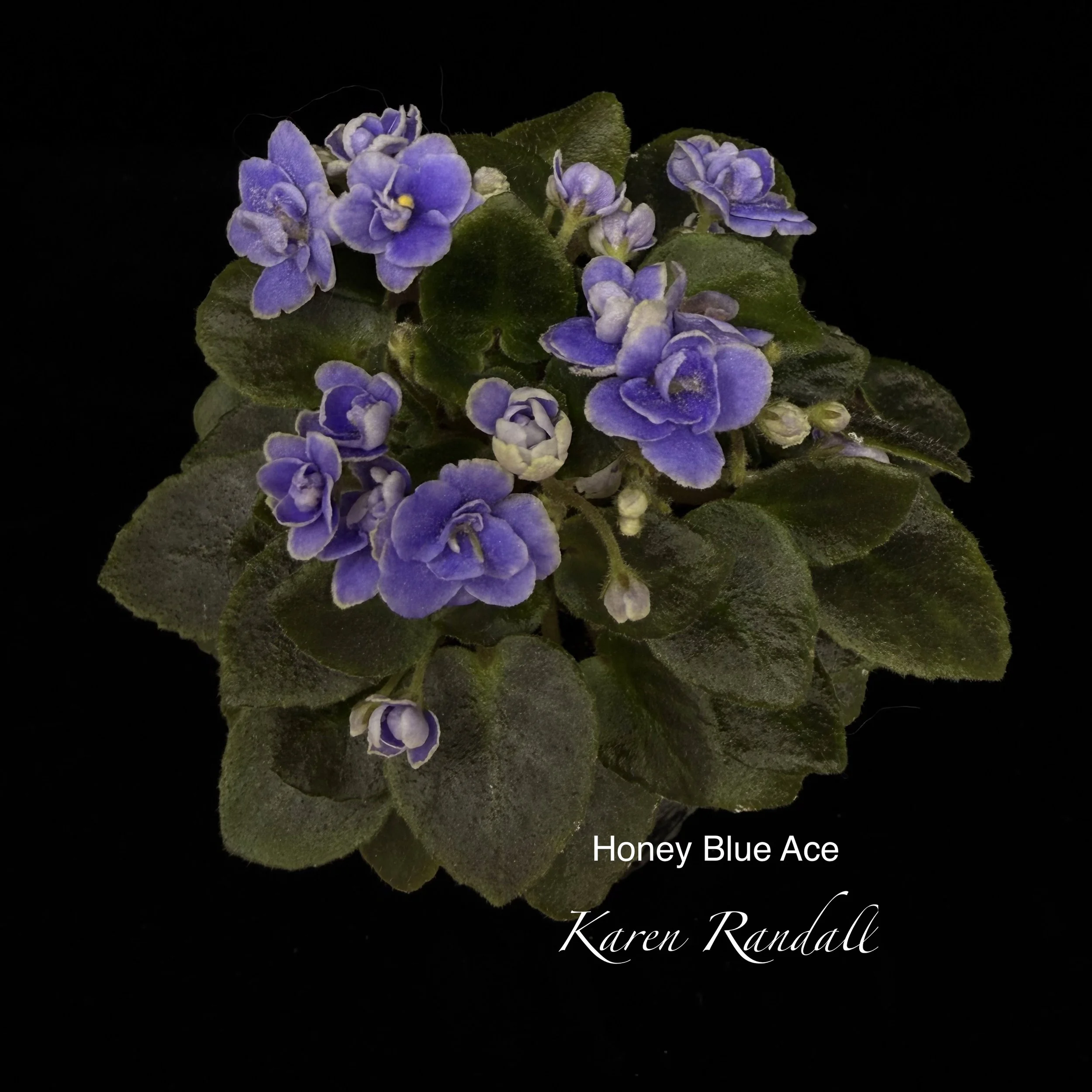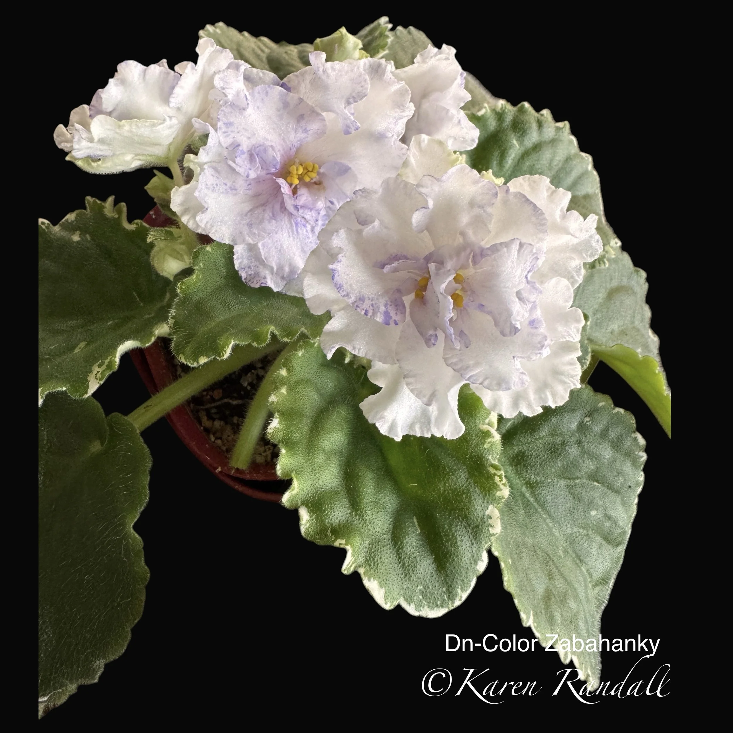 Fantastic, double blooms of light blue, enhance the dark green foliage, nicely variegated in white. This variety grows with excellent symmetry and is a constant bloomer. AVSA Reg. #7989 (LLG)