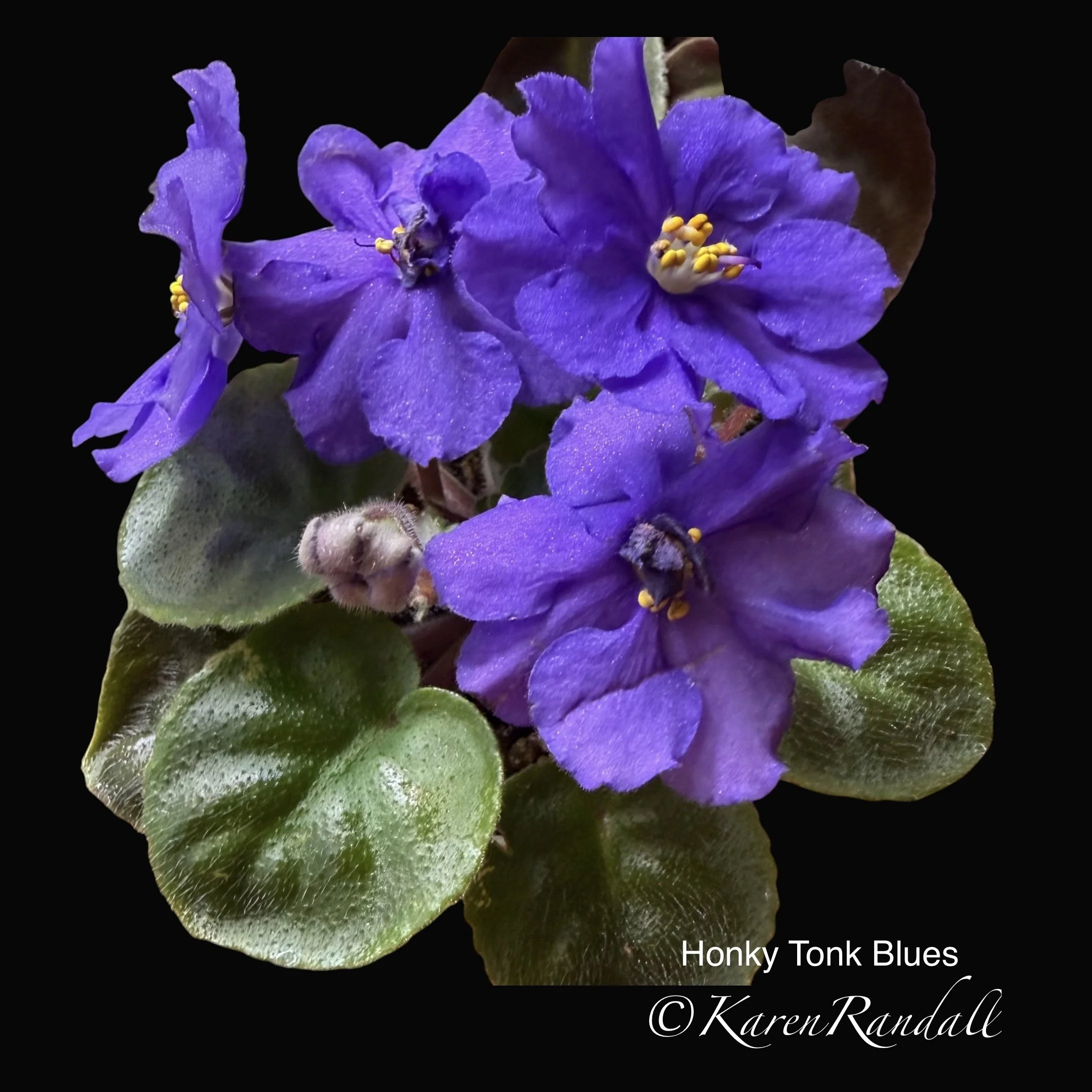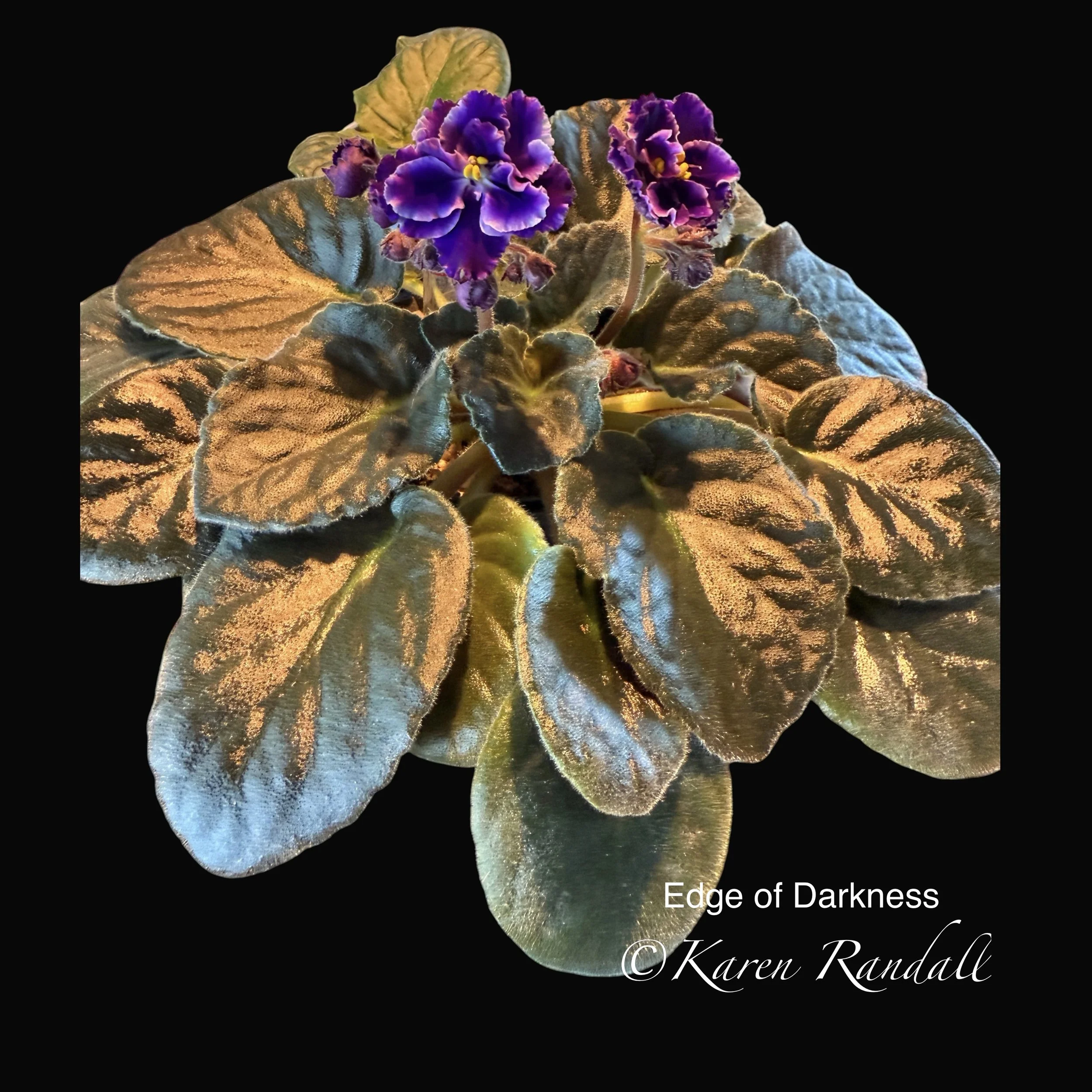 Hybridizer: Holtkamp (Optimara Greenhouses), Standard, Large ruffled dark purple blossoms adorn dark green, light serrated, variegated foliage. (Photo makes flower look blue, but it is really purple)