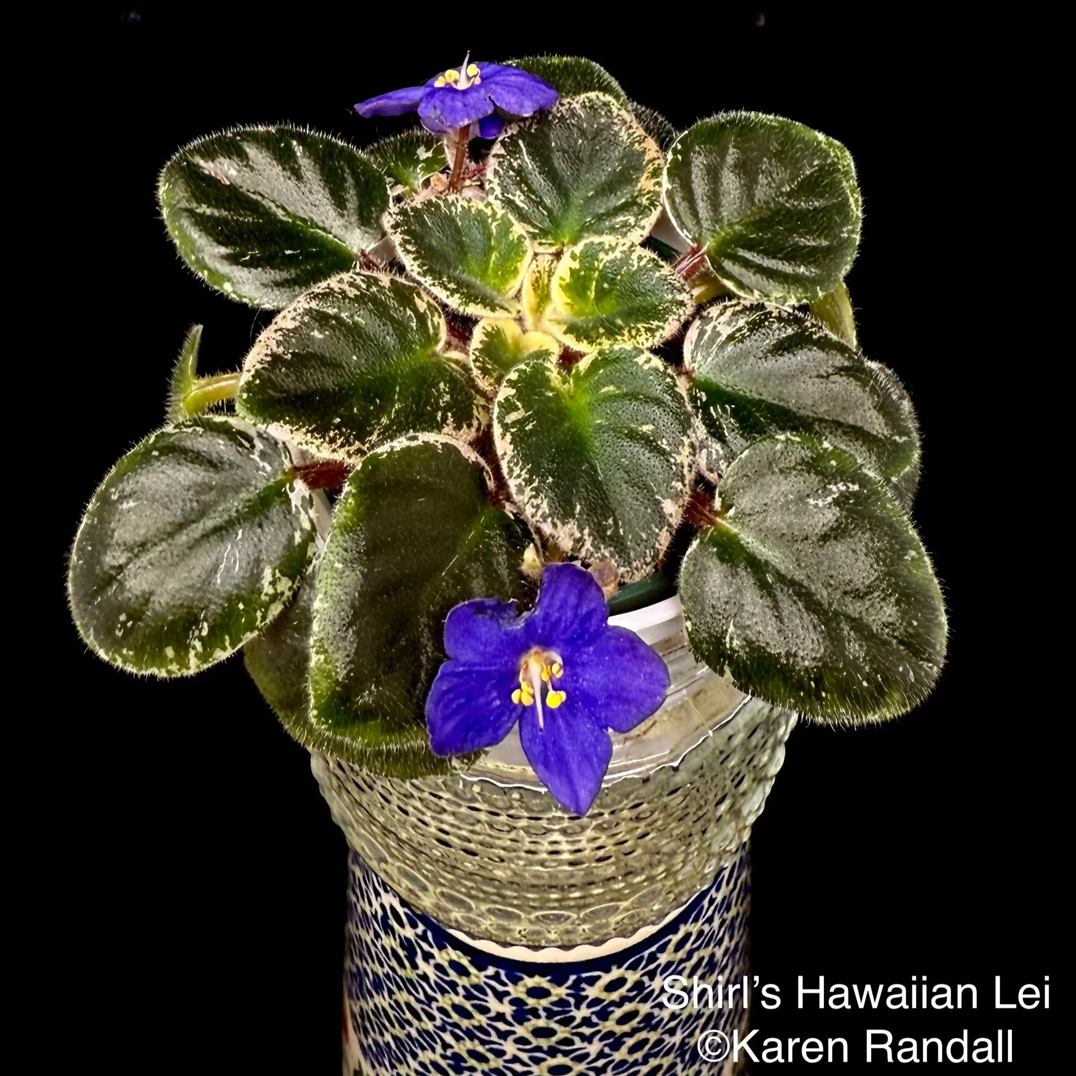 Shirl's Hawaiian Lei (9372) 09/30/2004 (S. Sanders) Single purple pansy/white eye. Variegated medium green and white, heart-shaped. Miniature (TX Hyb) This cultivar is temperature/season sensitive. It will bloom pure white in cool growing conditions.