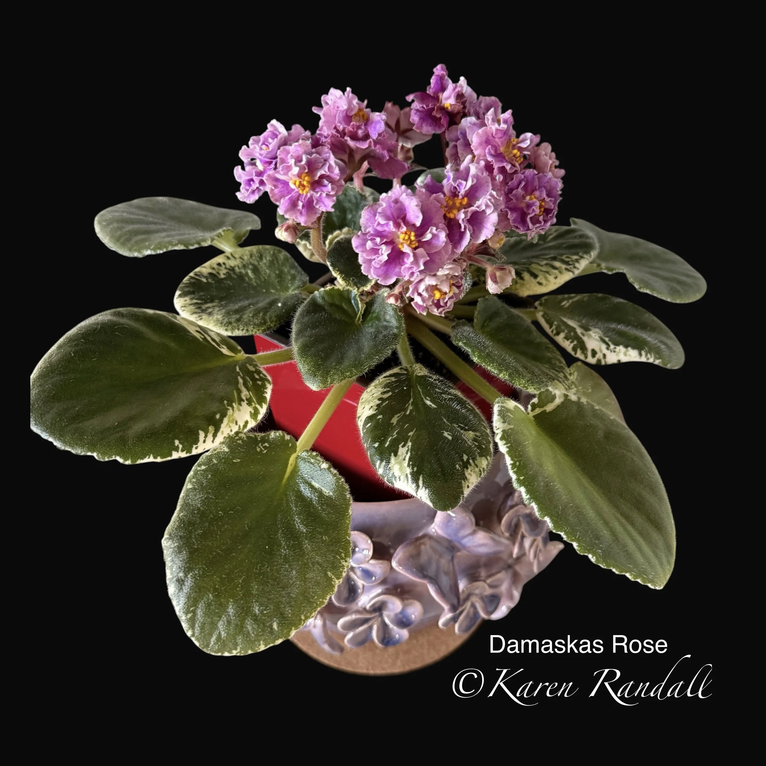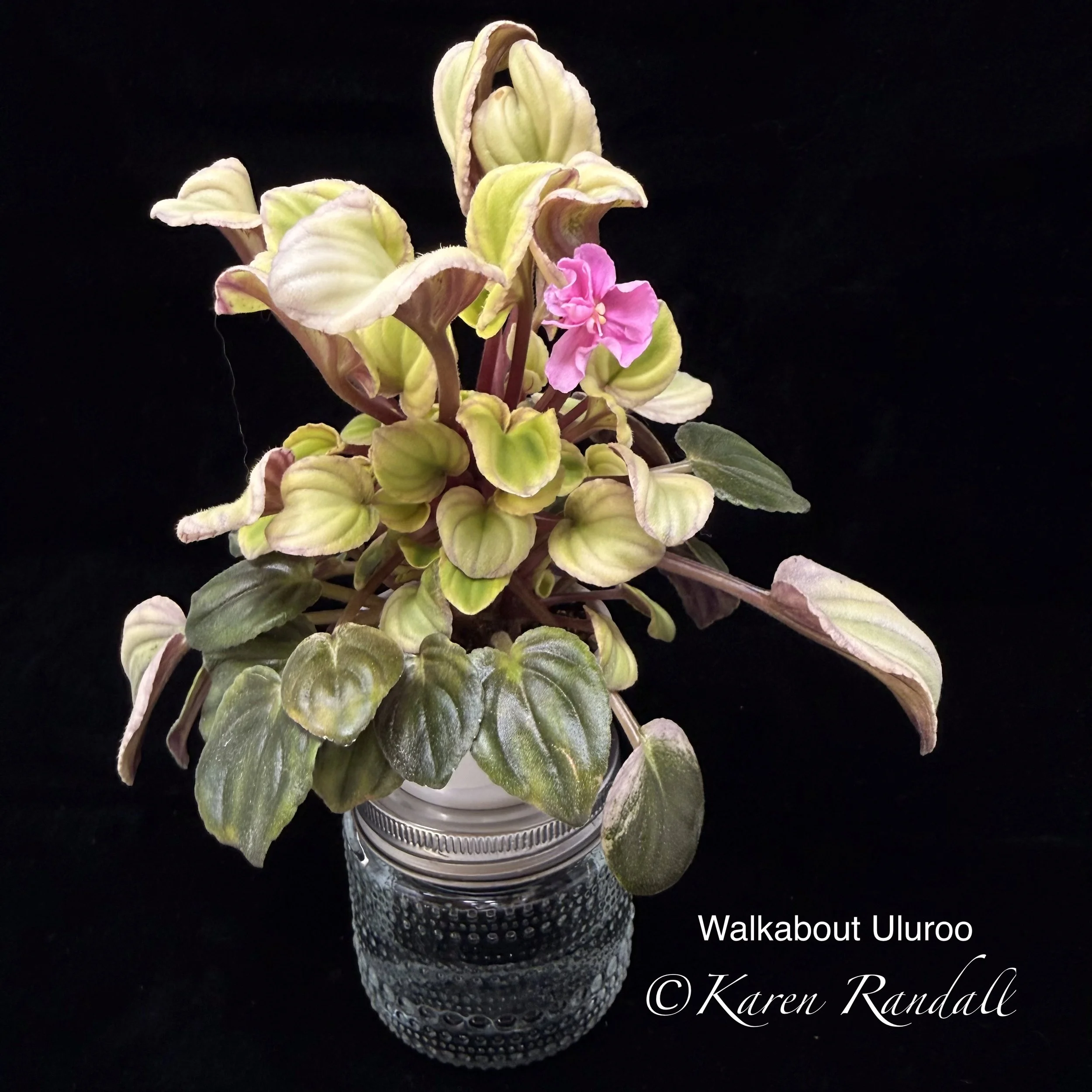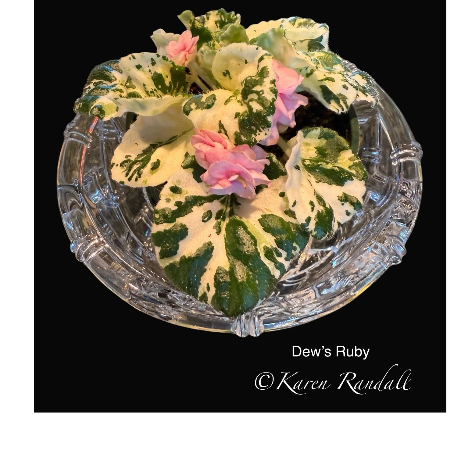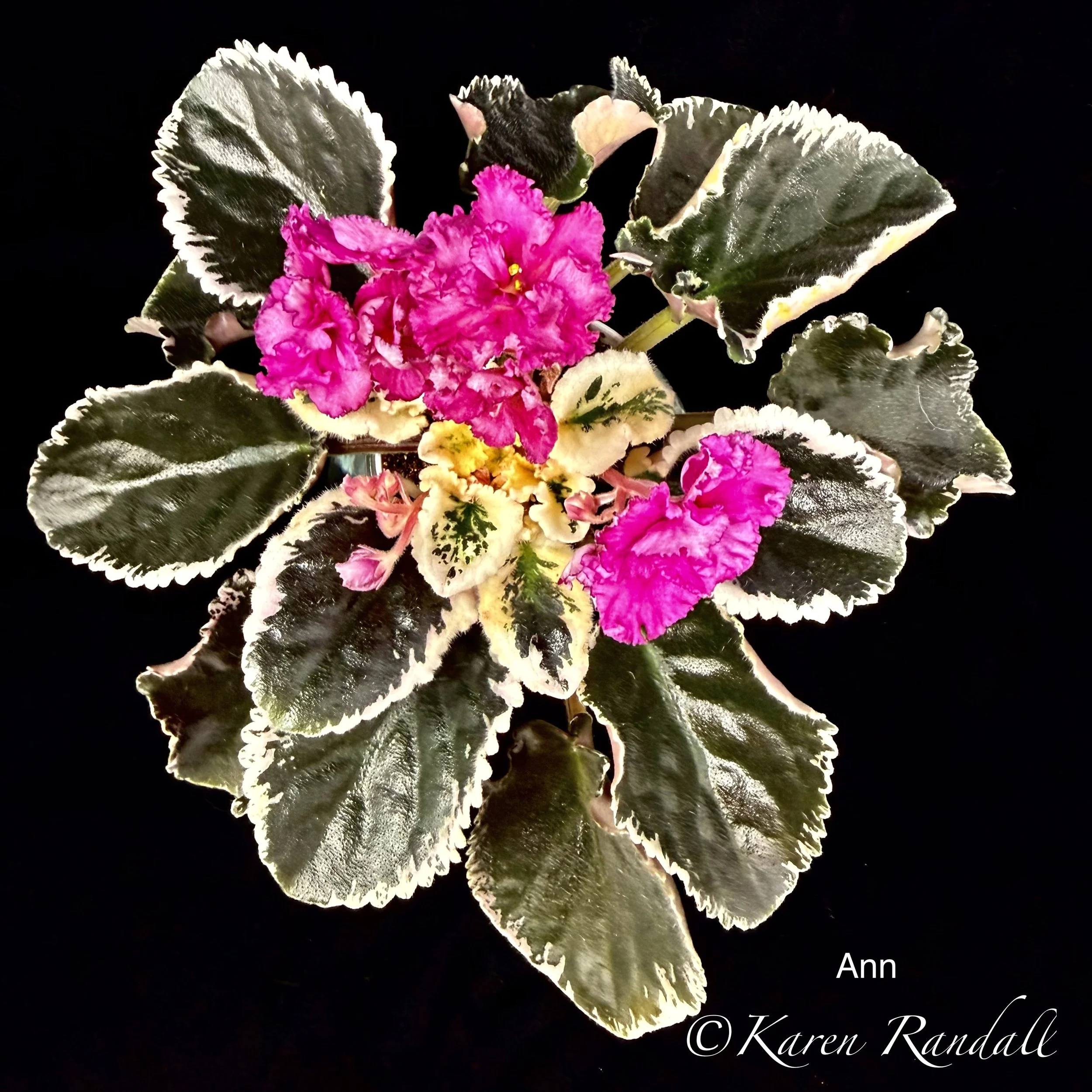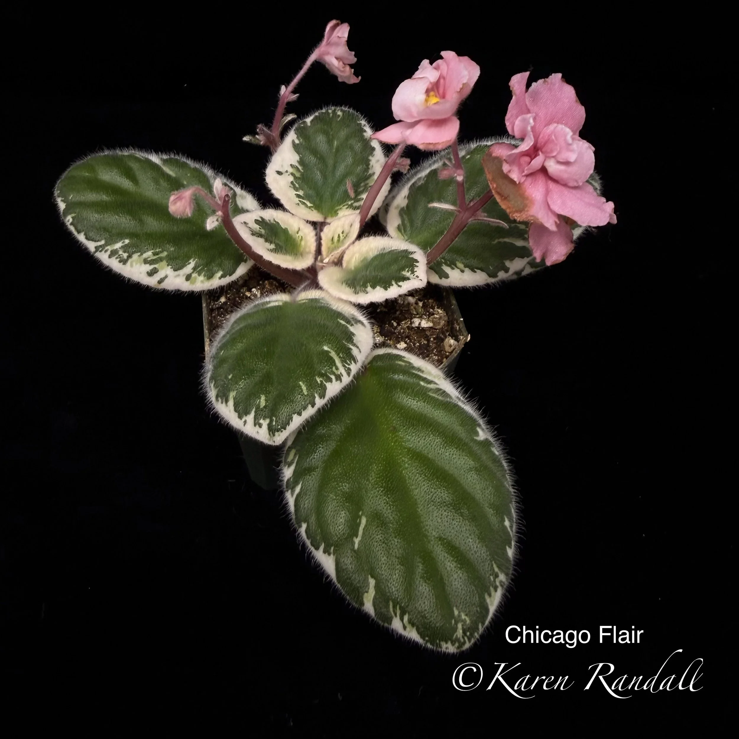 Sdbl. ruffled pink pansies with darker eye, thin white edge. Beautiful, TL variegated foliage. Beautiful showplant. Standard. (Hoover) AVSA #8917