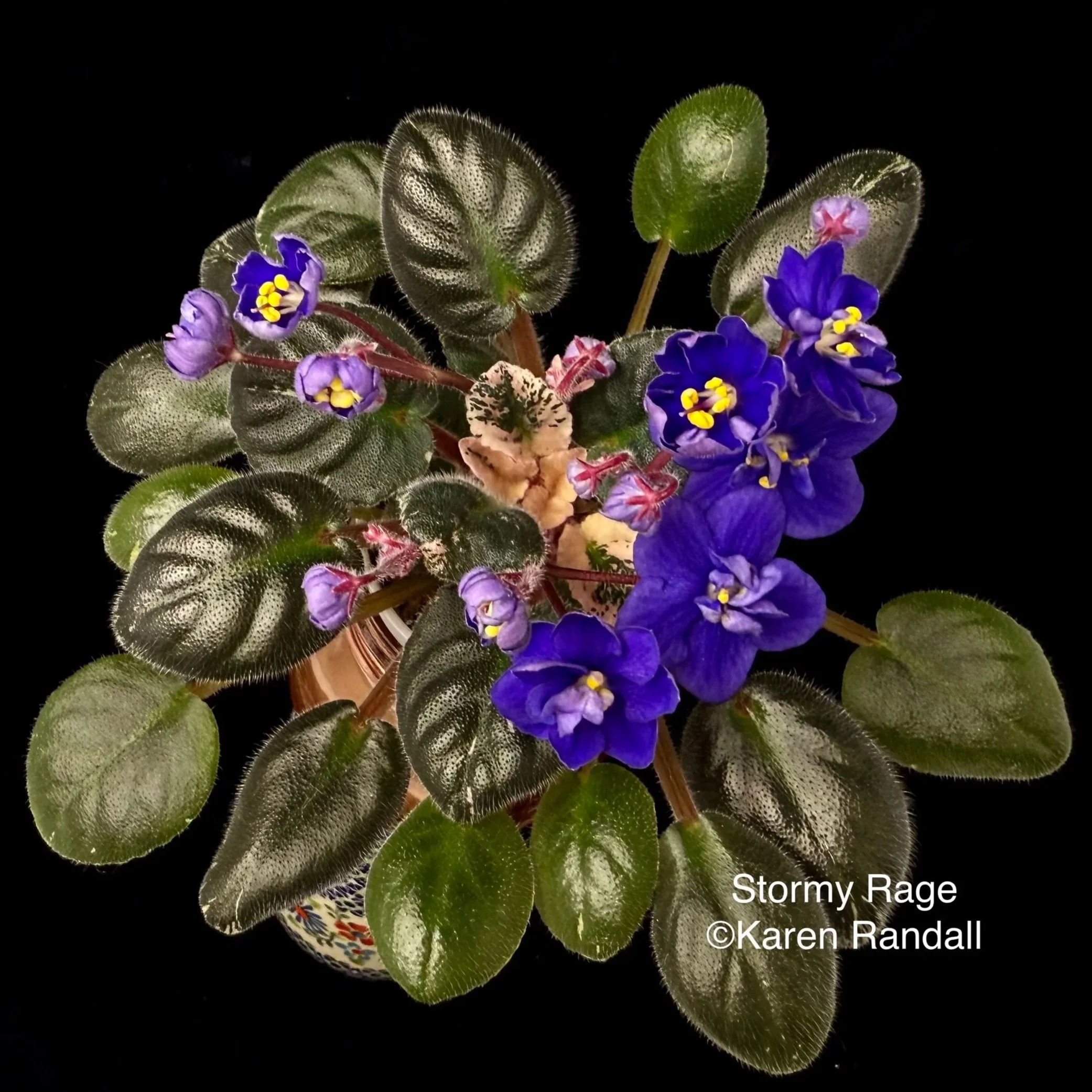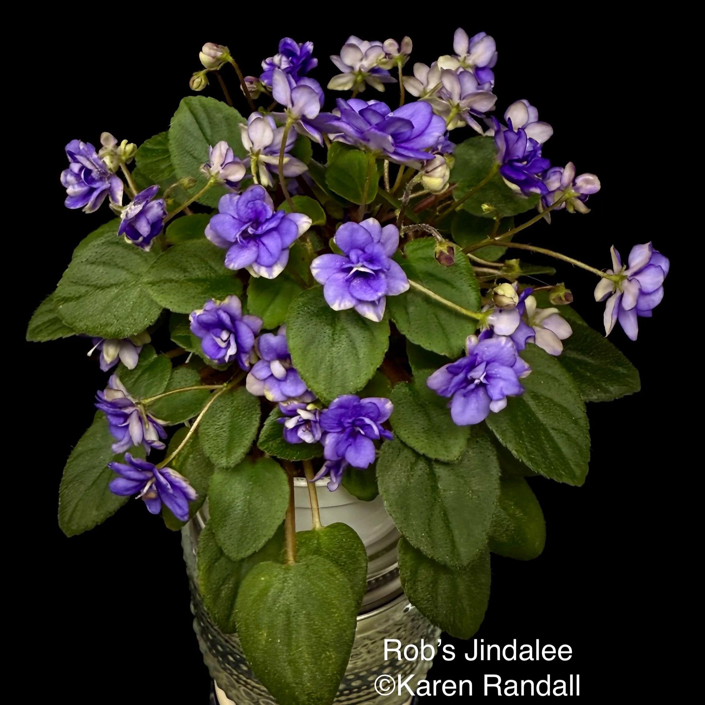 Double, medium to dark blue sticktite pansy with variable white mottled tips. Medium green, pointed, serrated. Semiminiature trailer. (R. Robinson) Jan 16, 2018