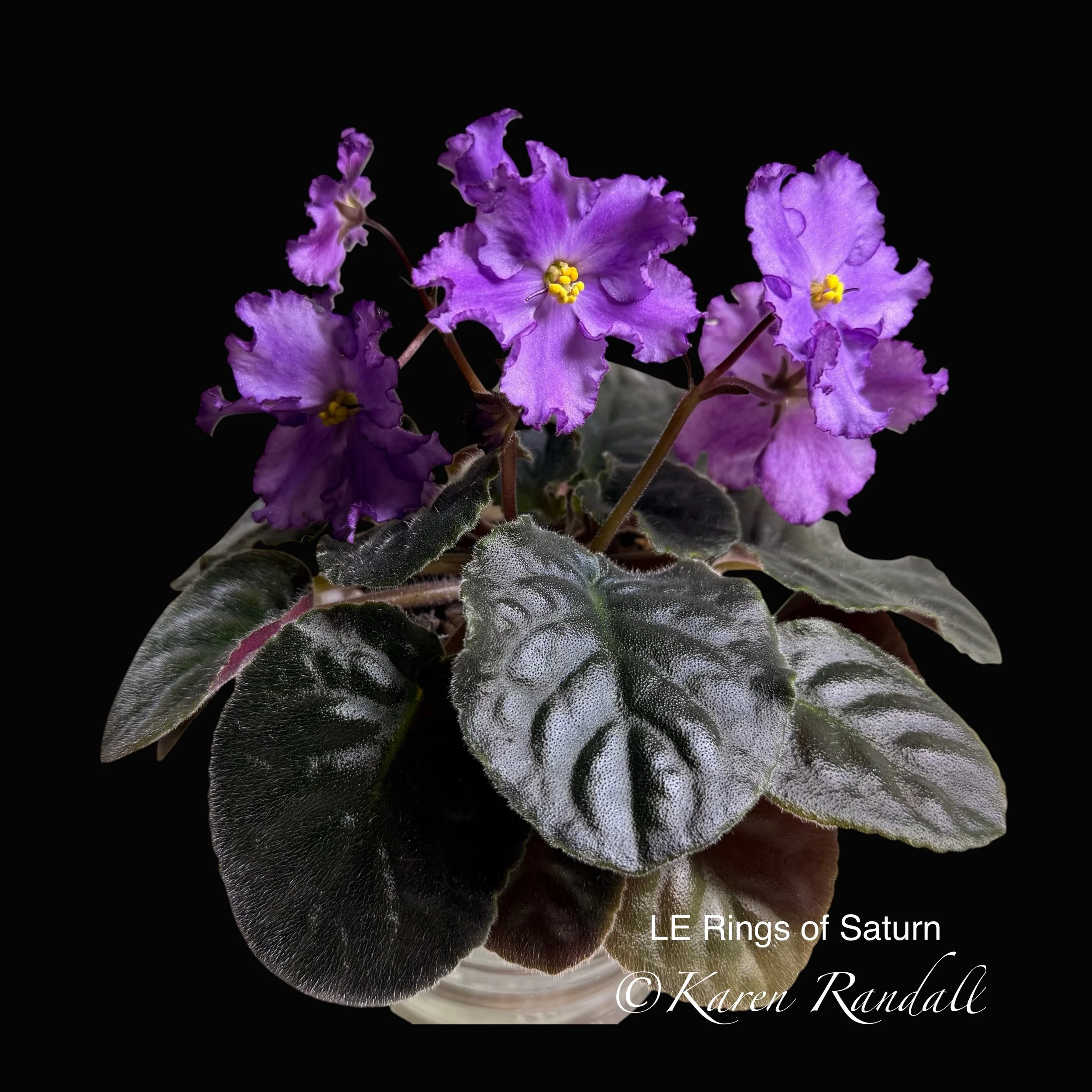 (LLG/P.Sorano) (9526) 12/17/2005 Purple, single stars, with heavily fluted edges. A great bloomer! Blooms have violet-red iridescence on the flower face. The semiminiature foliage is medium green, quilted, and serrated.