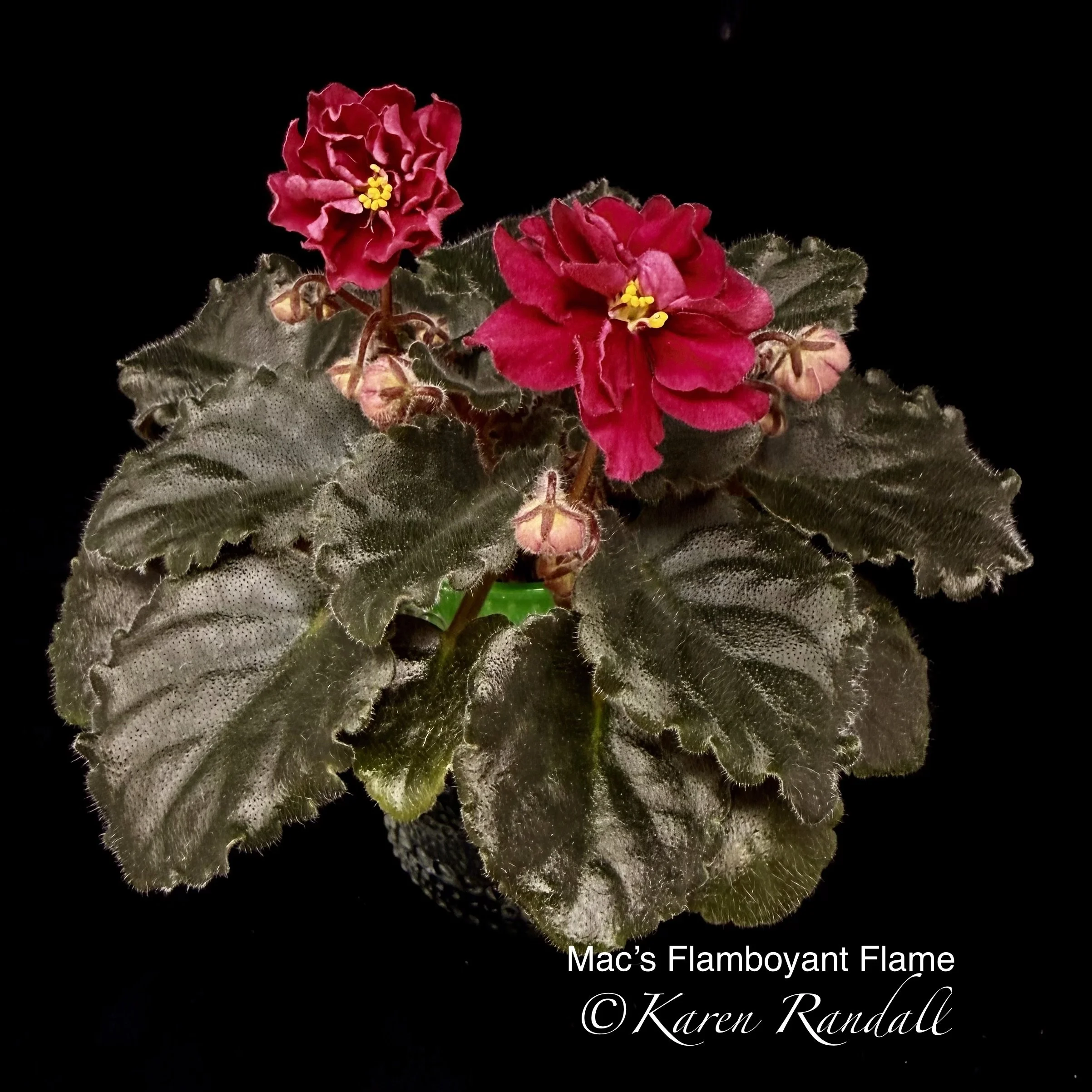 Shockingly deep, almost florescent, coral semidouble blooms. Dark green and gold variegated foliage. Beautiful colors. Semiminiature. AVSA #9129
